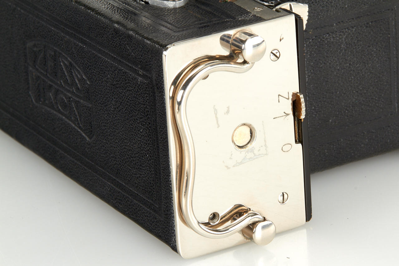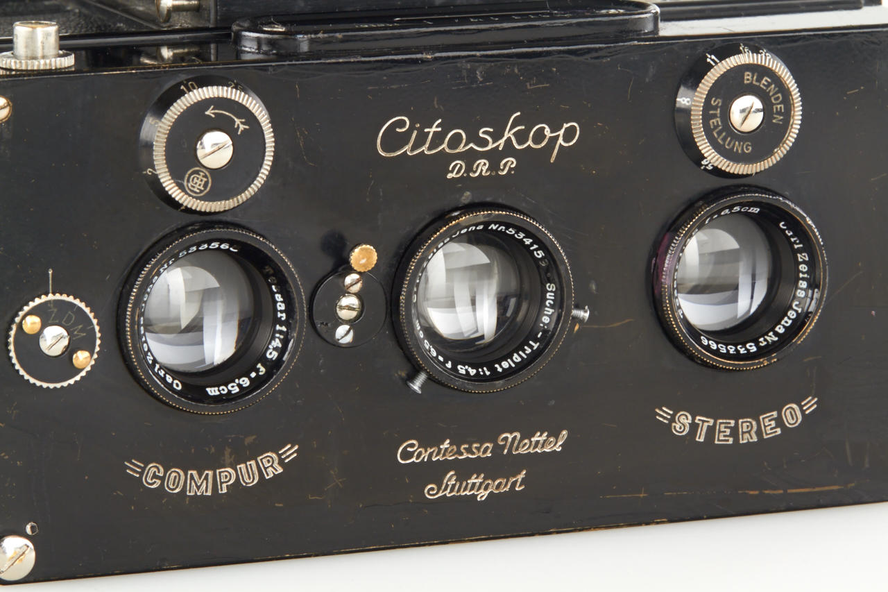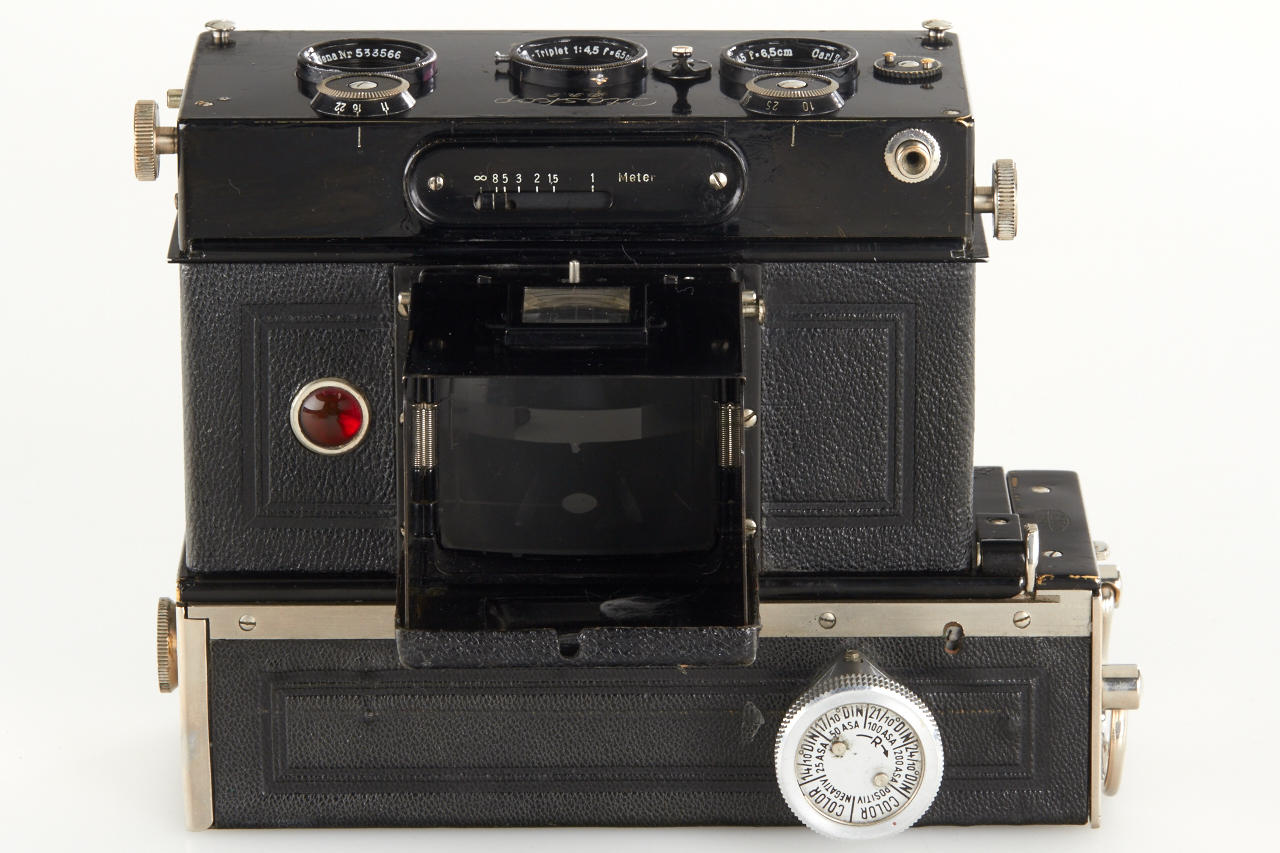 rare Stereo camera for 45x107mm exposures on plates, dual Tessar 4.5/6.5cm lenses nos. 533565/6 in Compur Stereo shutter, with ground glass, 4 film holders, Zeiss Ikon magazine and outfit case