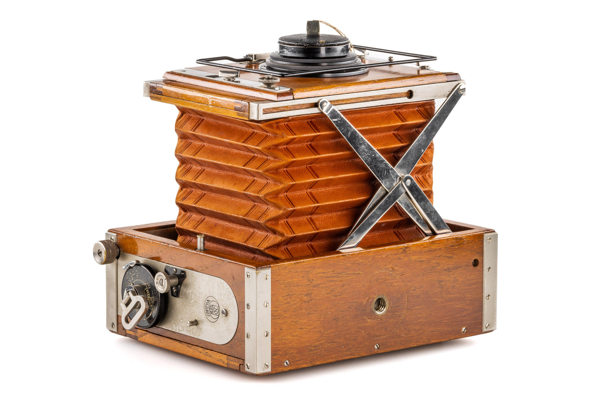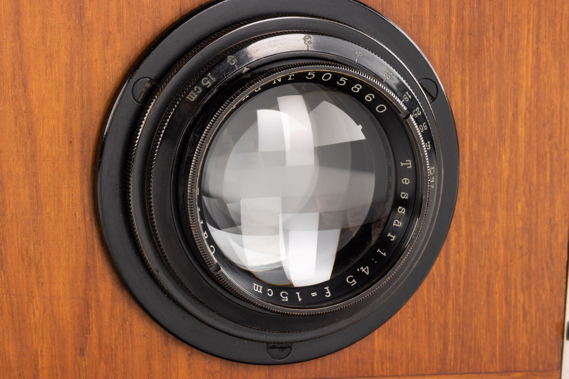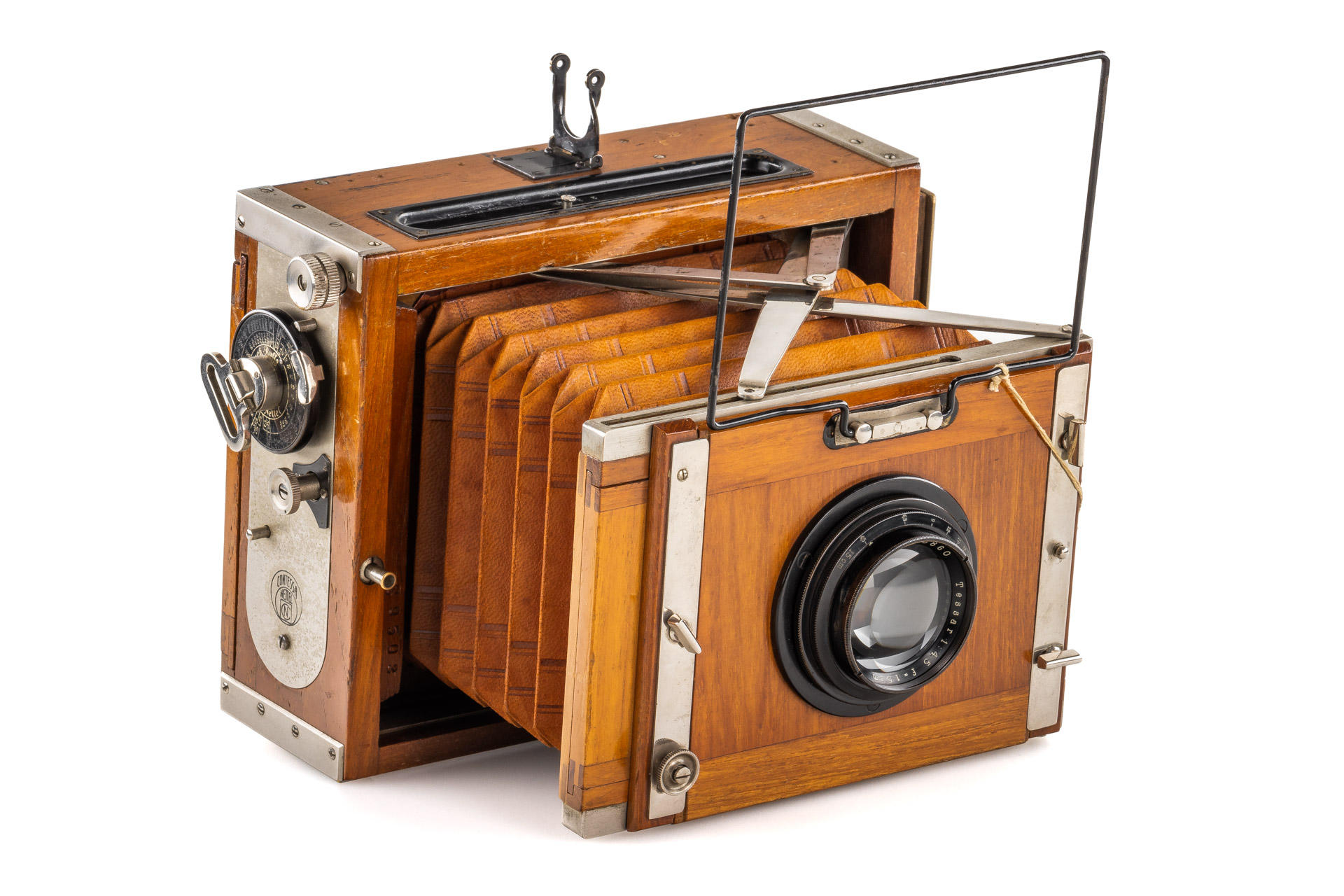 9x12cm Tropical version in very good and original condition (shutter needs attention), original brown bellows, with clean and clear Tessar 4.5/15cm no.505860 (front lens cap), with focusing back and 9x double film plate holders