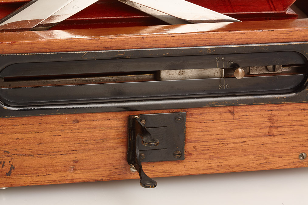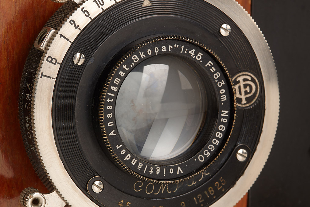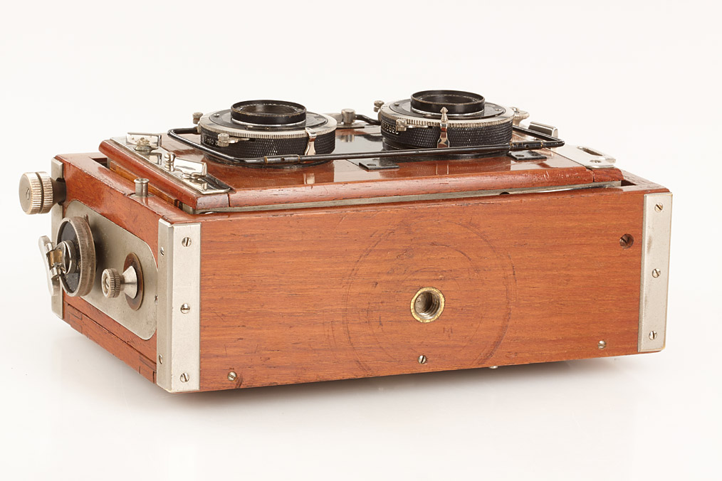 6x13cm, rare tropical stereo camera with focal-plane shutter to 1/1200 (needs service), Skopar 4.5/8.3cm lenses nos.635000/685650 in Compur shutters, brown bellows, frame finder for stereo and panoramic exposures, in excellent condition