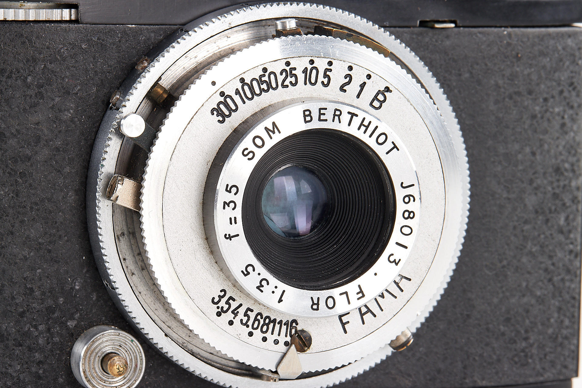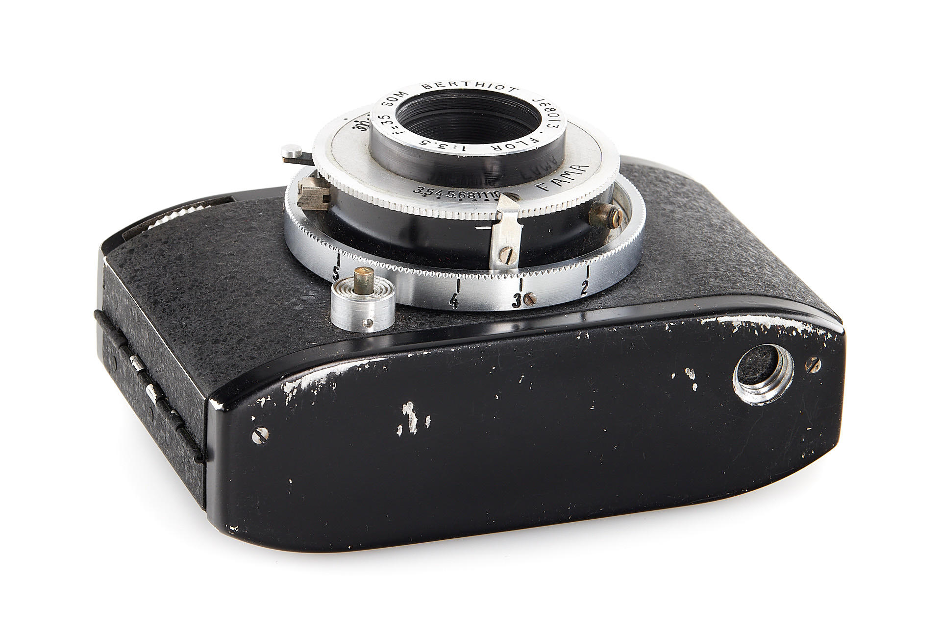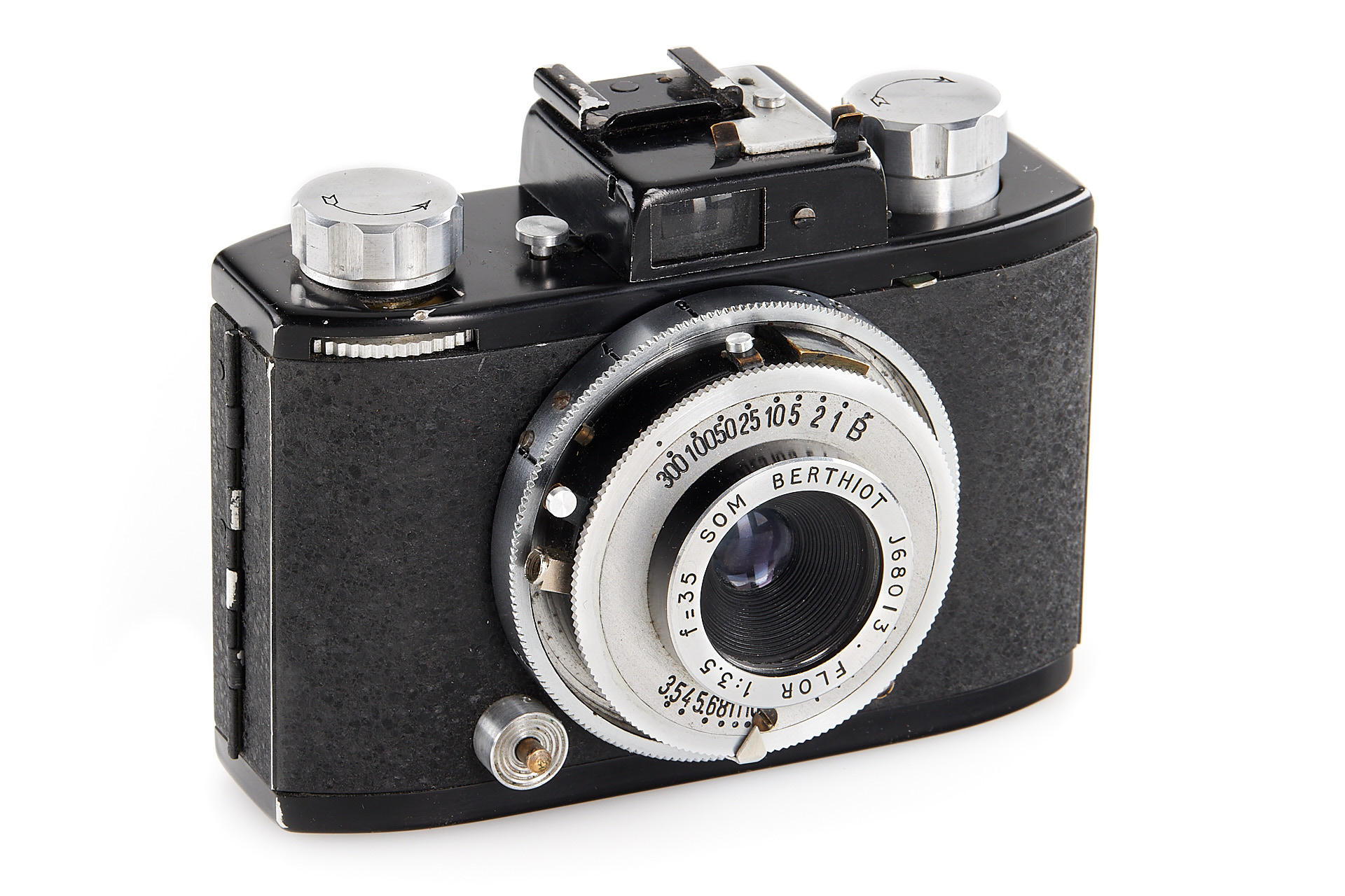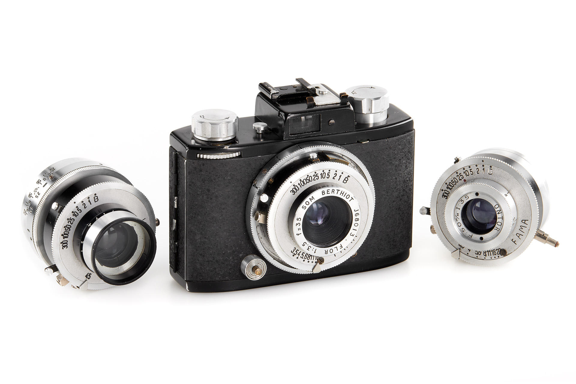 Very rare French black small cast-metal 35mm camera with interchangeable M39 lens shutter mounted, in very good condition, with Som Berthiot Flor 3.5/35mm no.J68013, unnumbered Ontor 3.5/50mm and Télé Ontor 4.5/90mm, with UV filter and leather case