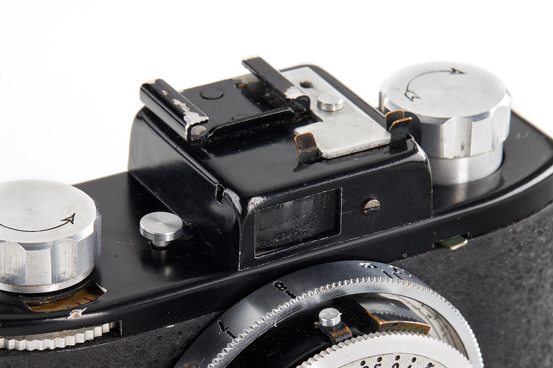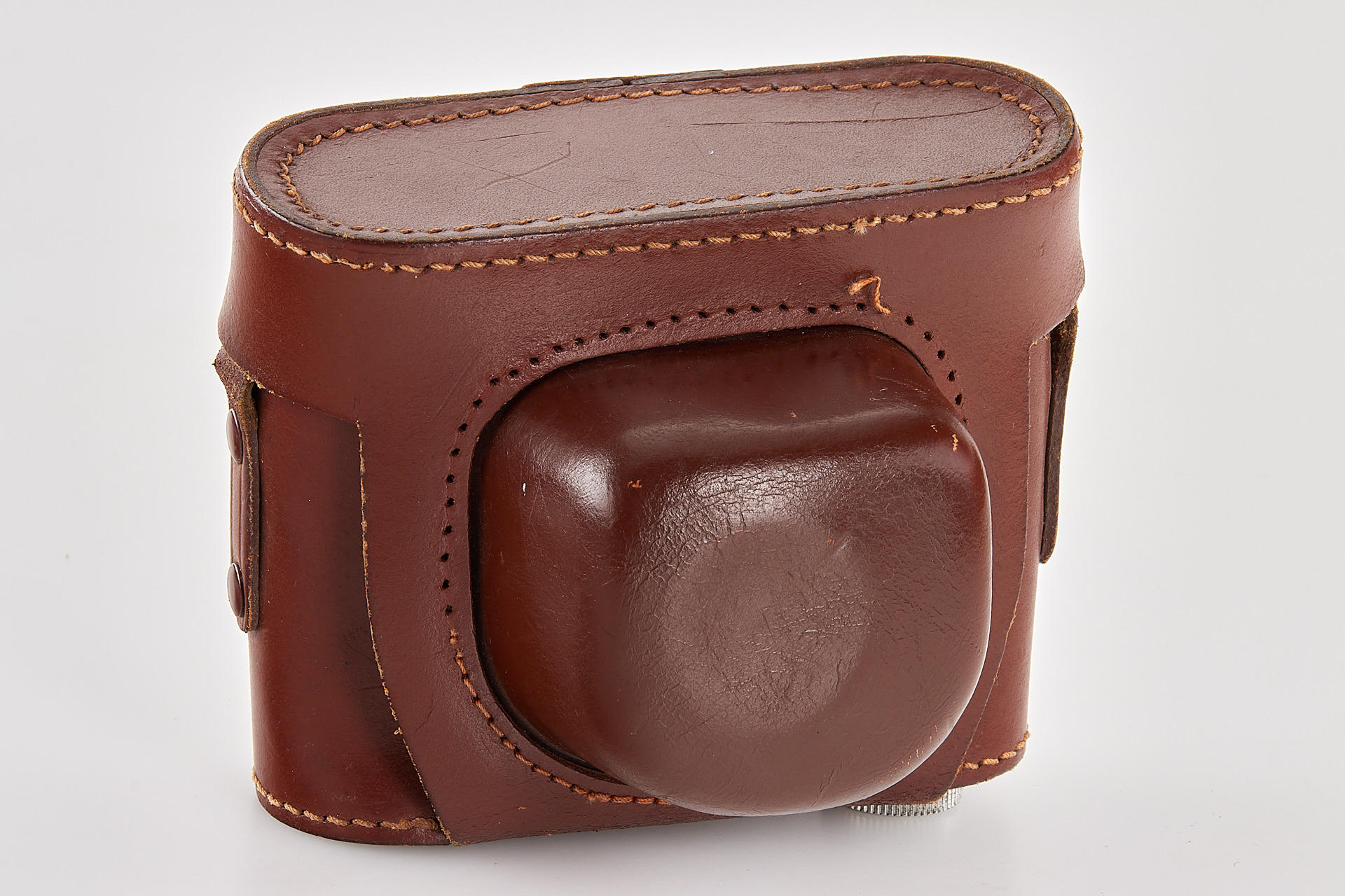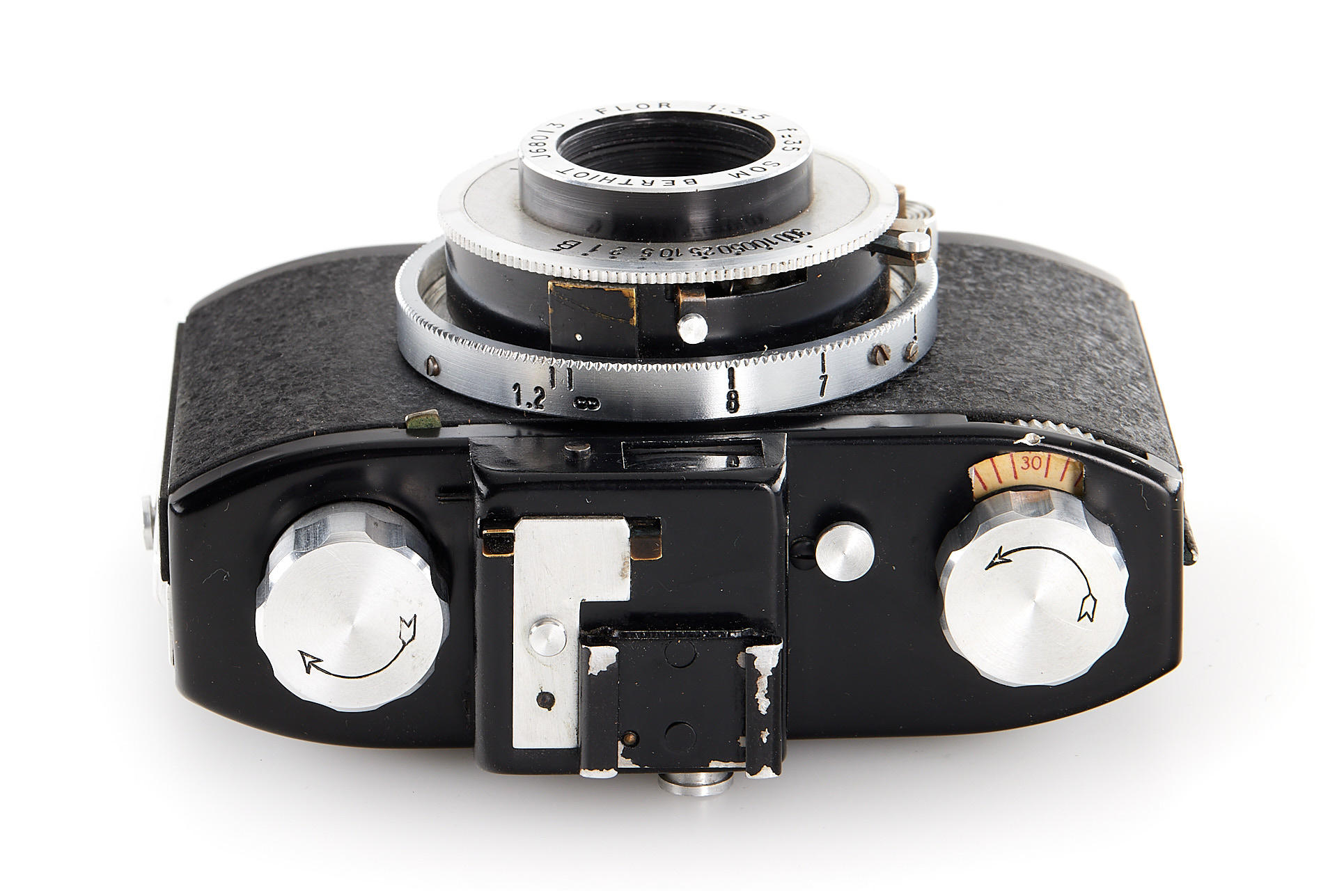 Very rare French black small cast-metal 35mm camera with interchangeable M39 lens shutter mounted, in very good condition, with Som Berthiot Flor 3.5/35mm no.J68013, unnumbered Ontor 3.5/50mm and Télé Ontor 4.5/90mm, with UV filter and leather case