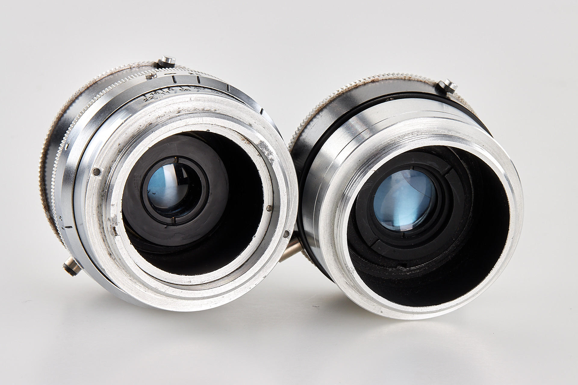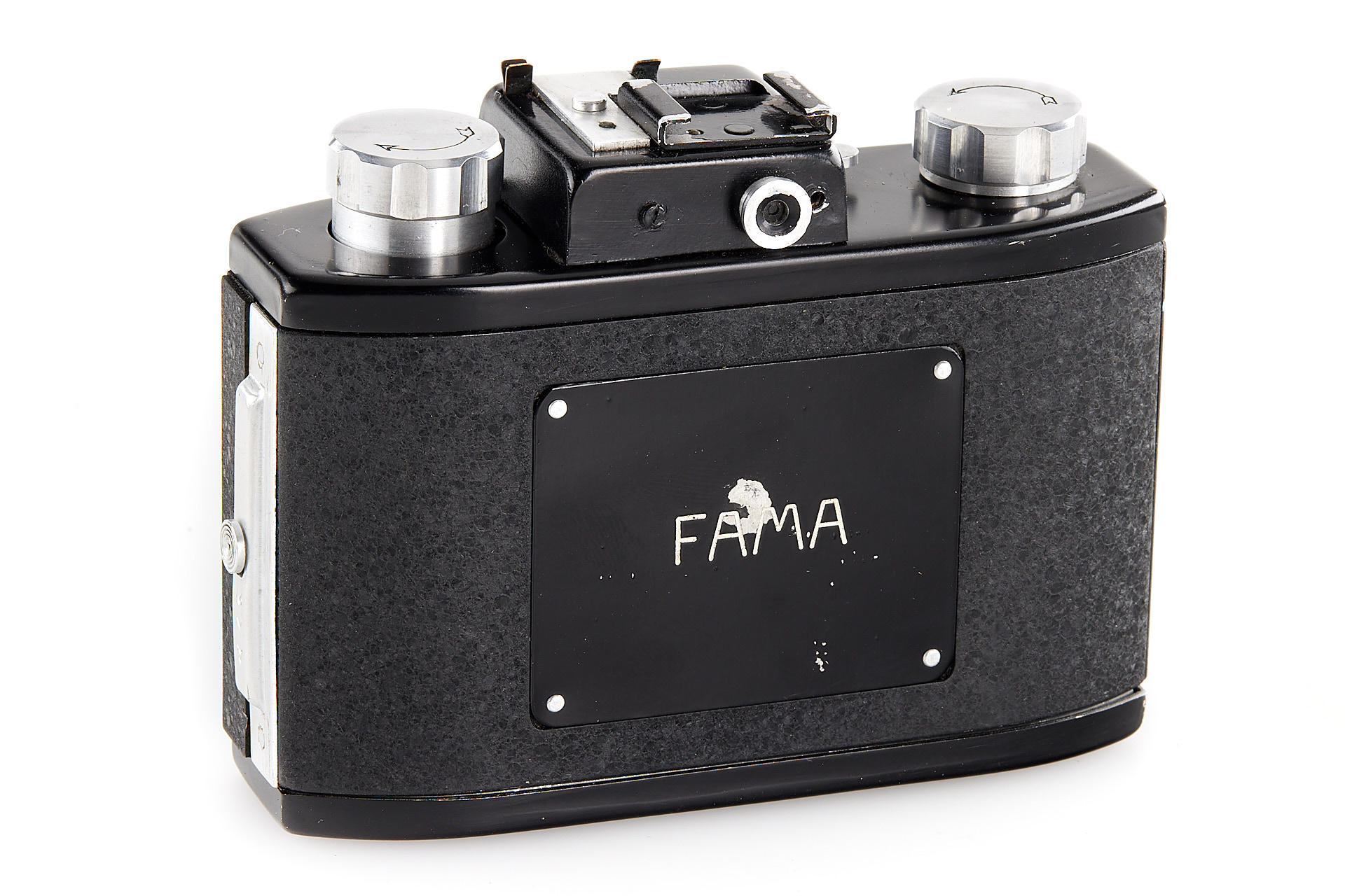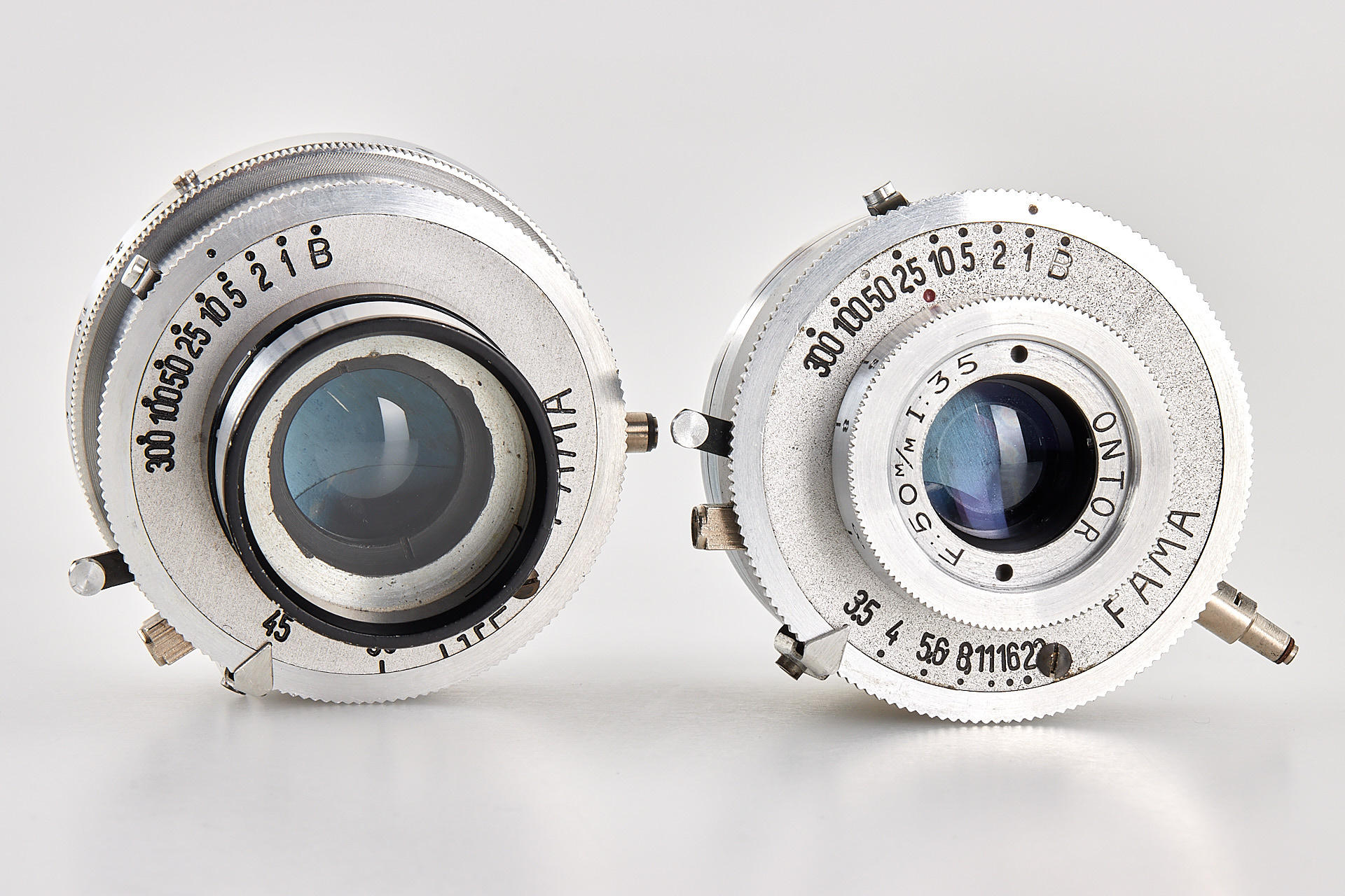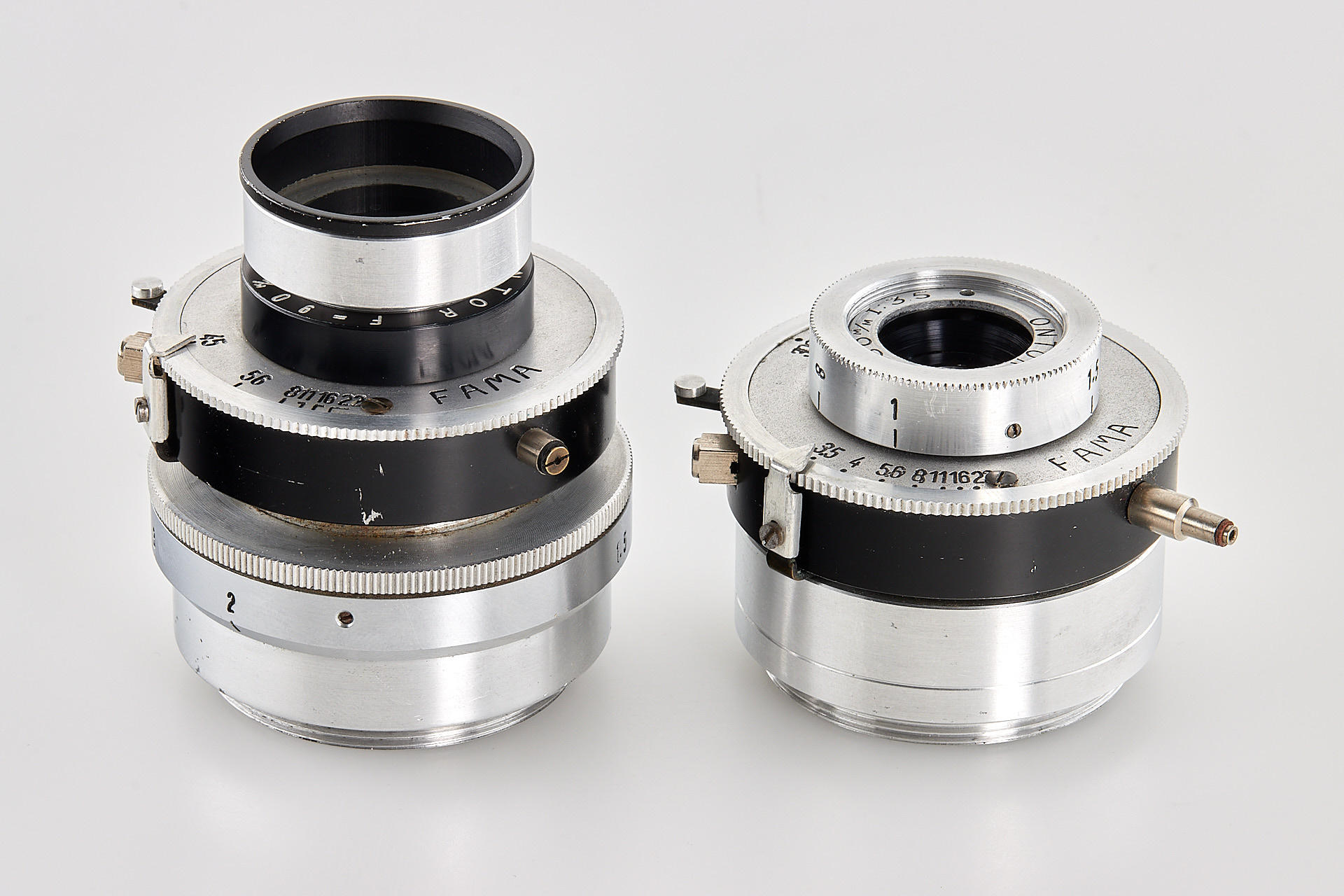 Very rare French black small cast-metal 35mm camera with interchangeable M39 lens shutter mounted, in very good condition, with Som Berthiot Flor 3.5/35mm no.J68013, unnumbered Ontor 3.5/50mm and Télé Ontor 4.5/90mm, with UV filter and leather case