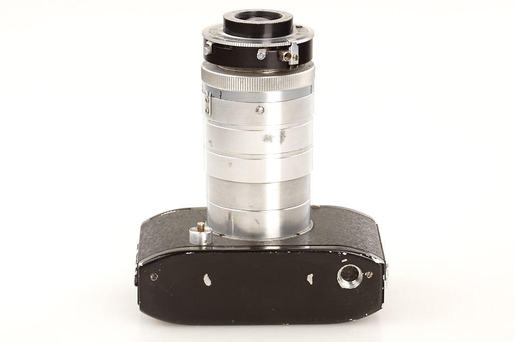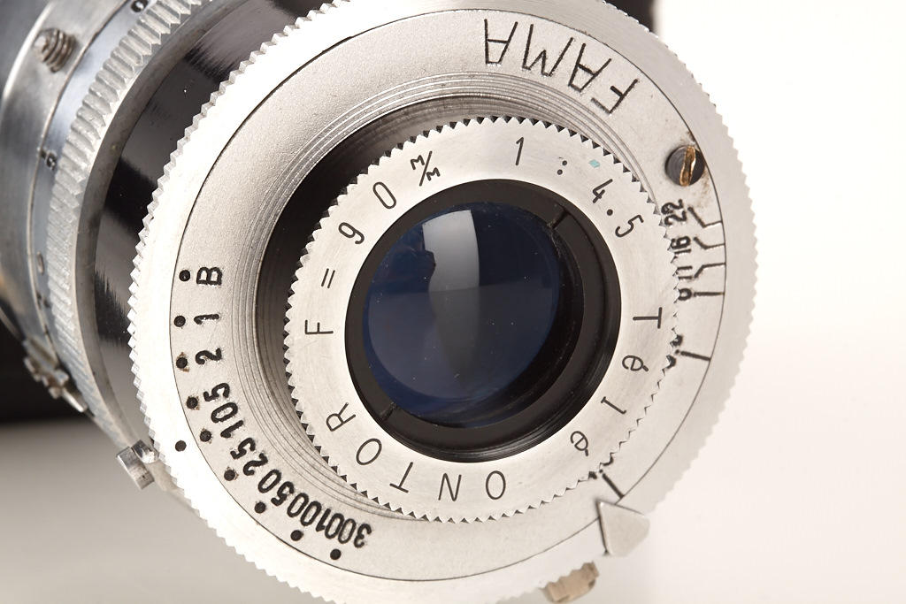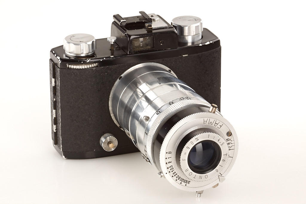 very rare French 35mm camera with interchangeable uncoupled M39 screw mount lens Tèlè ONTOR 4.5/90mm in FAMA shutter, black painted body (partly repainted), built-in finder mask, hood, filter set in original metal container