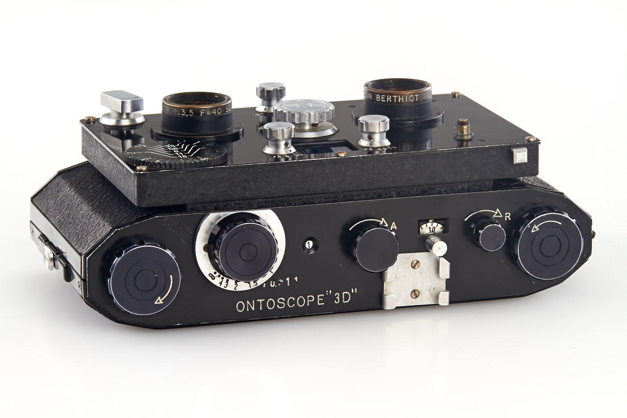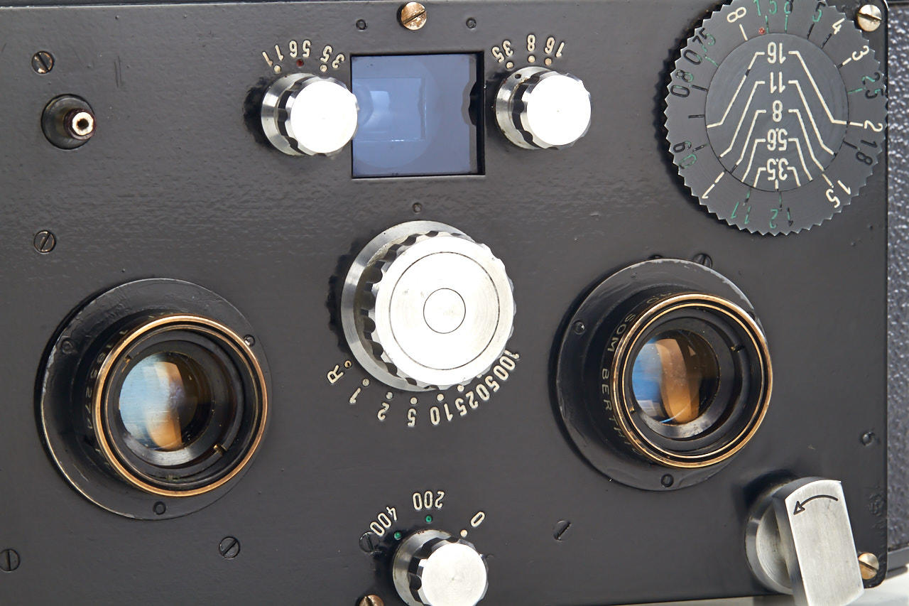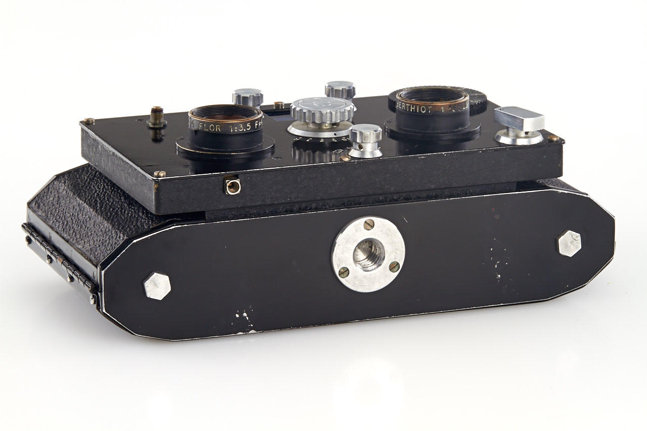 a very rare stereo camera for 24x30 frames on 35mm film, Flor 3.5/40mm lenses, cast metal body, in very good original condition