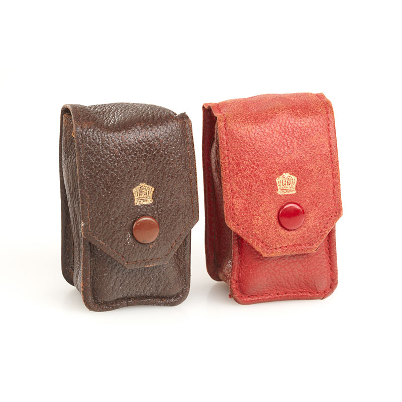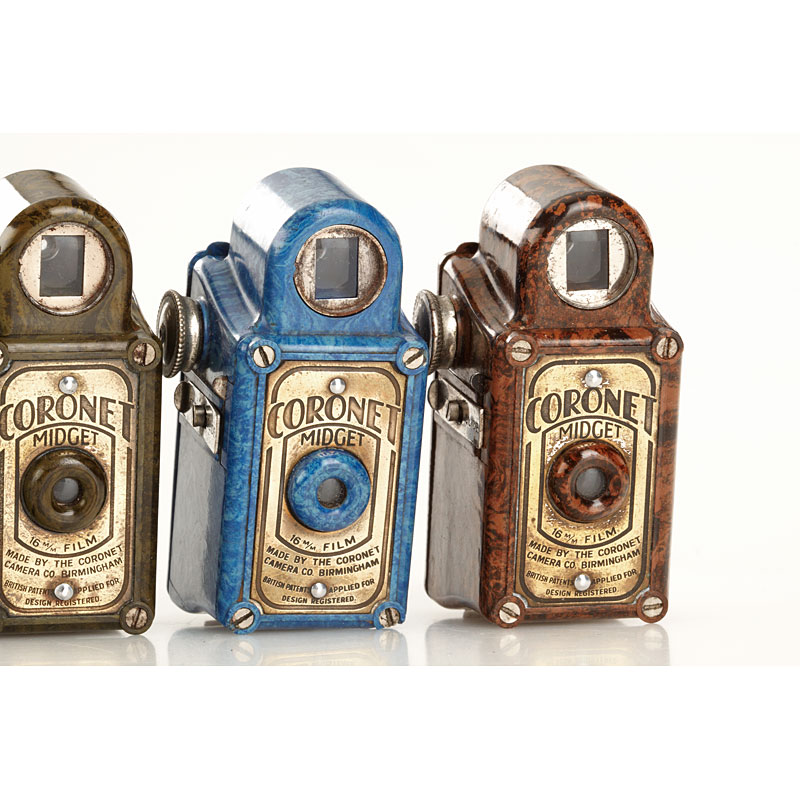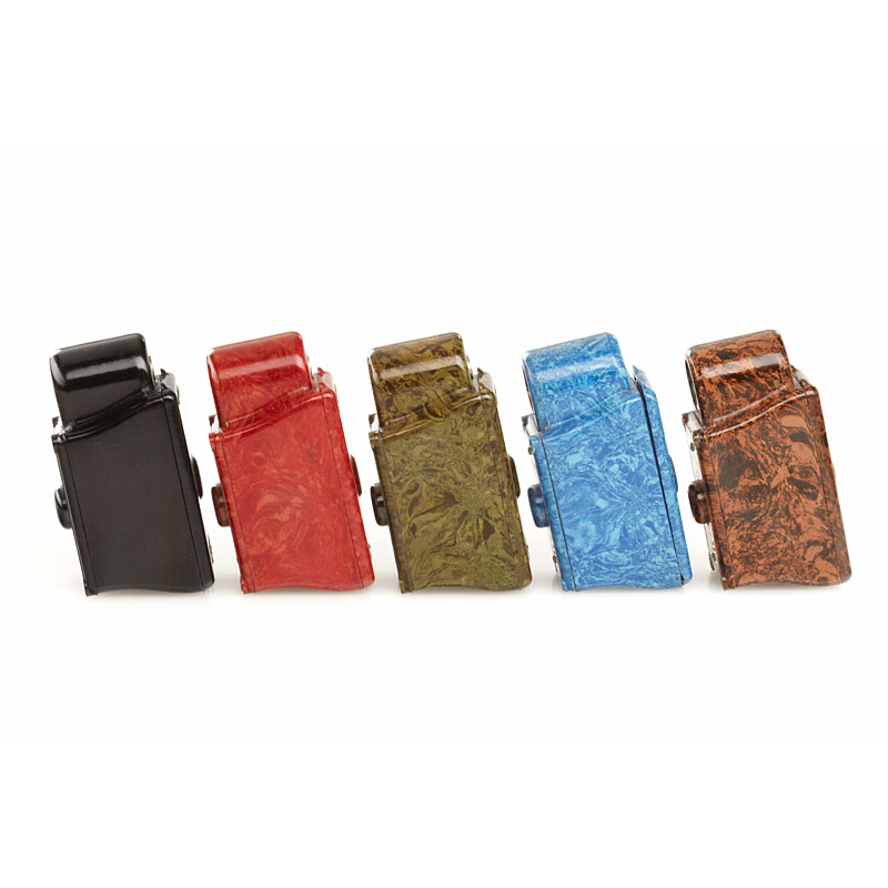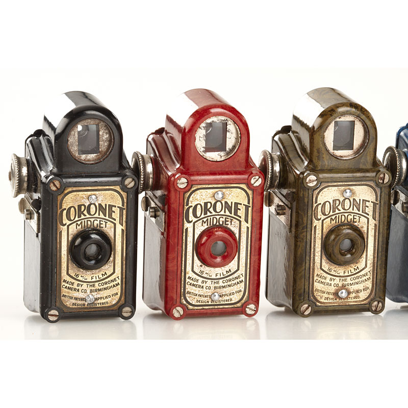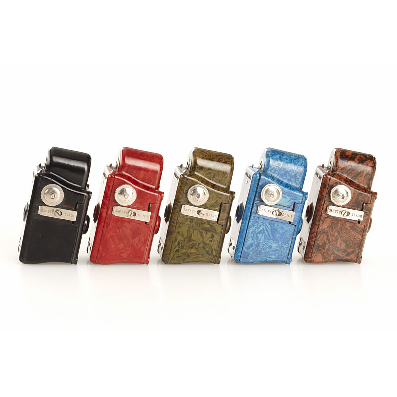 5 different versions in (1) red (case), (2) brown (case), (3) green, (4) black and (5) the very rare blue of this classic 16mm bakelite camera in nice condition, no chips or cracks (5)