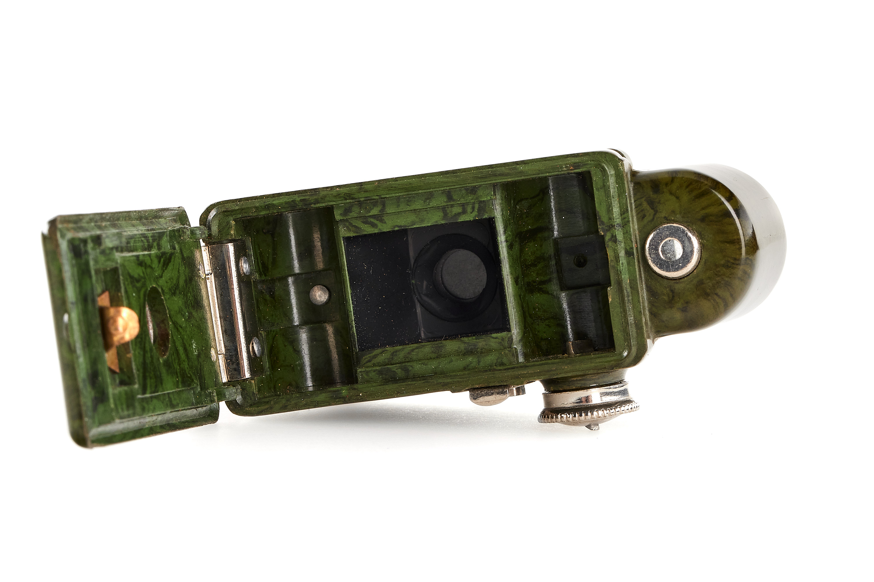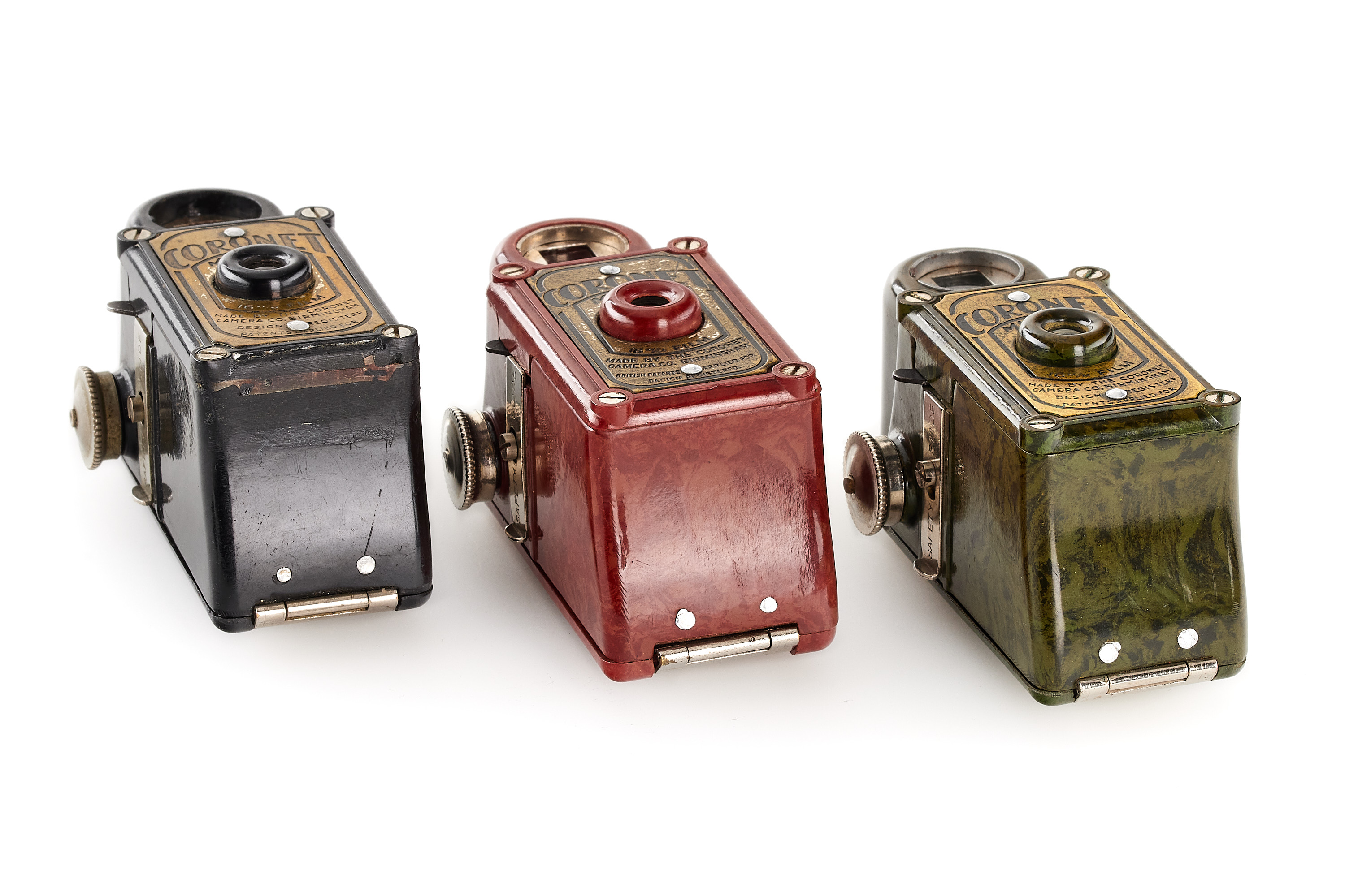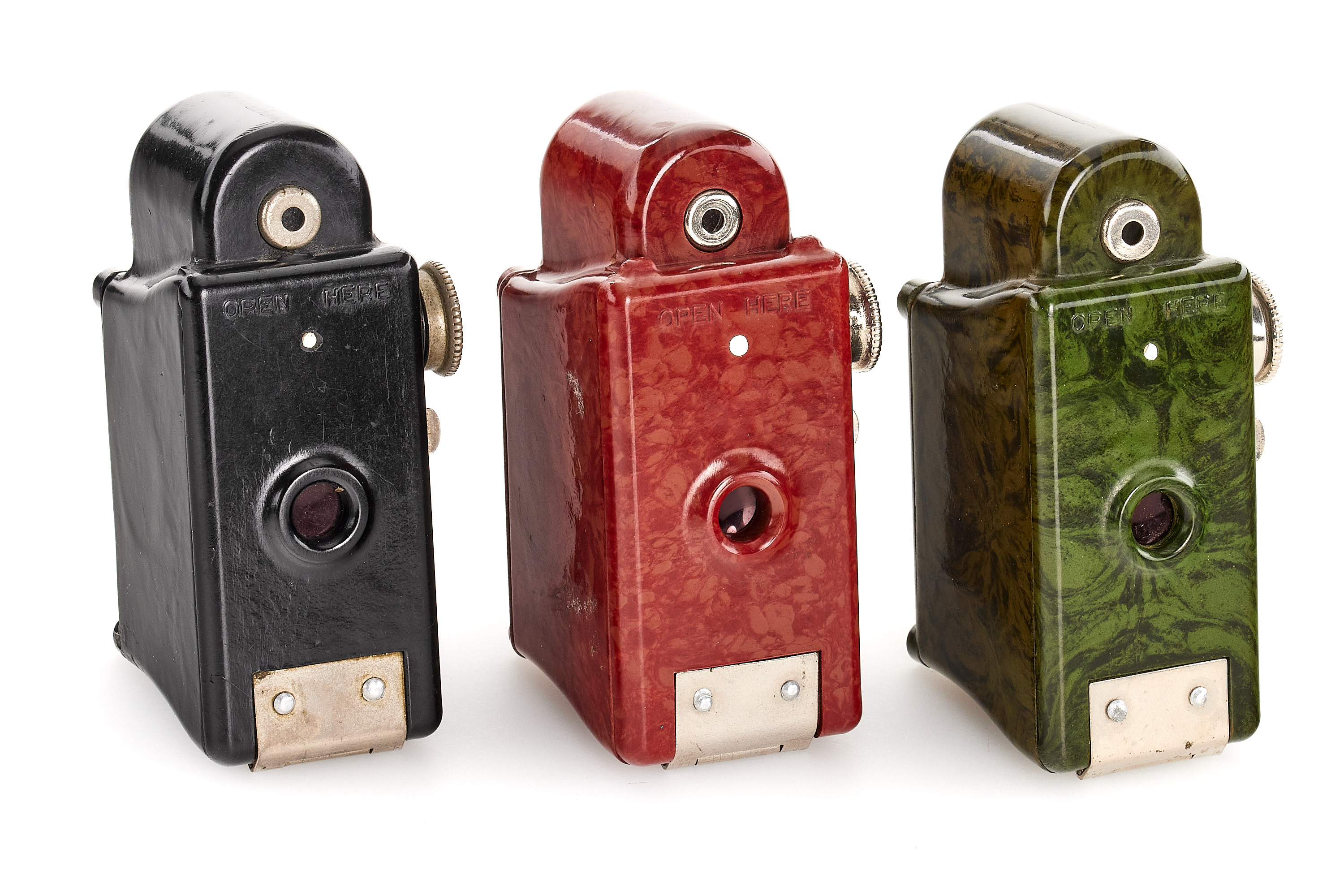 Set of 3 classic 16mm Bakelite miniature cameras with Taylor Hobson Meniscus lens aperture f:10, all in very good condition and working order, black, green and red versions.