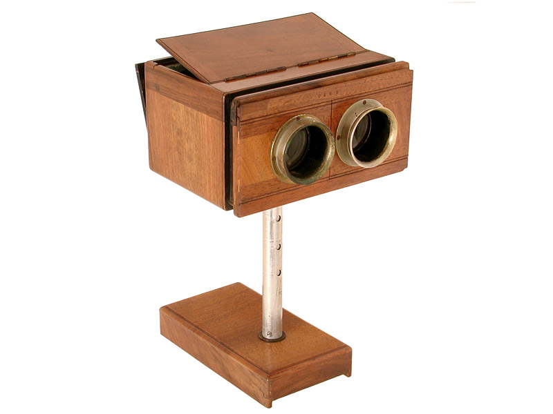 8x17cm, walnut, focusing eyepieces, metal stand, hinged reflectors, height 31cm