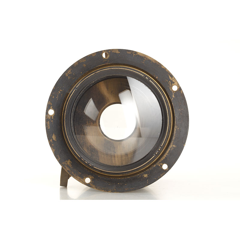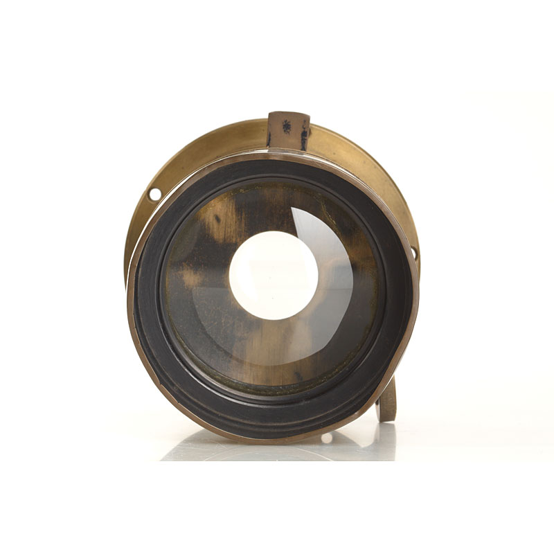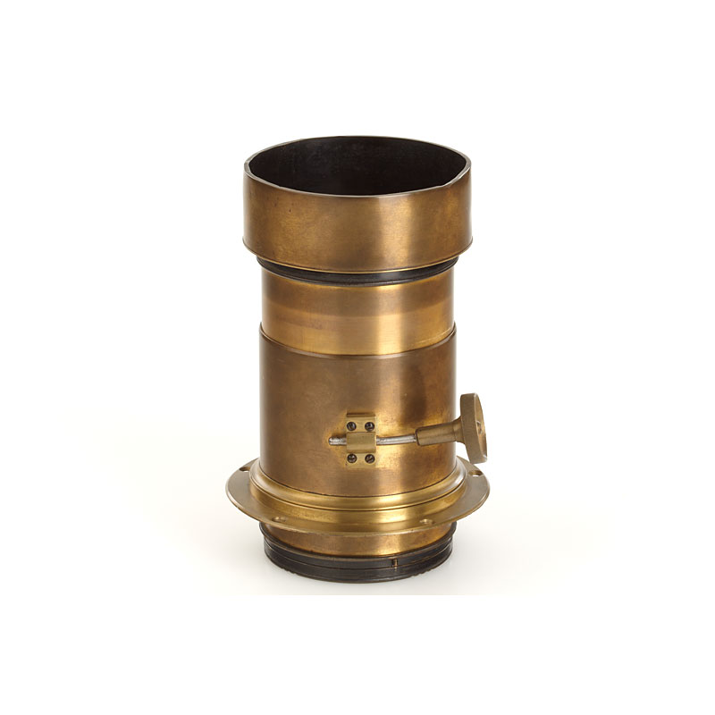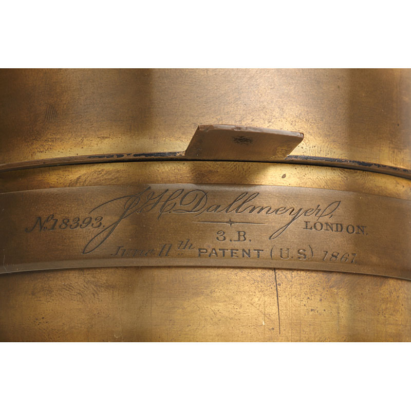 32cm focal length, good optics (few fine scratches on front lens element), rack and pinion focusing (dented but working), barrel engraved 'J.H. Dallmeyer No.18393 3.B. London June 11th Patent (U.S.) 1867', for waterhouse stops (one included), lens diameter c.9cm, total height incl. hood 21cm, mounting ring, the rear lens element can be adjusted to soften the image