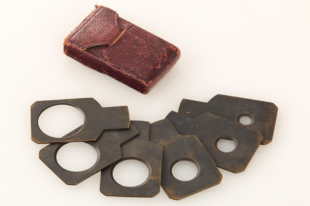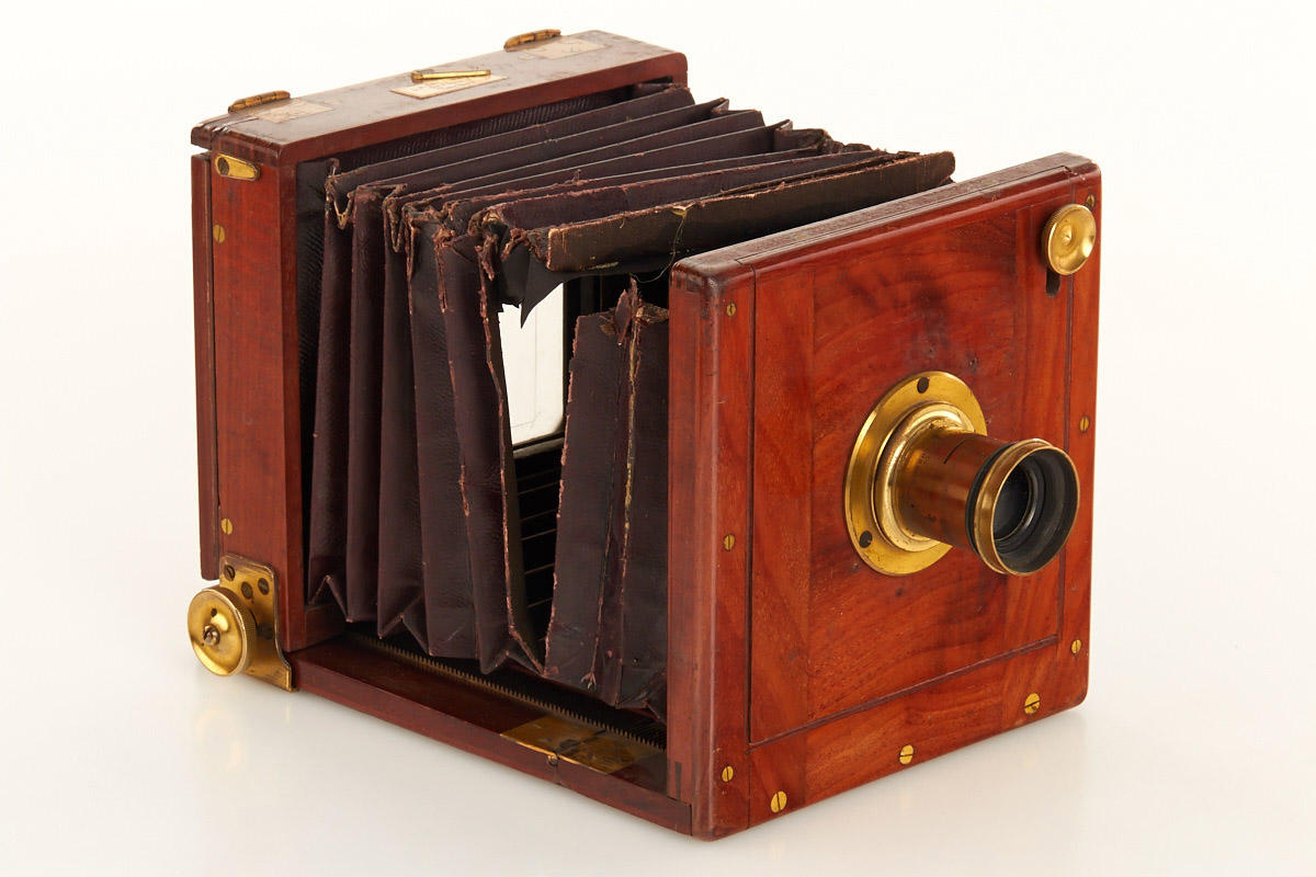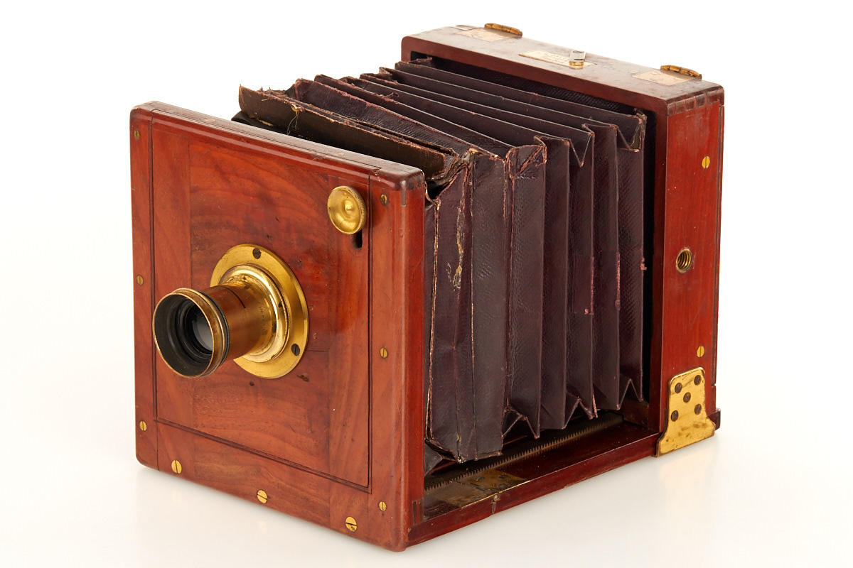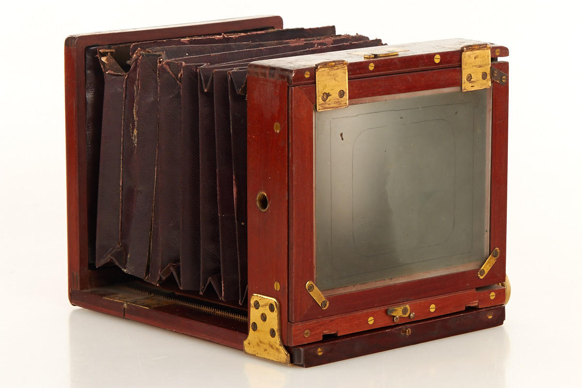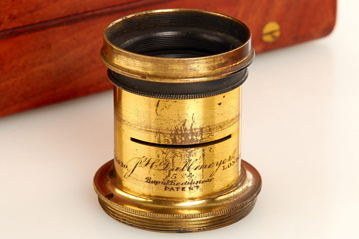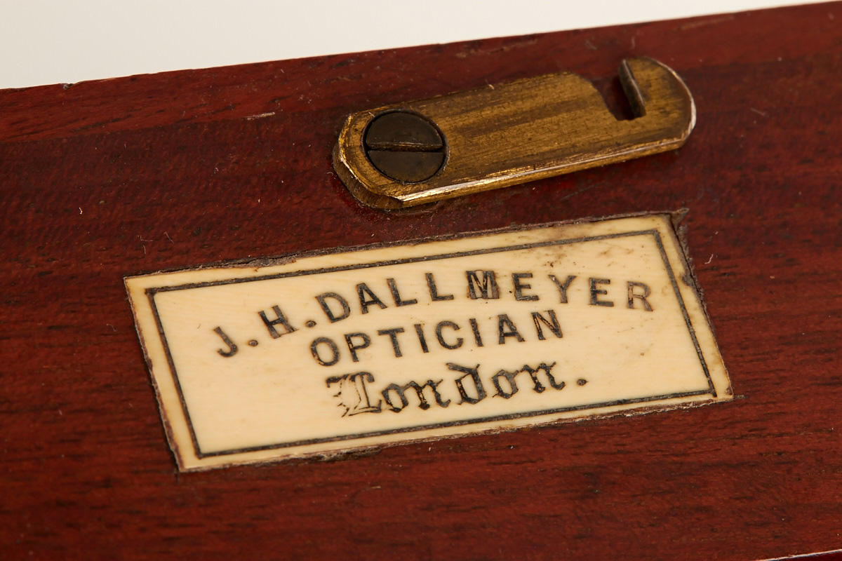 mahogany body in good condition with complete brass hardware, maker's plaque 'J.H.DALLMEYER OPTICIAN London', red leather bellows (torn), Dallmeyer Rapid Rectilinear 5x4 brass lens no.24420 (clean lenses, complete set of 6 Waterhouse stops with matching number in case), 2 mahogany film holders with matching number