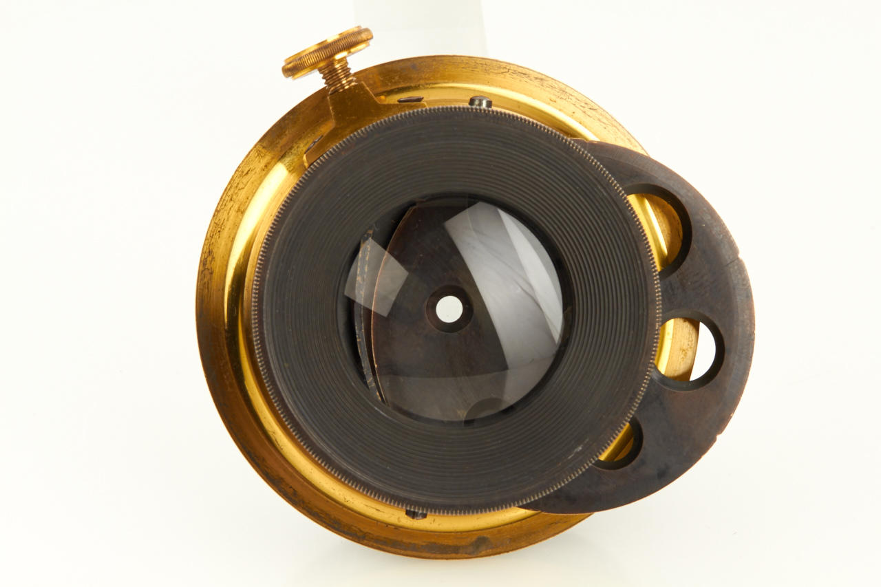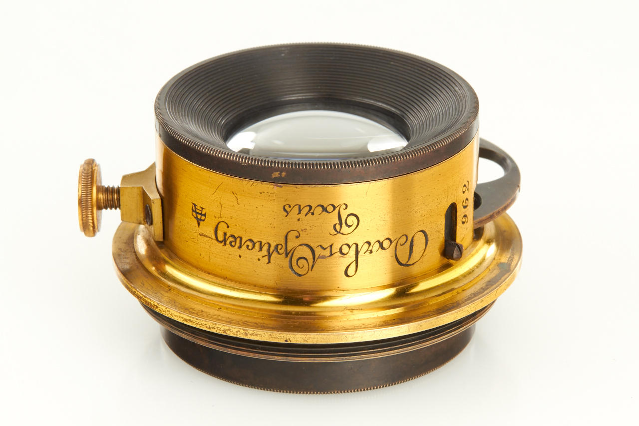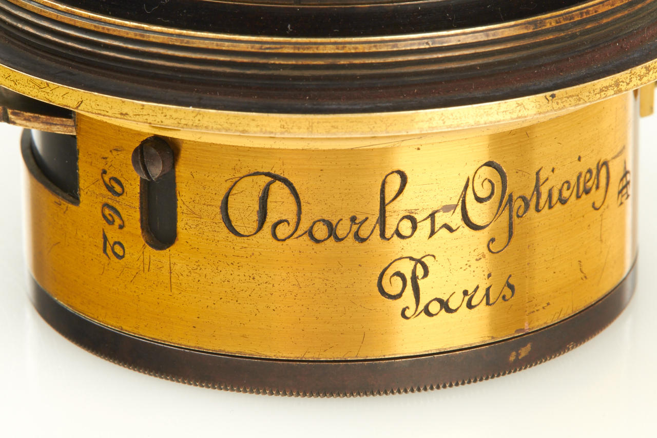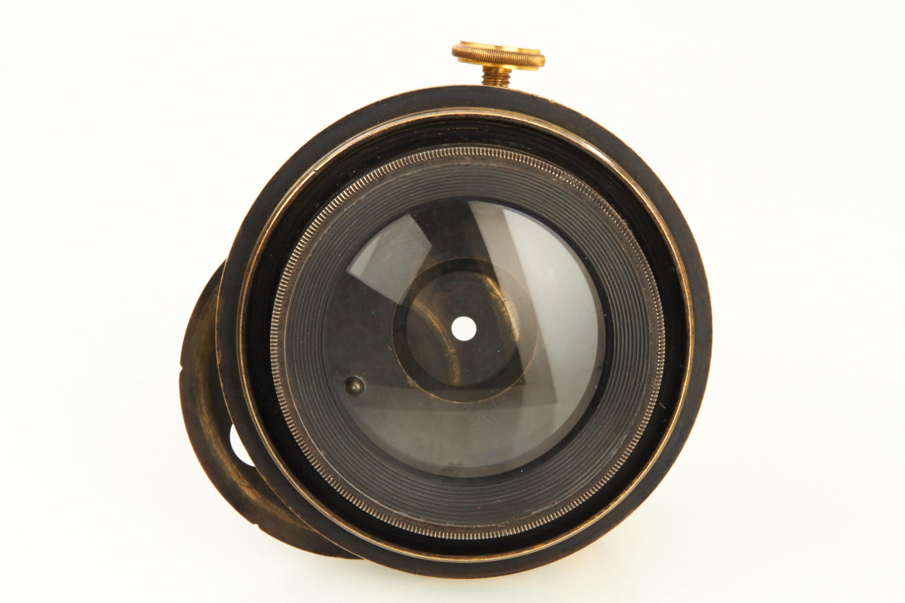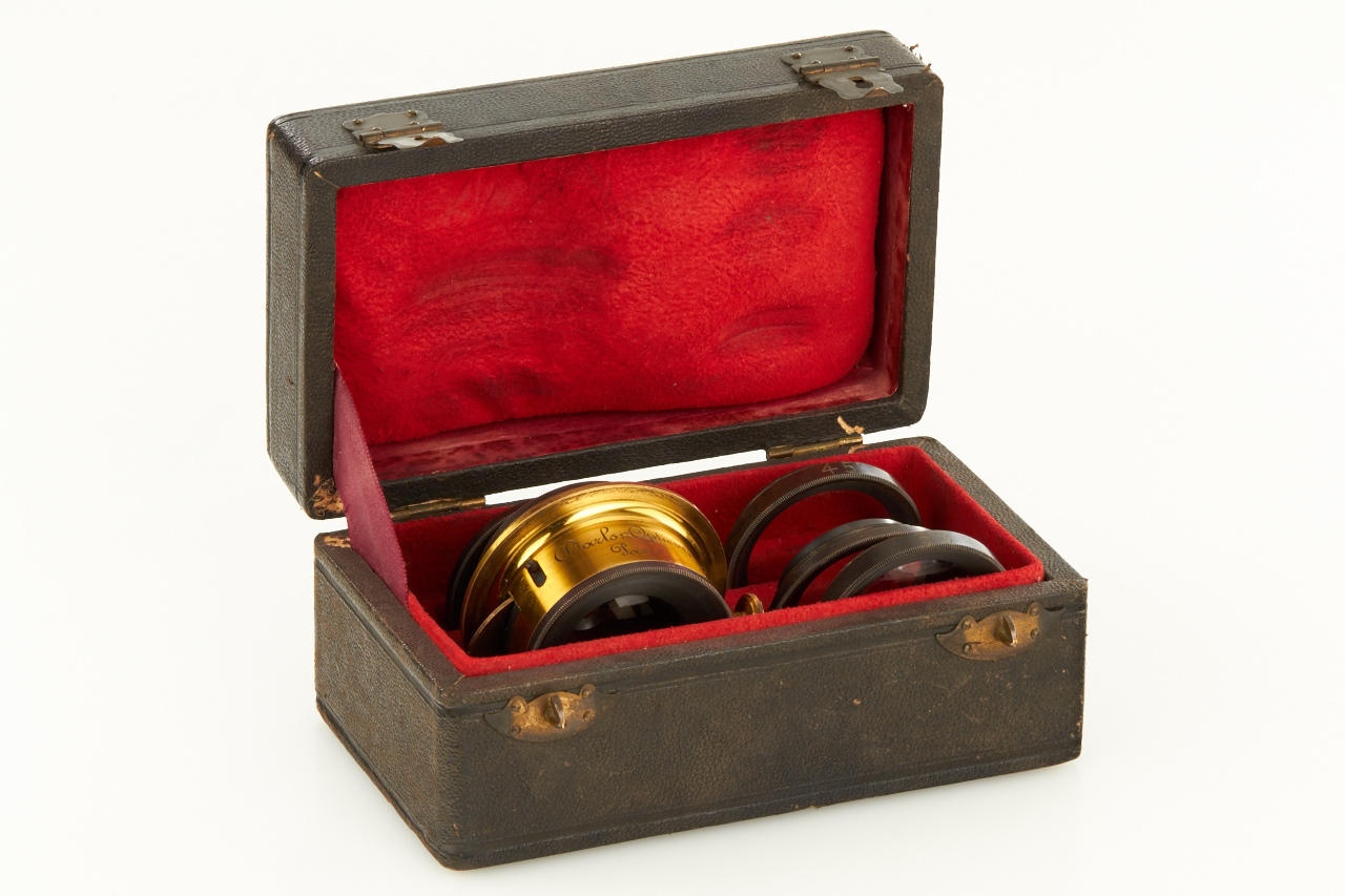 casket lens set including a lens body with rotating aperture disc and set of 6 lenses with various focal lengths: 17cm, 25cm, 33cm, 38cm and 2x 45cm, inclusive matching Darlot padded case