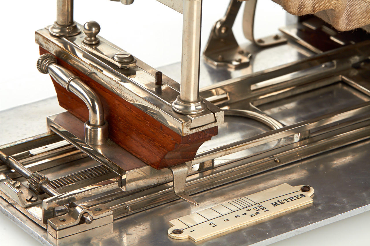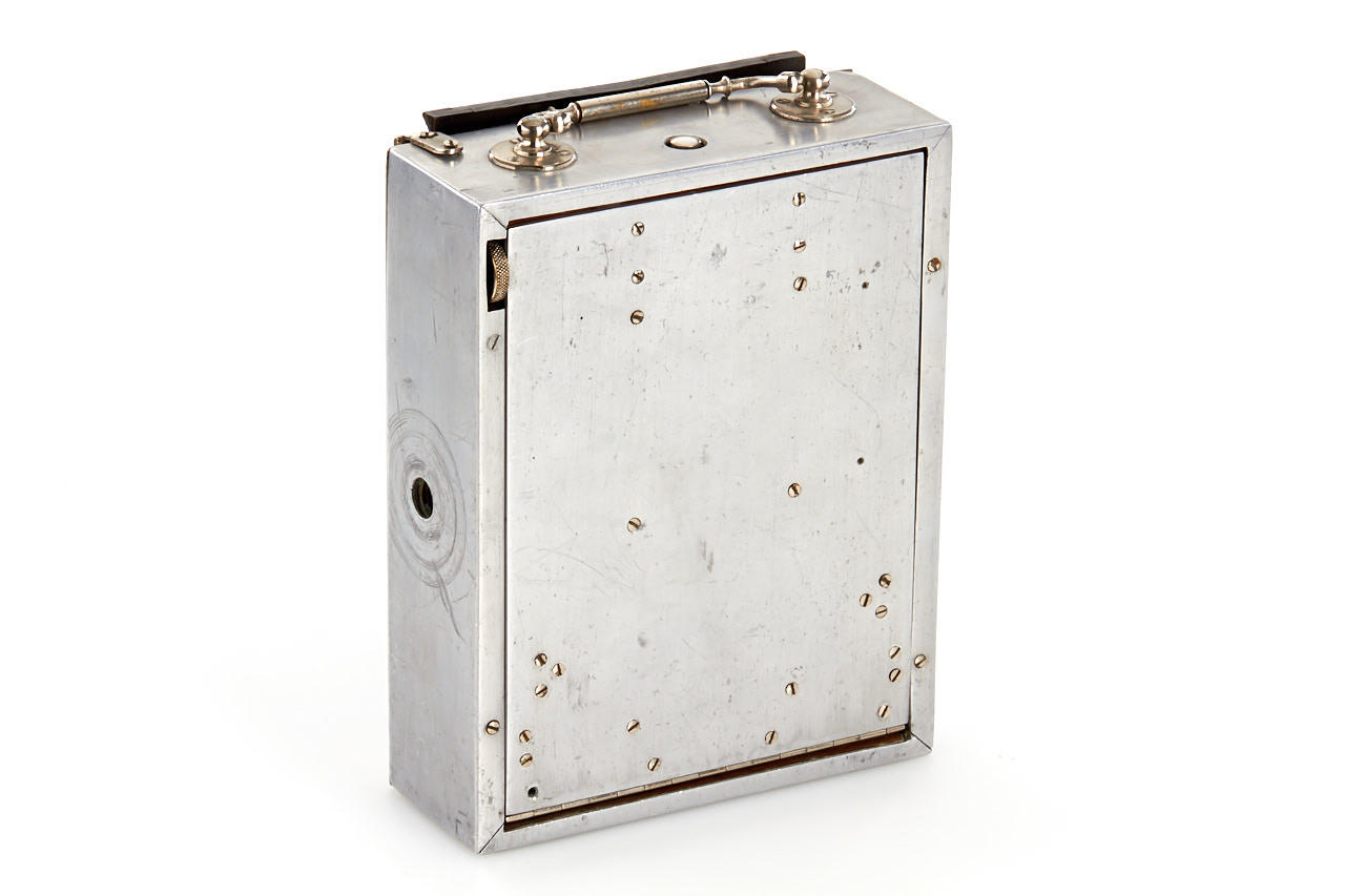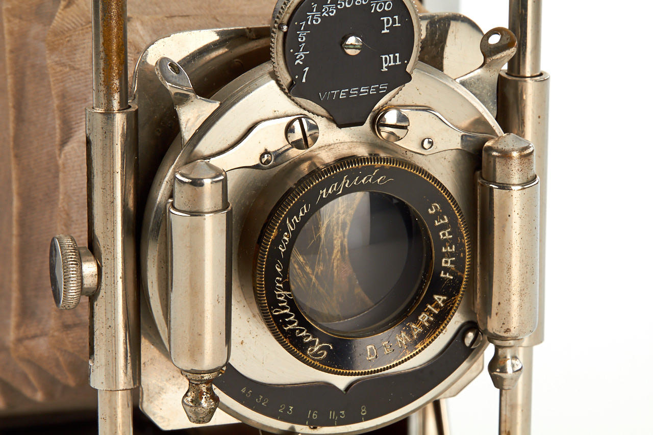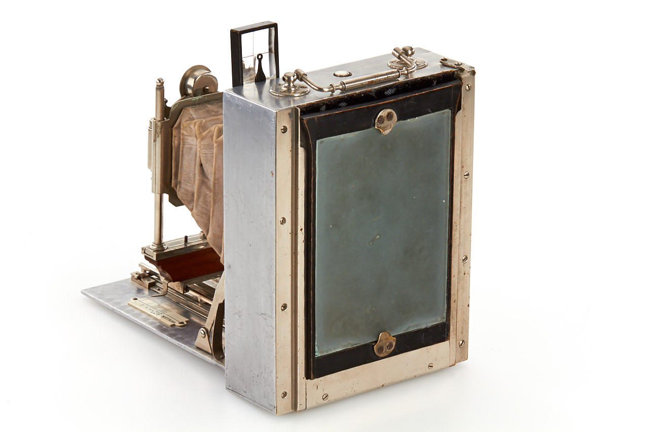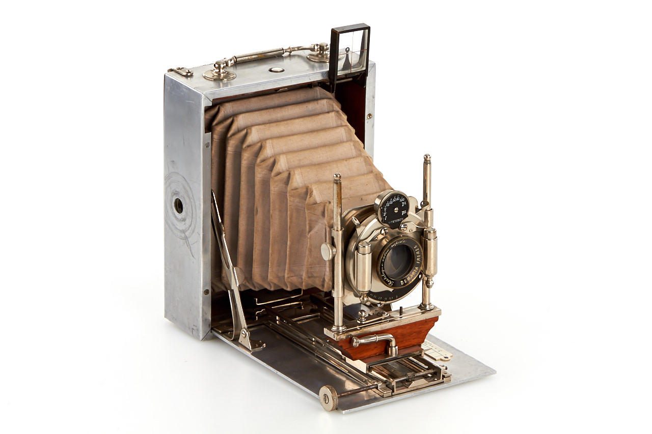 rare luxury version of the early Caleb 9x12cm camera, wooden body covered in aluminium, aluminium bed, nickel trims, original grey bellows, Demaria Rectiligne Extra Rapide lens, with ground glass, in very good condition