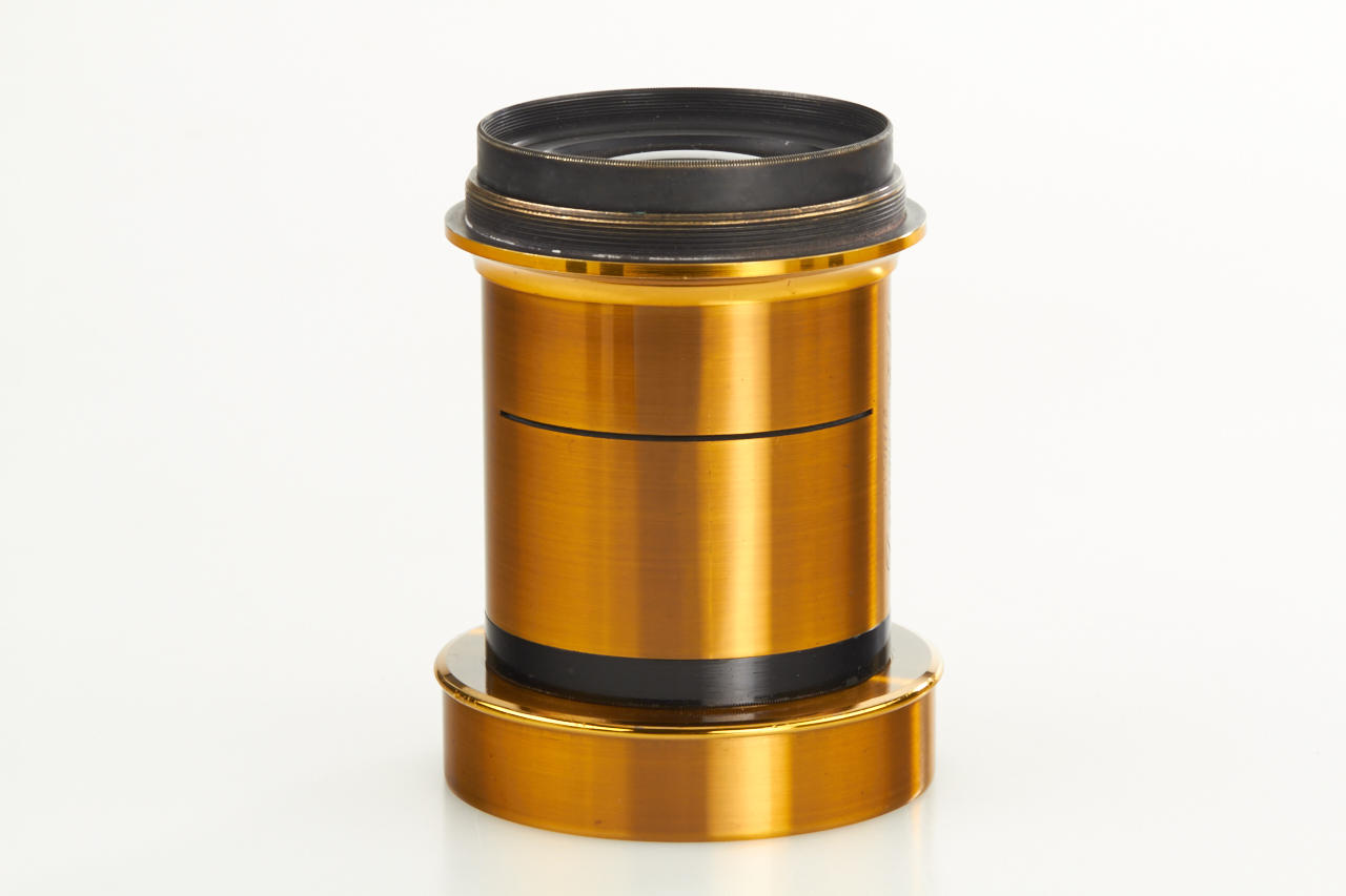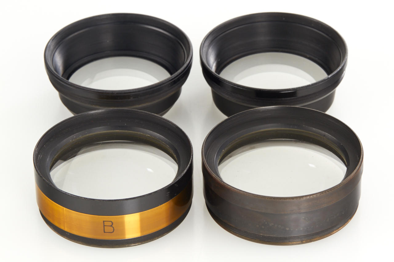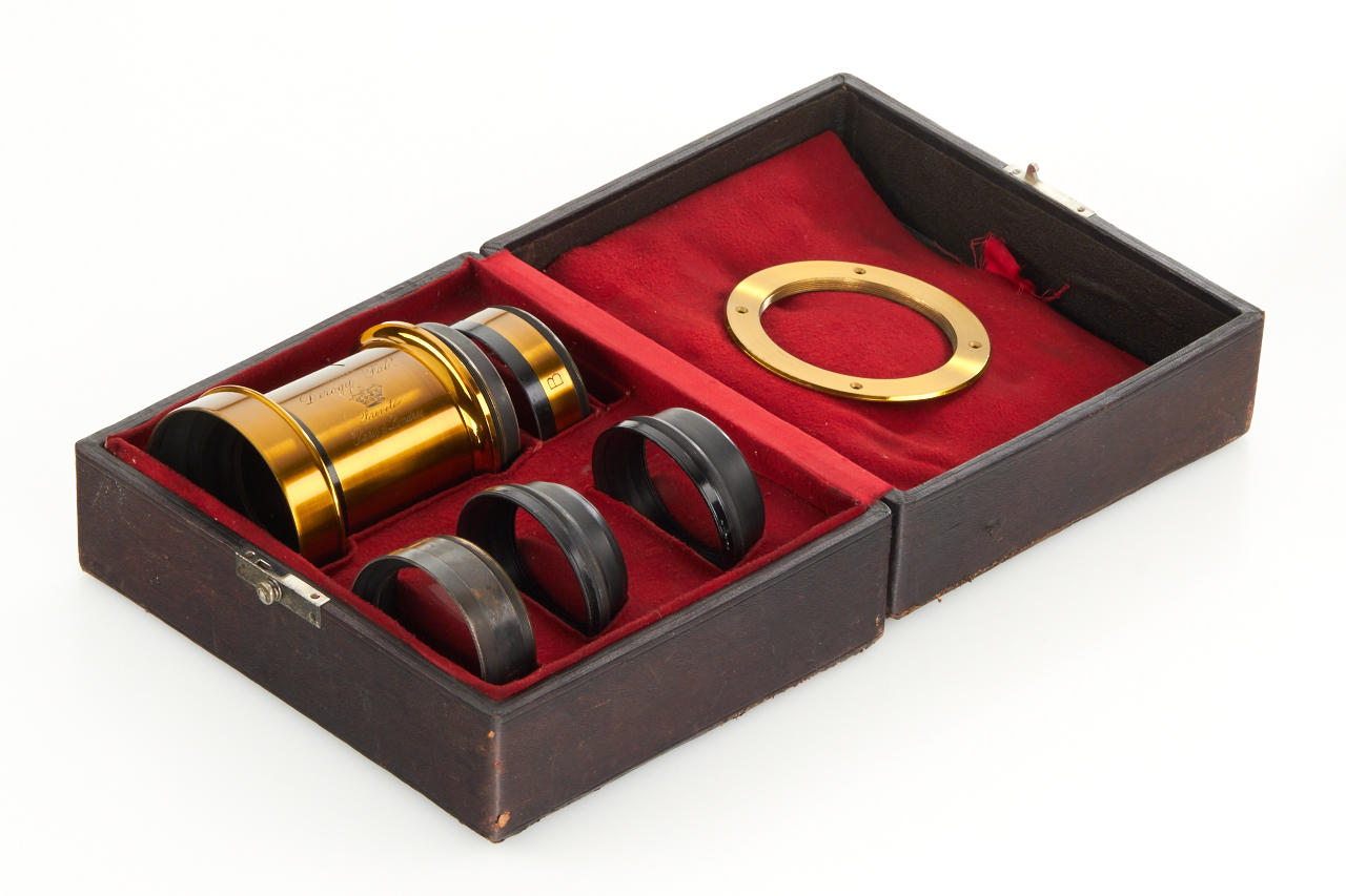 French brass lens kit in beautiful condition with 6 screw glass elements for various focal lengths, height c.13cm, optics diameter c.5,5cm, with mounting ring and matching black padded case