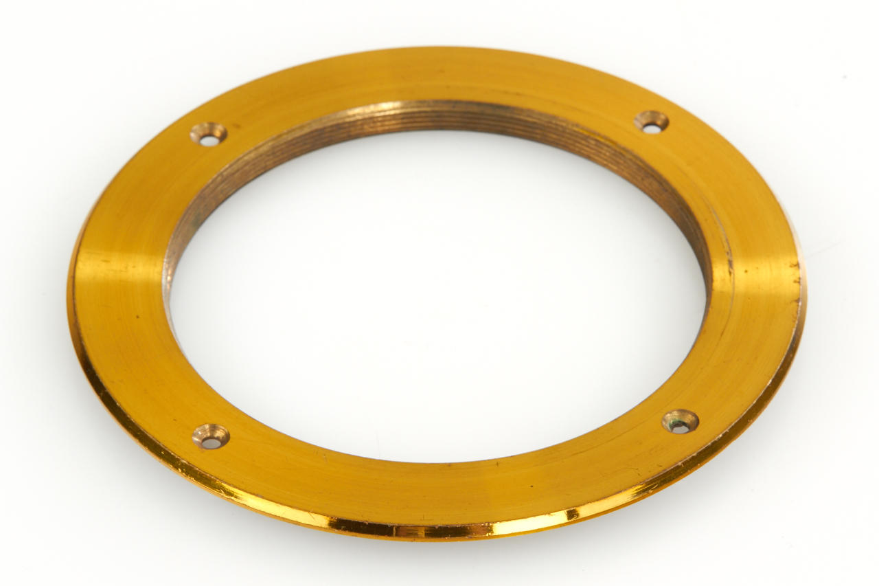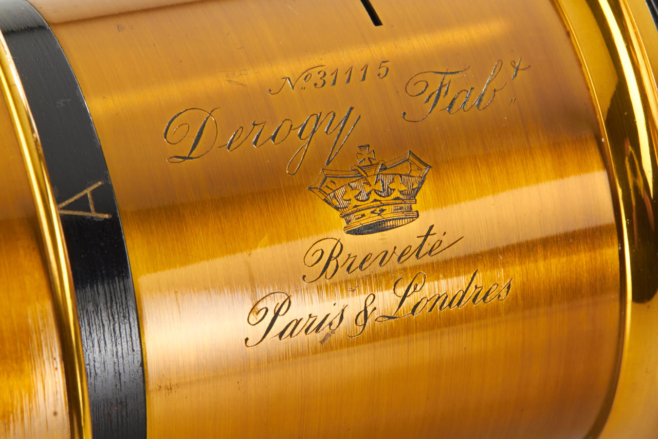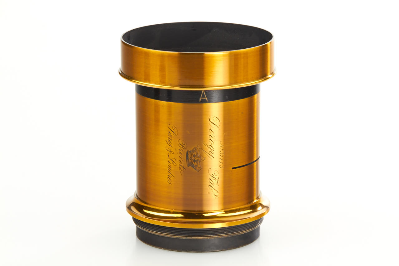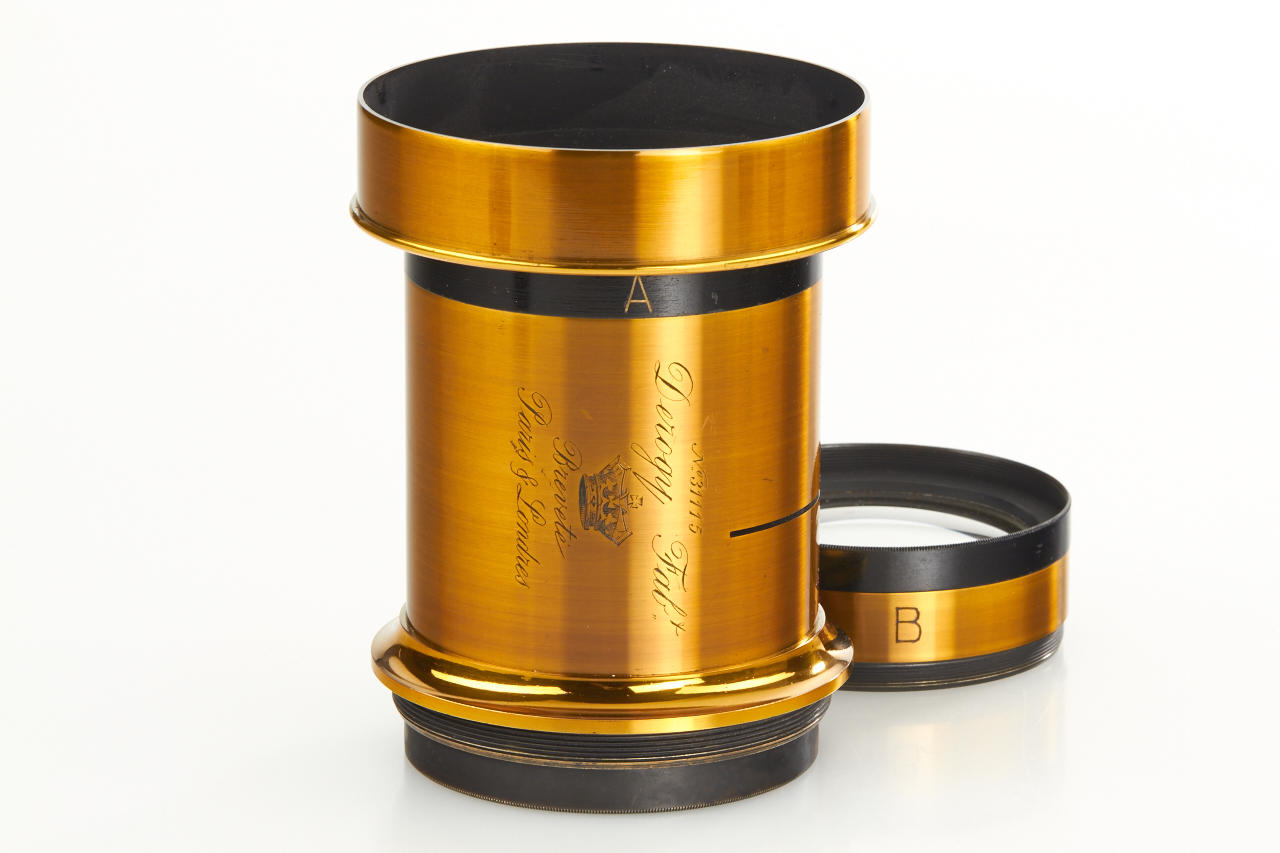 French brass lens kit in beautiful condition with 6 screw glass elements for various focal lengths, height c.13cm, optics diameter c.5,5cm, with mounting ring and matching black padded case