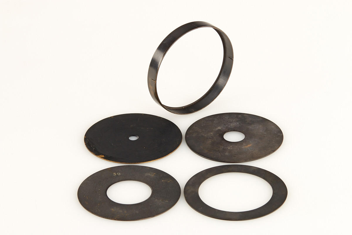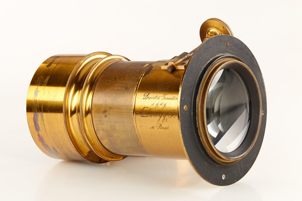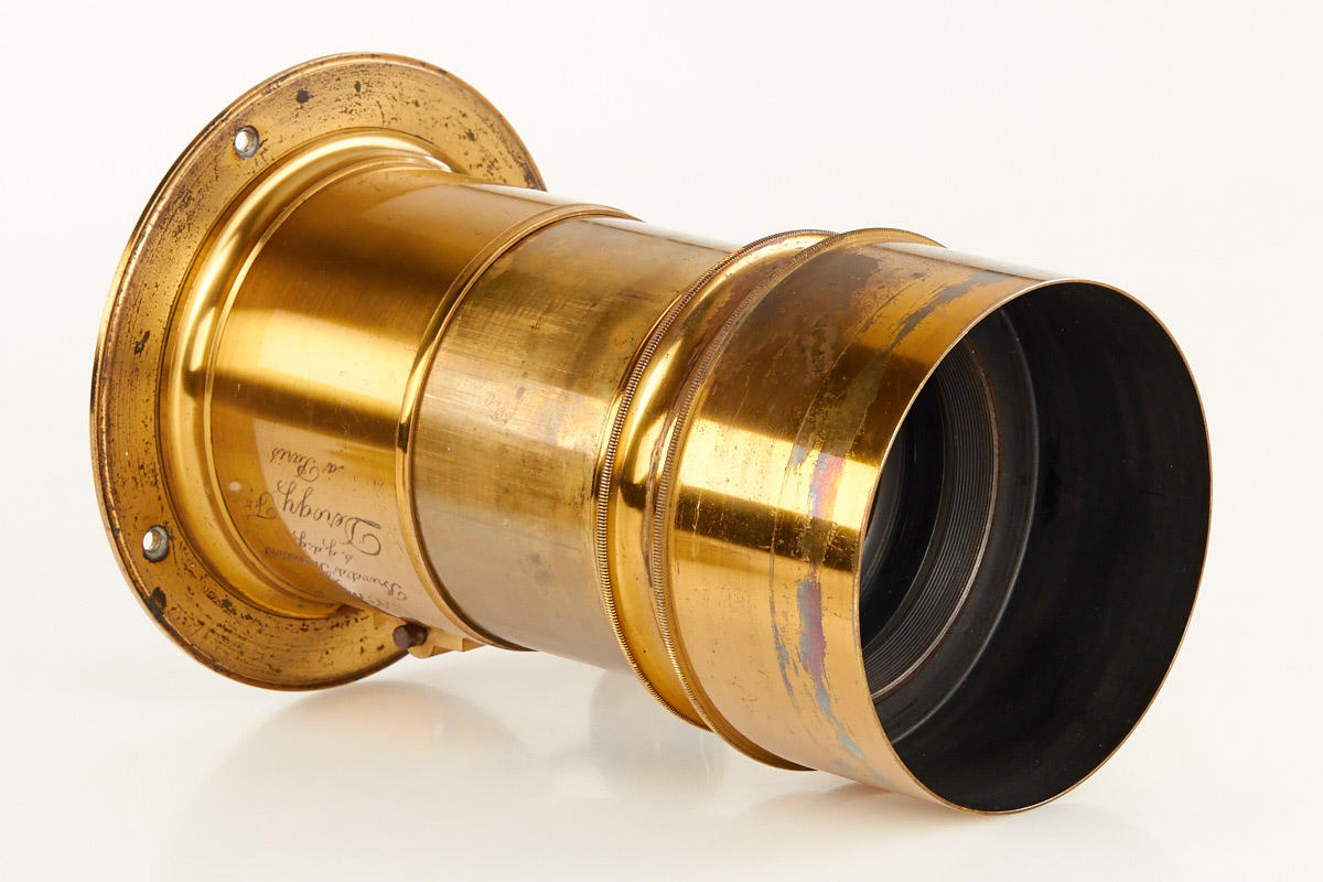 c.35cm focal length Petzval type lens in good condition, optics with only minimal cleaning marks, total height incl. hood 21cm, incl. 5 aperture discs and brass lens cap