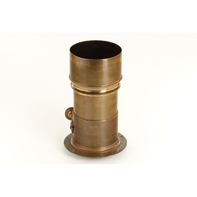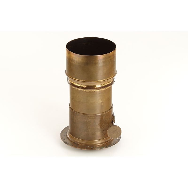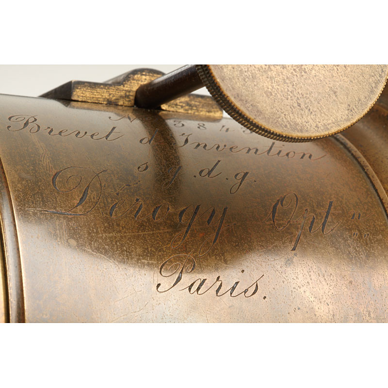 approx.50cm focal length, rare and early Petzval lens (some small scratches on front lens), rack and pinion focusing, barrel engraved 'No.3843 Brevet d'Invention Derogy Optn Paris', mounting ring, shutter cap, lens diameter c.10cm, total height incl. hood: 31.5cm, with two insert lenses (to be inserted in the middle of the lens) with matching serial number engraved '2 3843 lentille pour faire plus petit' and three aperture discs in small box, all in original fitted wooden carrying box