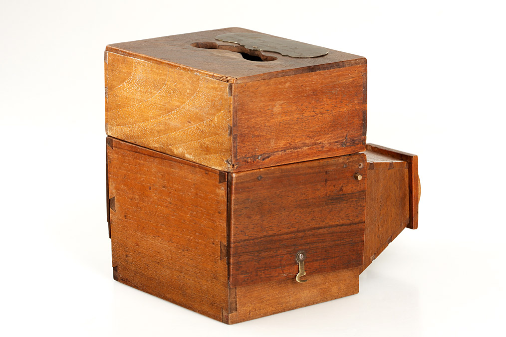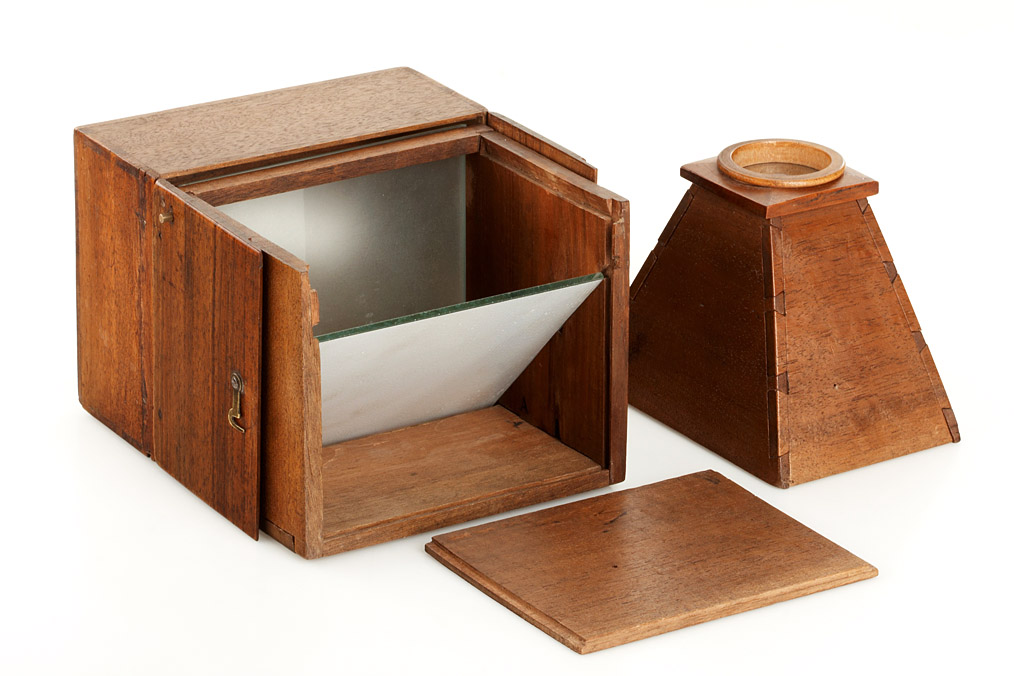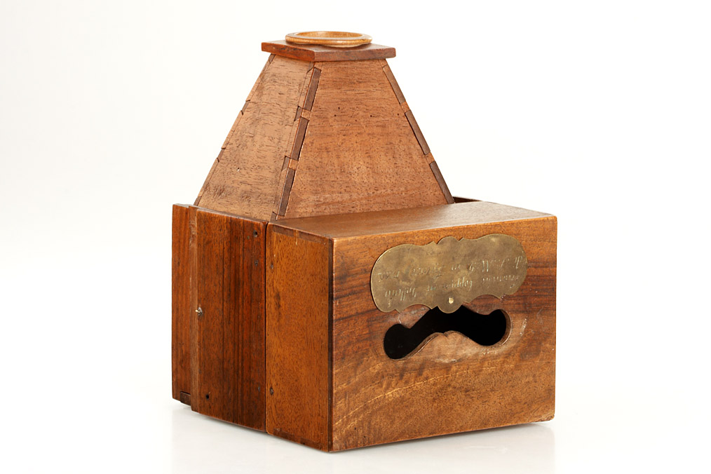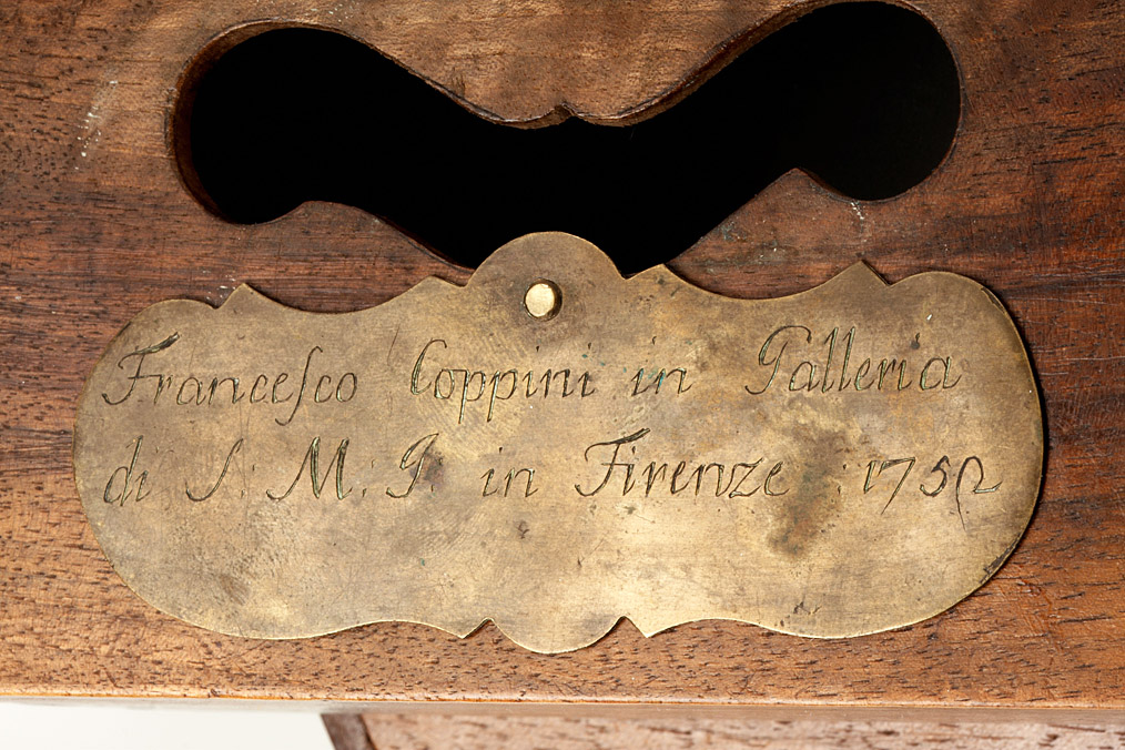 The ingenious design of this camera obscura and the delicate way in which all the details are crafted suggest that this graceful piece of 17th cabinetry is the journeyman's piece of a gifted Italian carpenter. The dismountable body is held together by interconnected timber joints only. When not in use all parts can be stored in a small wooden box with hinged lids, which beforehand served as a visor. As a masking to the eyepiece serves a pivoted brass plate which is engraved: „Francesco Coppini in Galleria di S:M:I: in Firenze : 1752“. Although the wood shows some minor wear, the camera is in exceptional good all over condition; the lens, the mirror and the diffusion screen made of etched glass are later additions. We have no knowledge that a comparable piece has ever been published or auctioned. Besides its rareness this beautifully crafted lot is one of the rare opportunities to purchase such an early and exceptional camera obscura