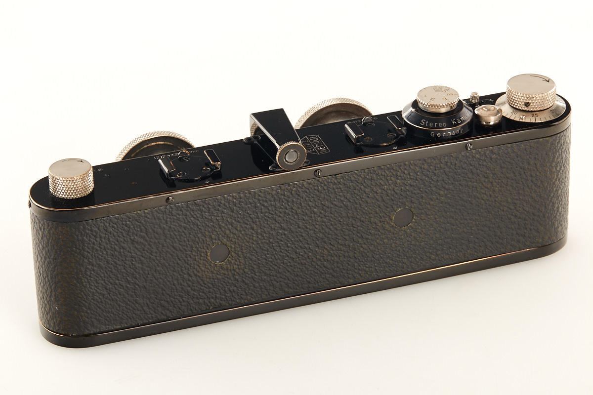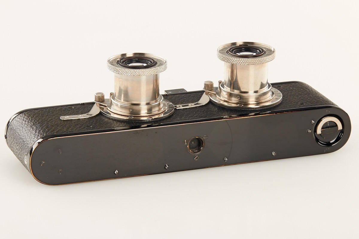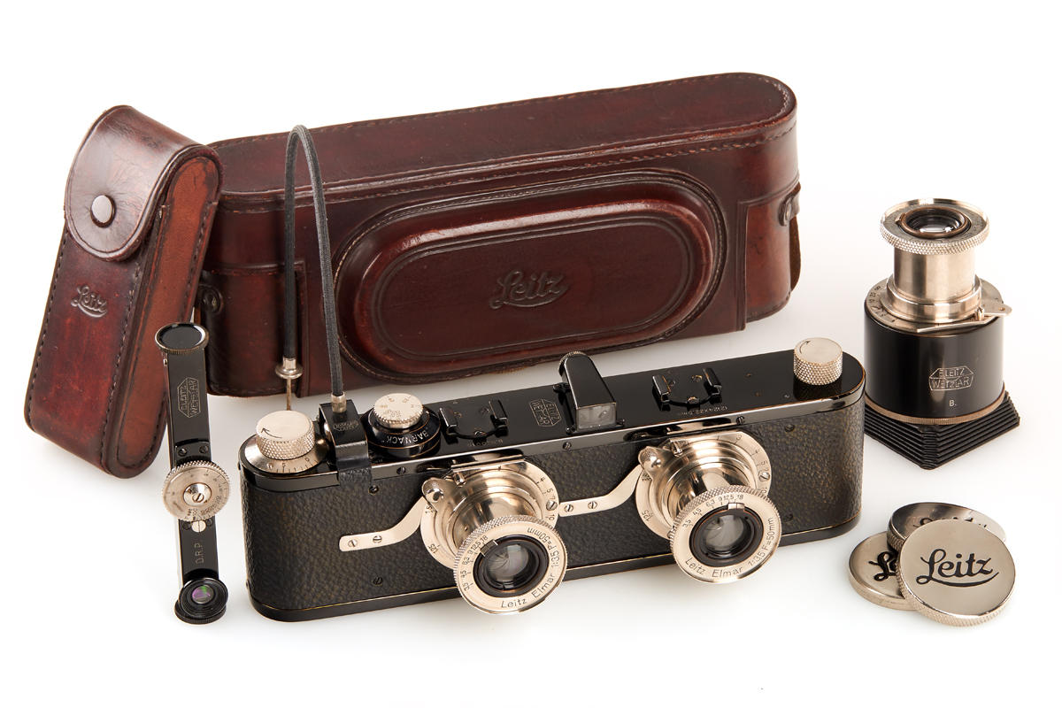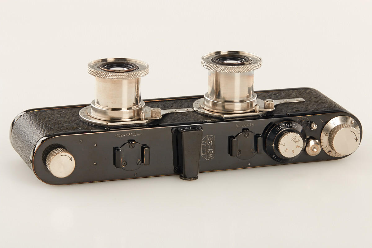 beautifully made replica made with original factory parts (on special request made by Leitz), top plate engraved '(2)24X22.5mm' and 'B.No0016', on shutter speed dial engraved ' "BARNACK" Stereo Kamera' and 'Germany', with two fixed nickel Elmar 3.5/50mm lenses numbered 00167A & 00167B, nickel caps, beautiful leather case stamped 'E. Leitz Wetzlar' in condenser logo at the back, FODUA rangefinder in Feet engraved 'Germany' (case), FINAL cable release engraved 'E. Leitz Wetzlar' in condenser logo, viewfinder attachment with focusing Elmar 3.5/50mm and focusing screen, including a roll of film exposed with this camera