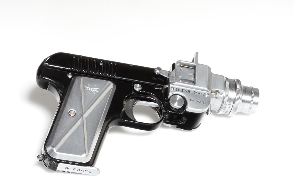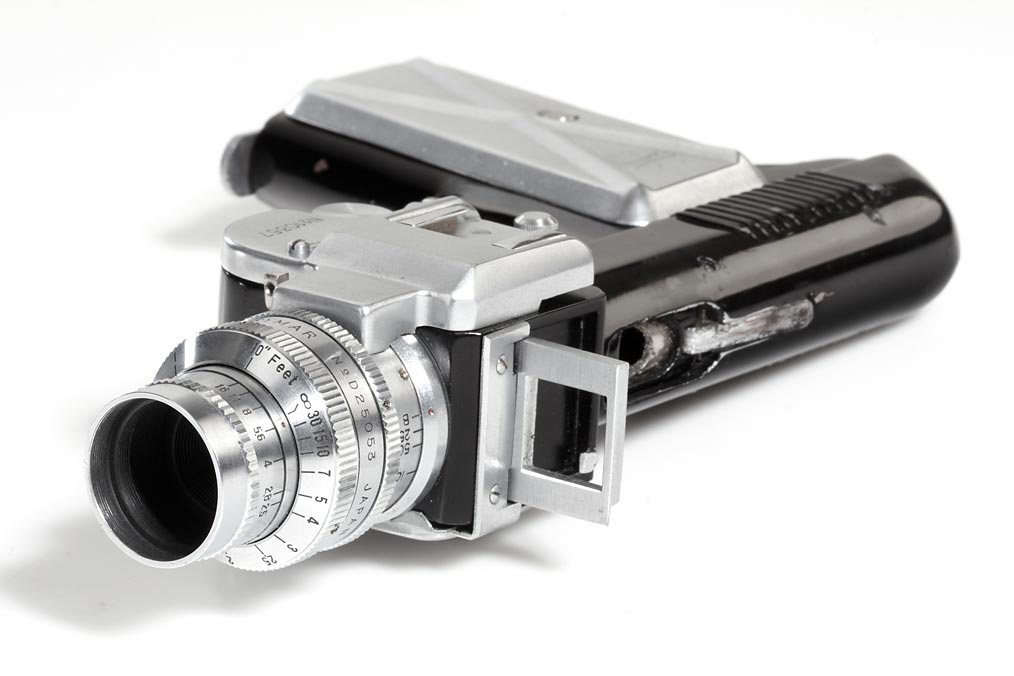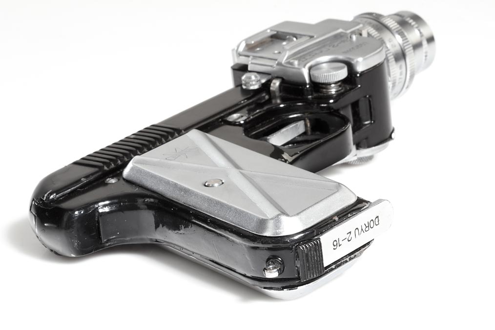 16mm, pistol subminiature camera of unusual design for 10x10mm exposures with bullet shaped flash cartridge, Dorymar wide angle lens 2.5/17mm no.D25053, in very good original condition