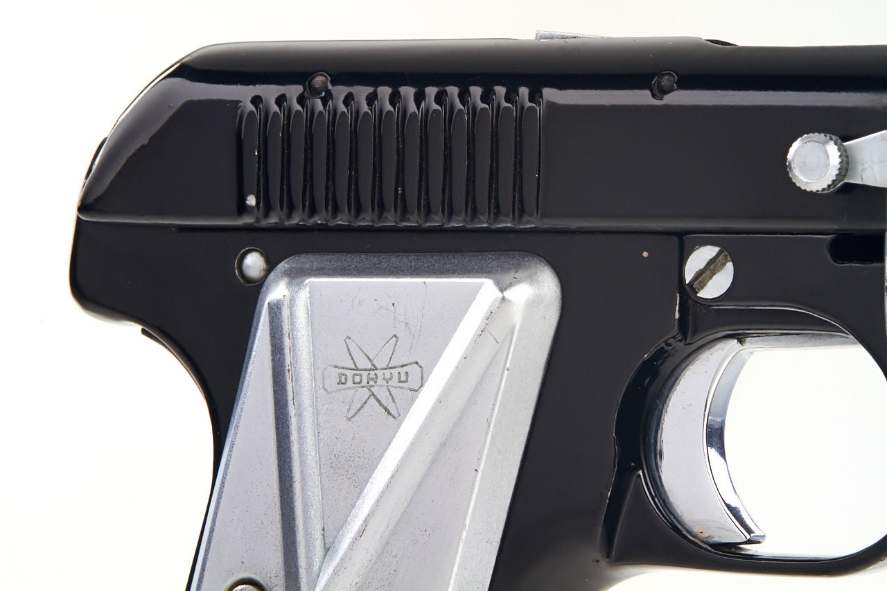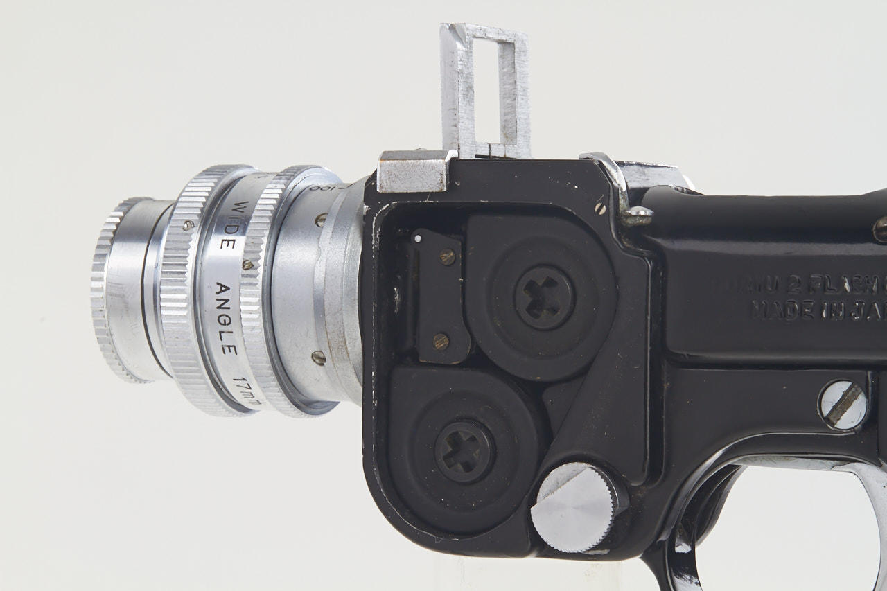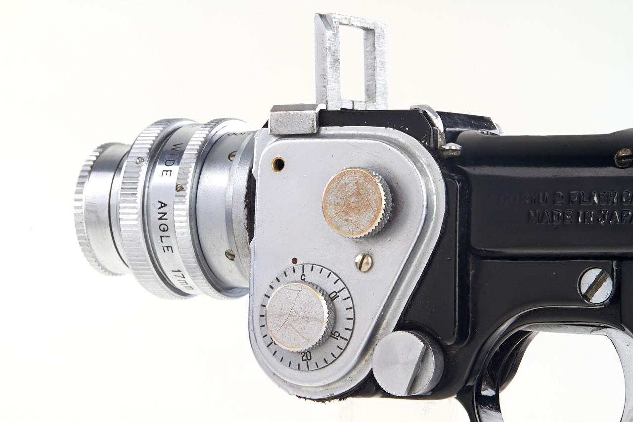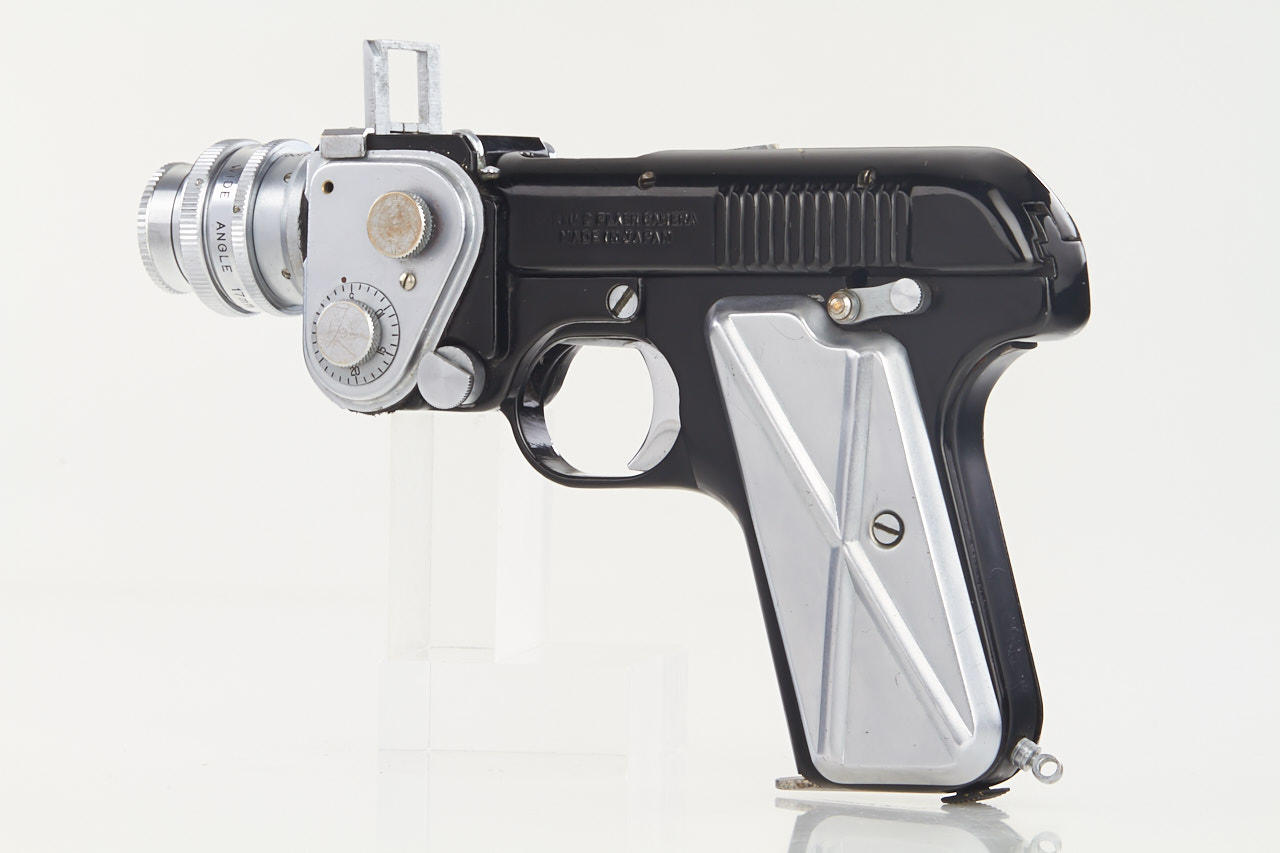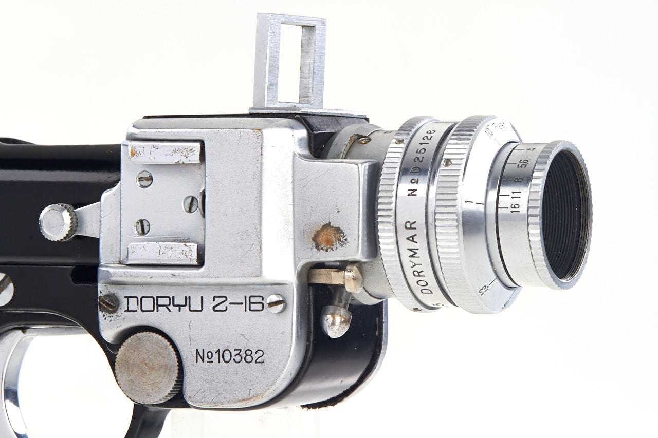 16mm, pistol subminiature camera of unusual design for 10x10mm exposures with bullet shaped flash cartridge, Dorymar wide angle lens 2.5/17mm no.D25126 with cap, in very good original condition