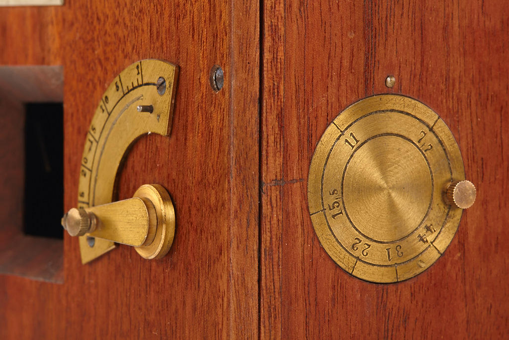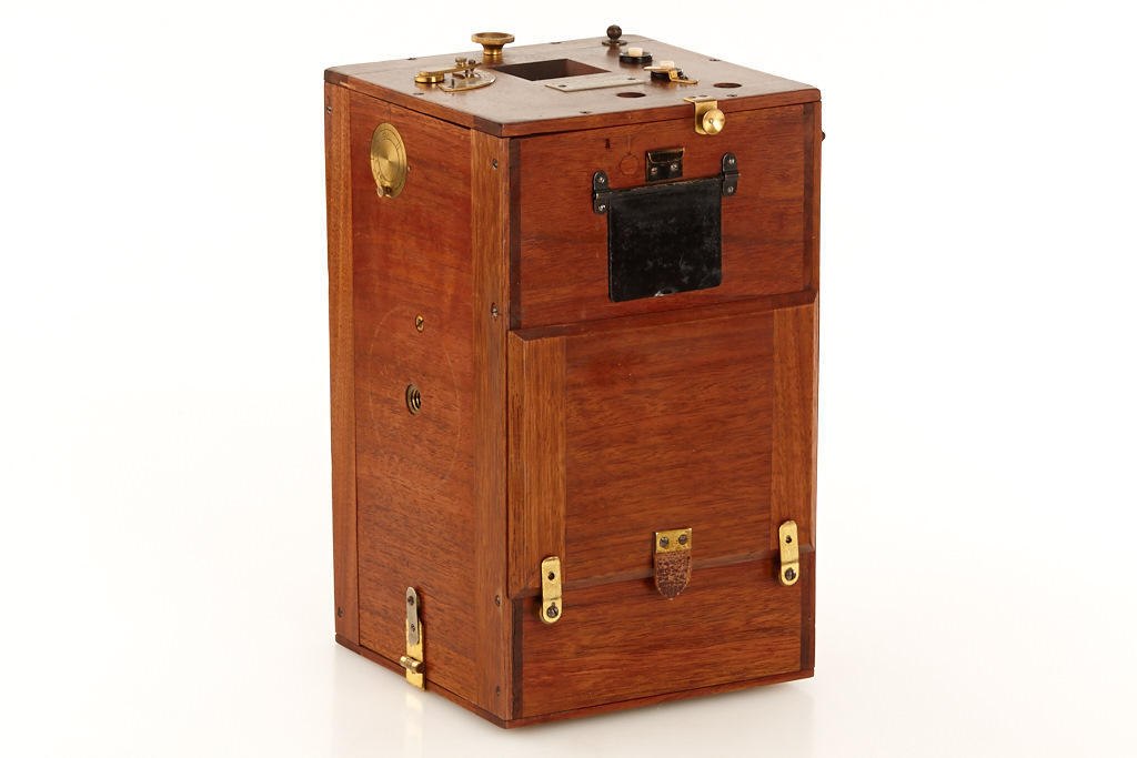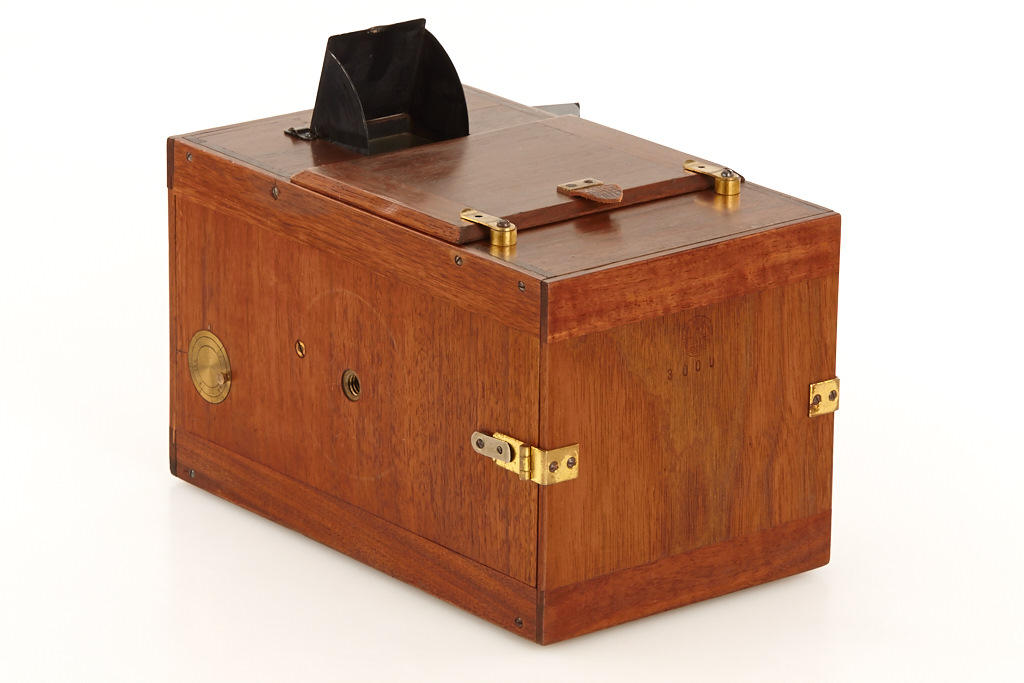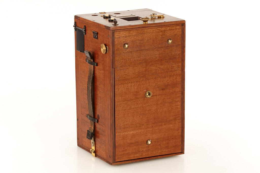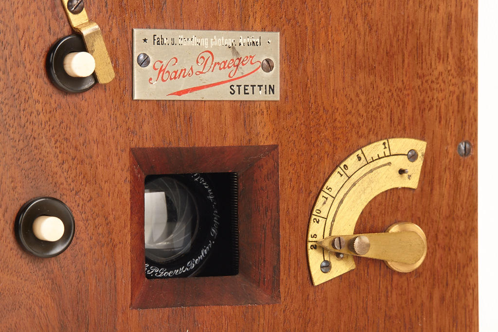 9x12cm, falling plate camera in very good original condition and good working order, Achromat lens in simple spring shutter, leather strap, two reflex finders, on front dealer's plaque 'Hans Draeger STETTIN'