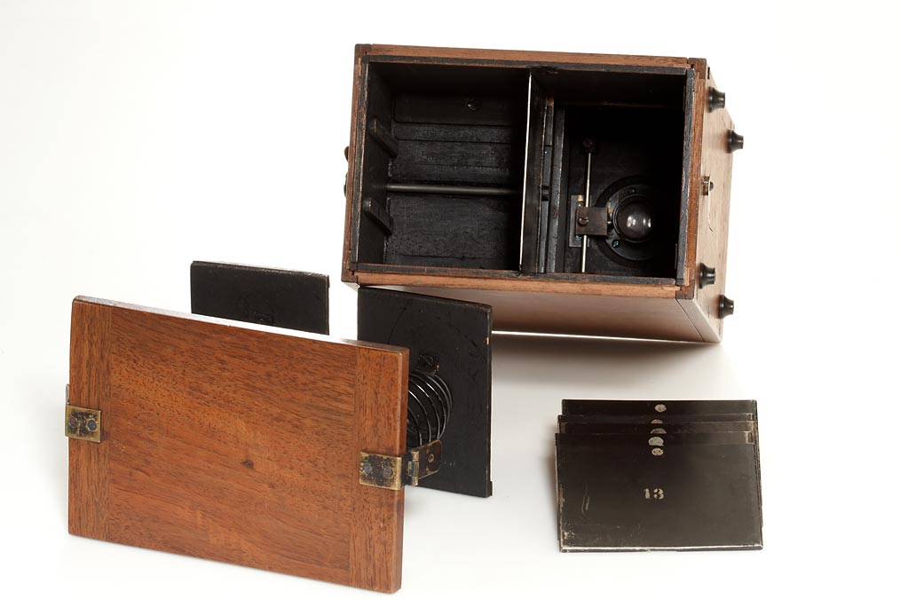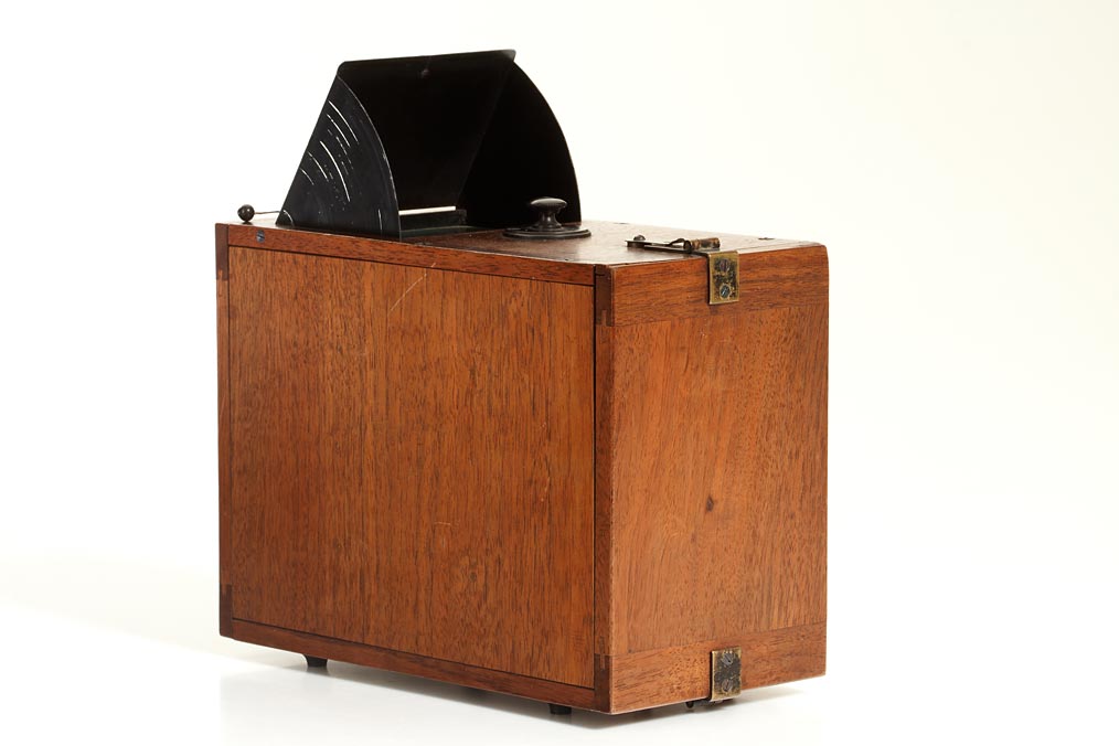 early TLR magazine camera in polished walnut, for 18 plates 8x6cm, very rare and in fine original condition, very rare original leather case, the Electus is very similar to the Simplex but for export