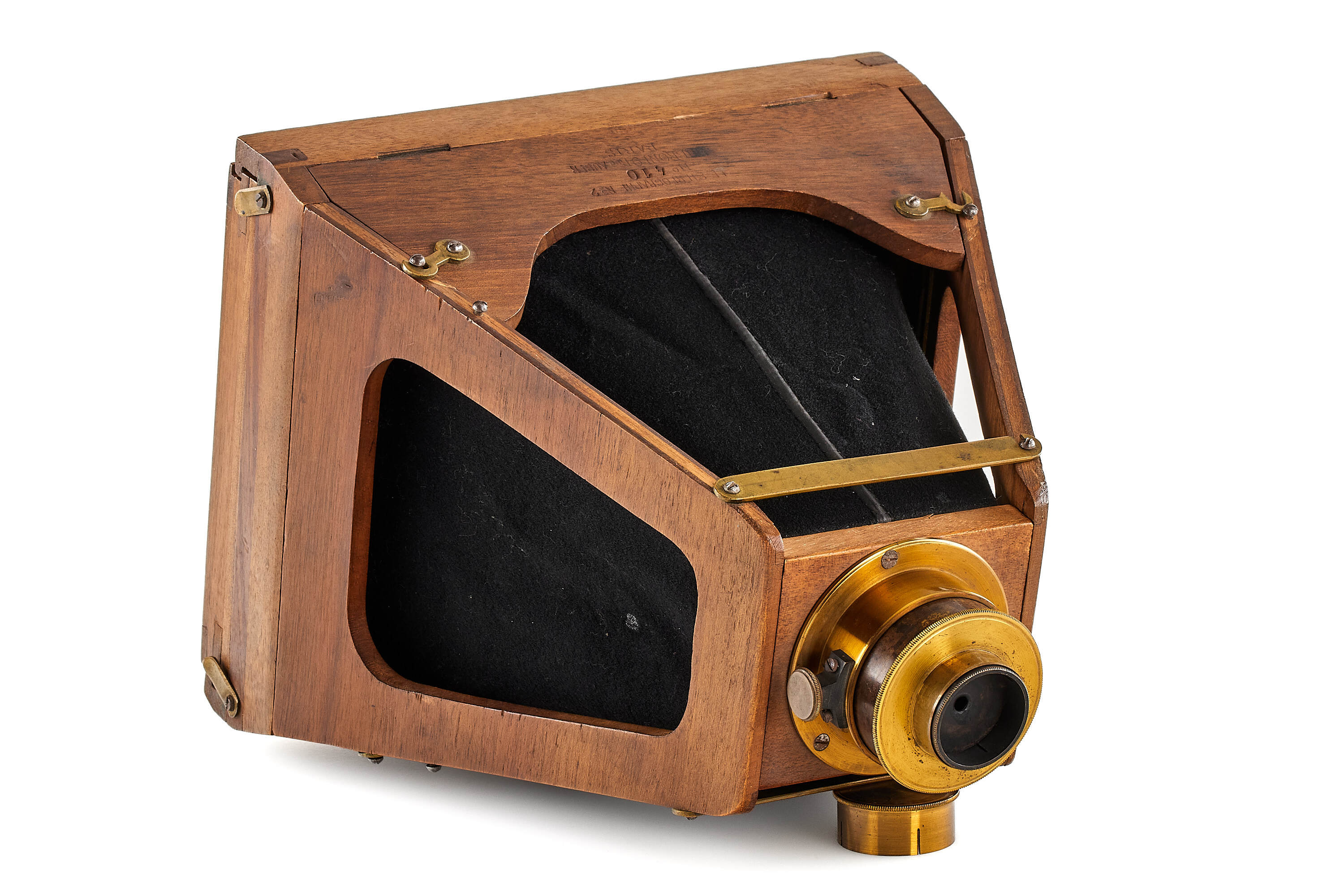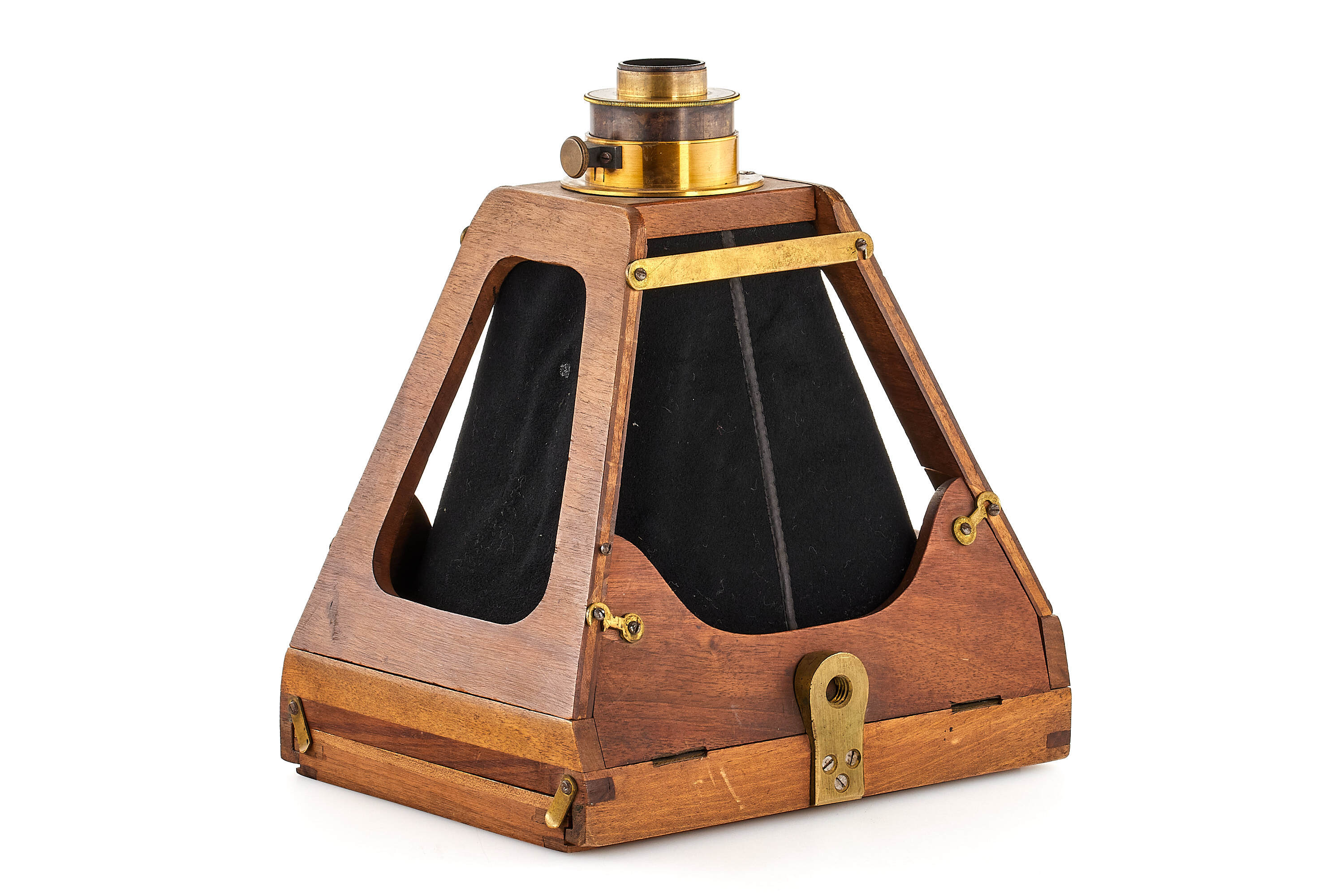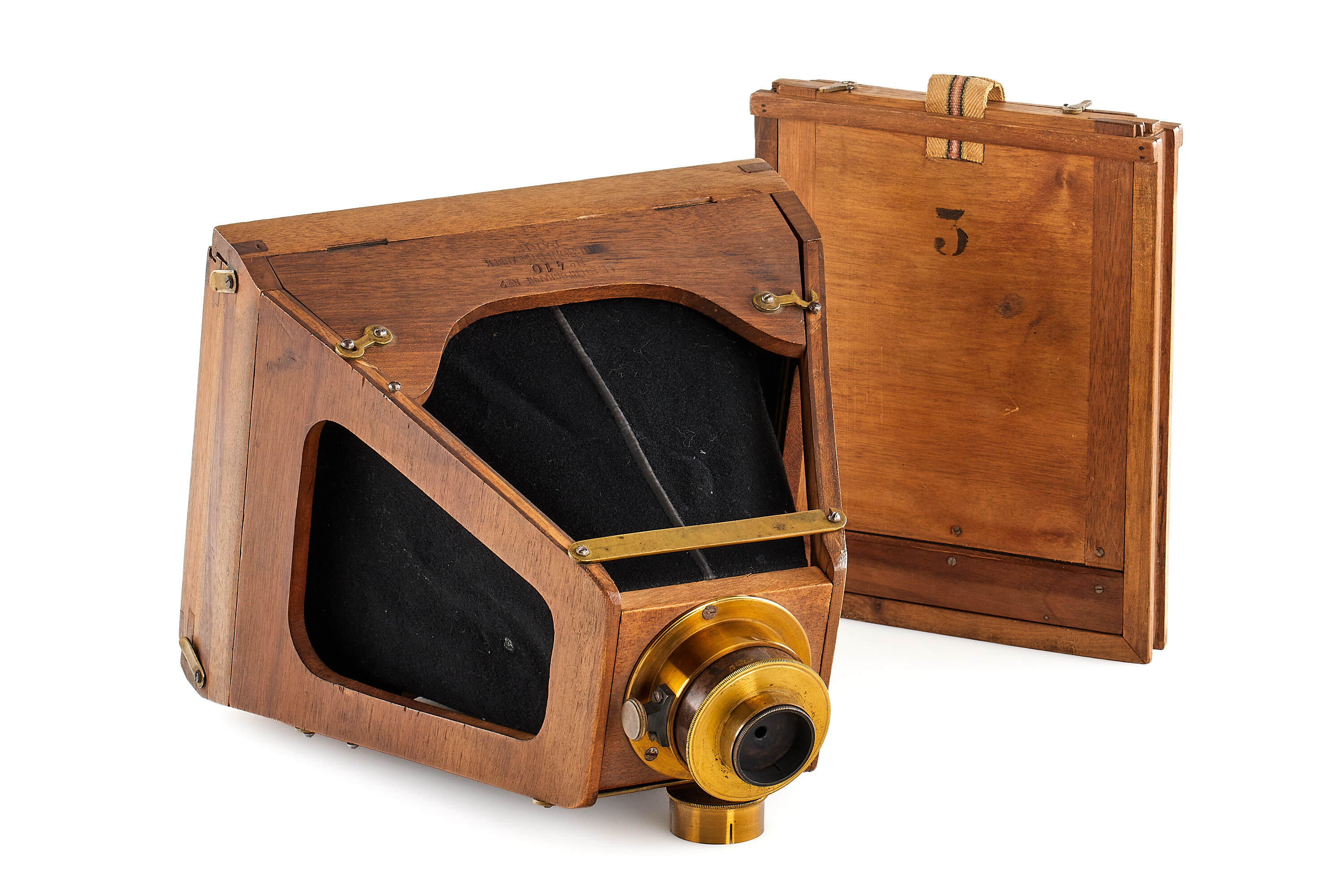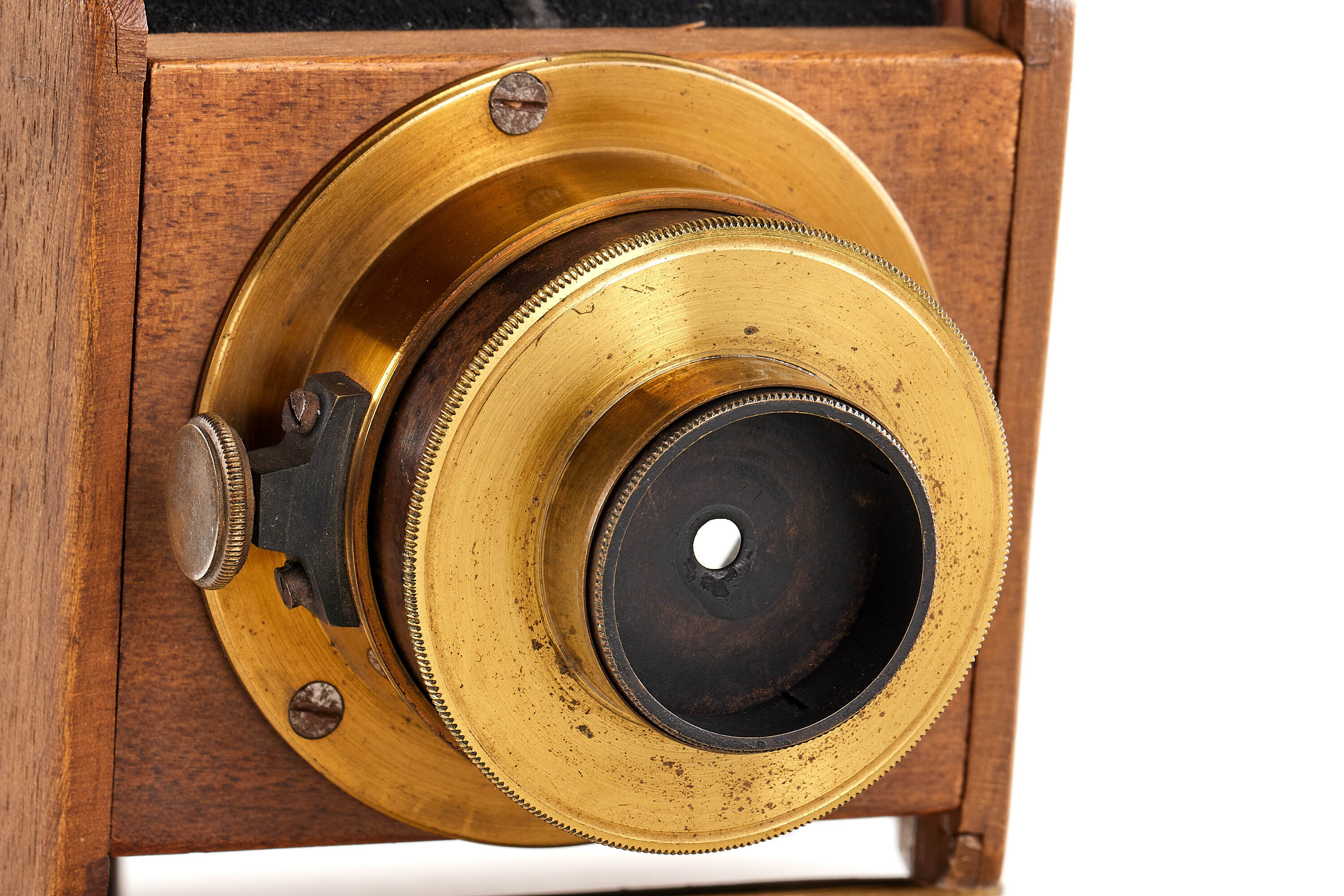 Very rare early walnut folding side strut camera for 10.5x15cm film plates with wool bellows, with unnamed brass sliding lens with 2x Waterhouse apertures and front lens cap, in very good condition, some cracks in the wood, with focusing back and one double film plate holder.
