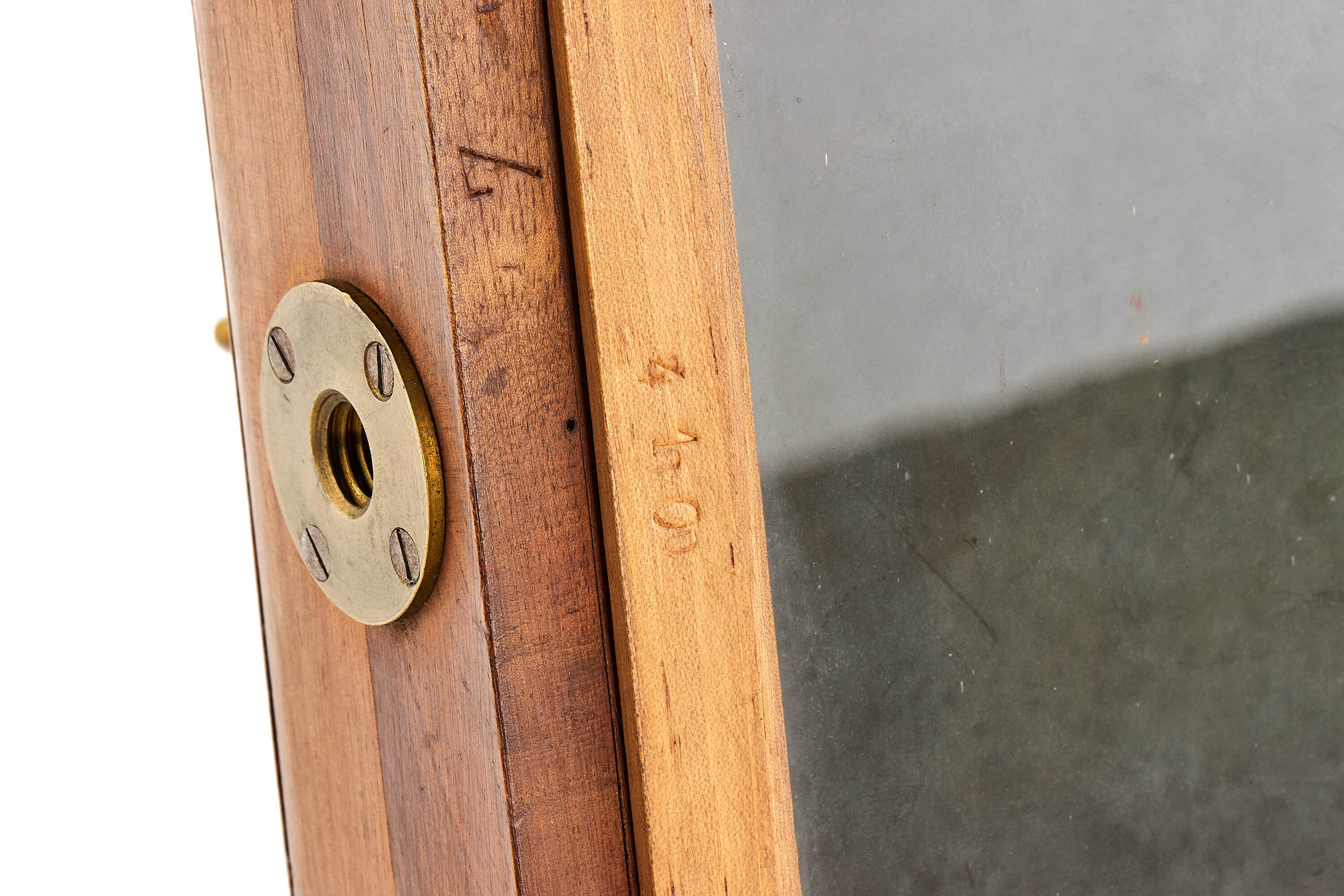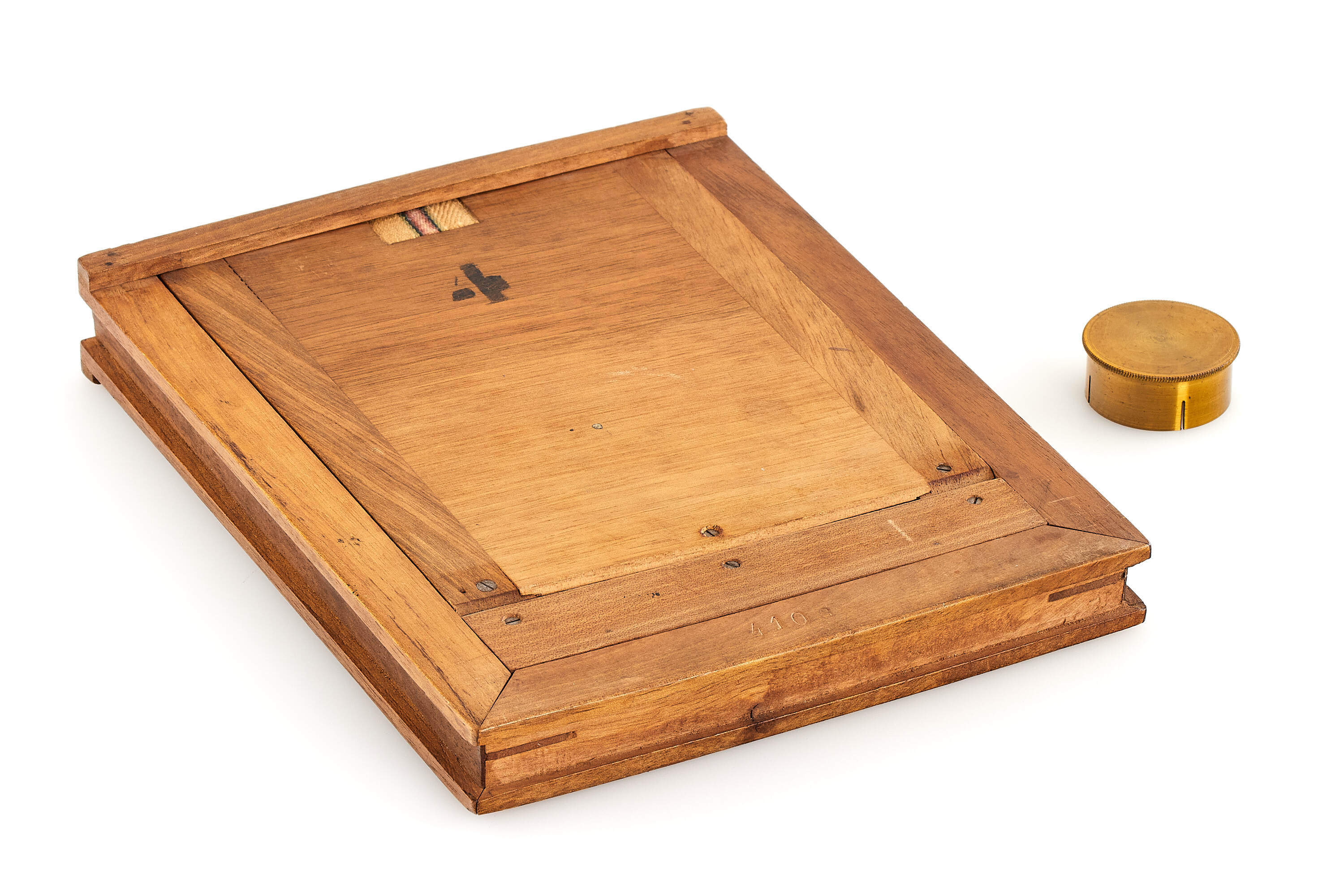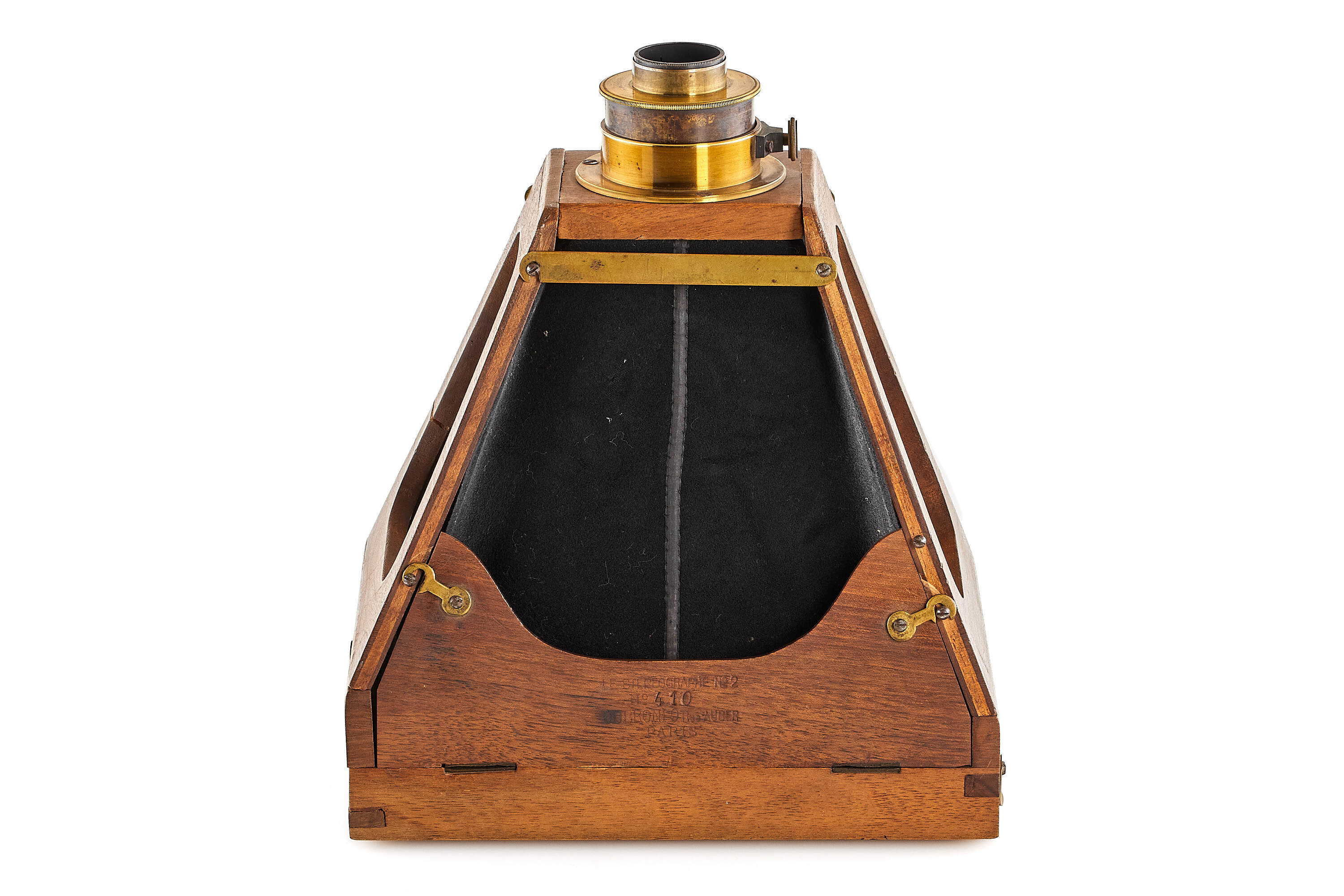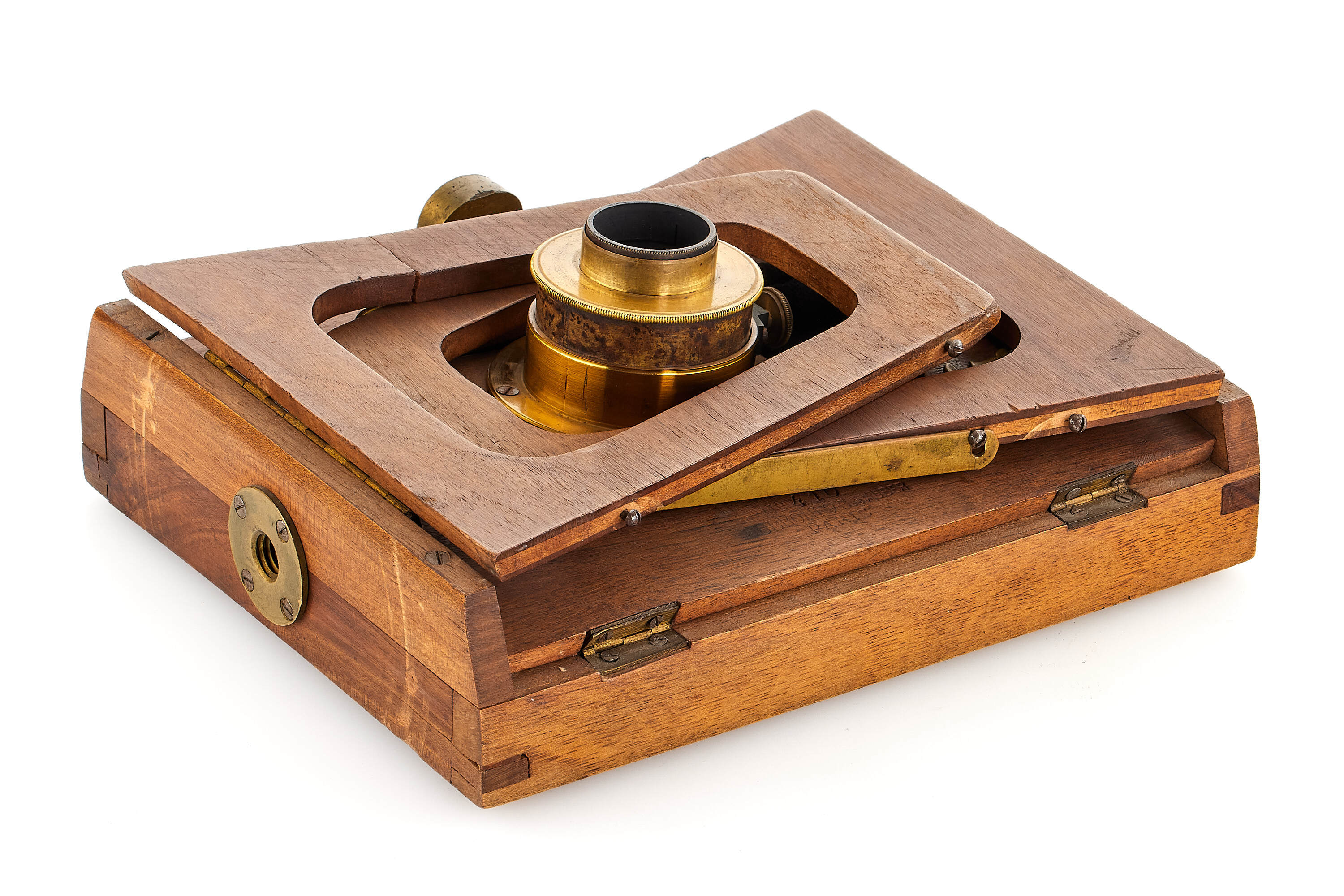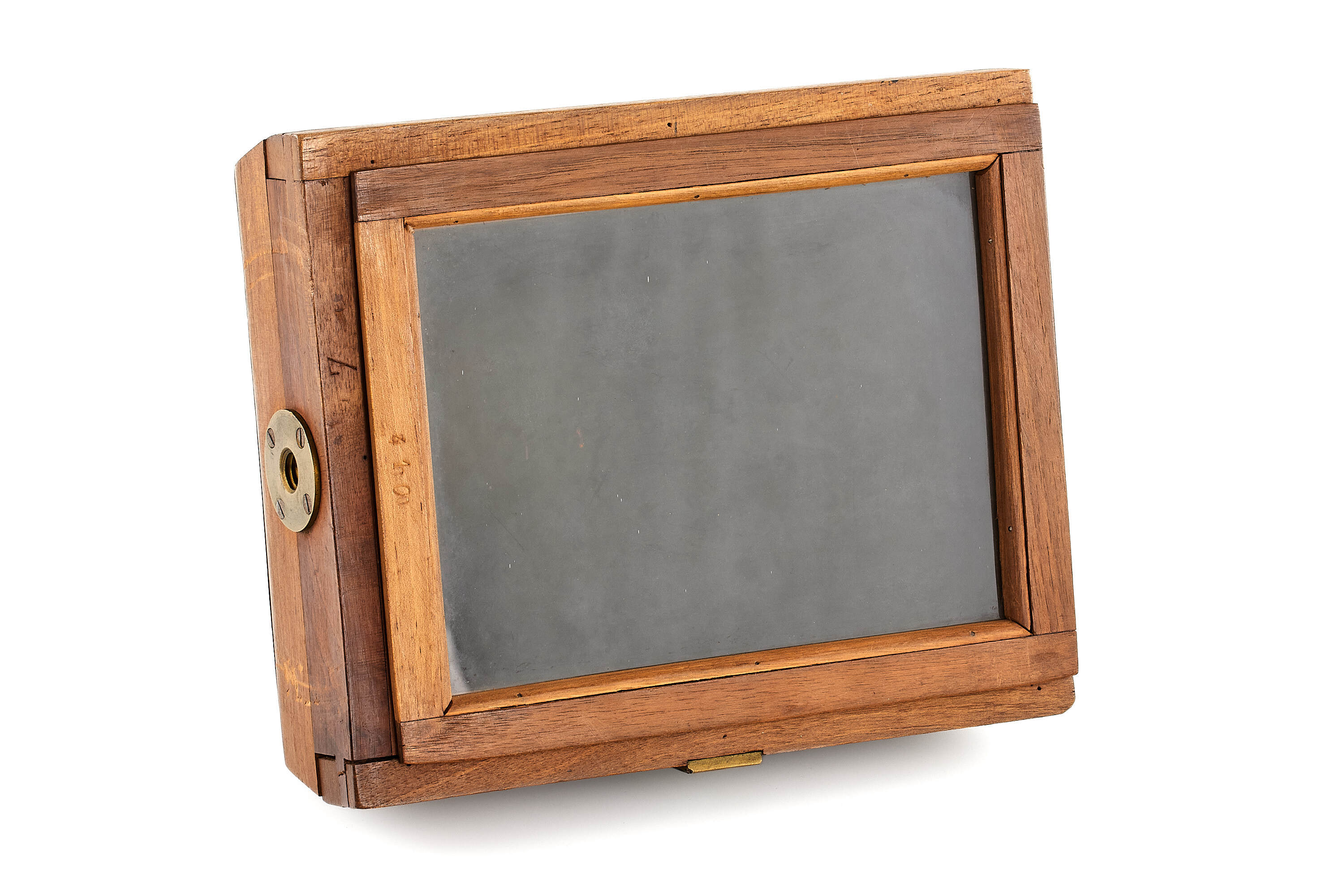 Very rare early walnut folding side strut camera for 10.5x15cm film plates with wool bellows, with unnamed brass sliding lens with 2x Waterhouse apertures and front lens cap, in very good condition, some cracks in the wood, with focusing back and one double film plate holder.