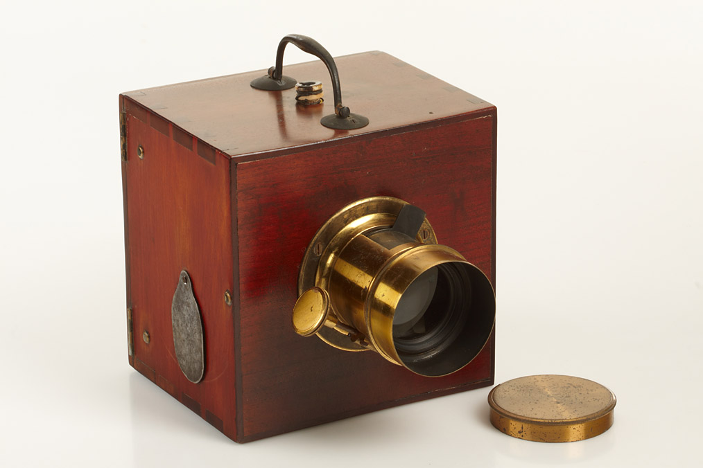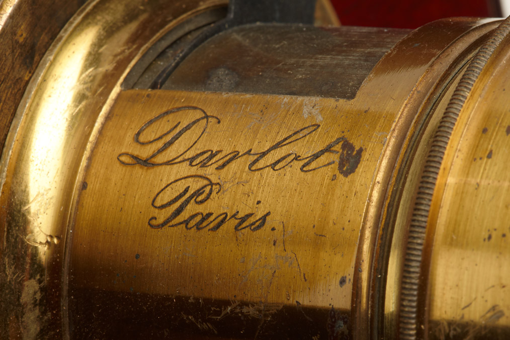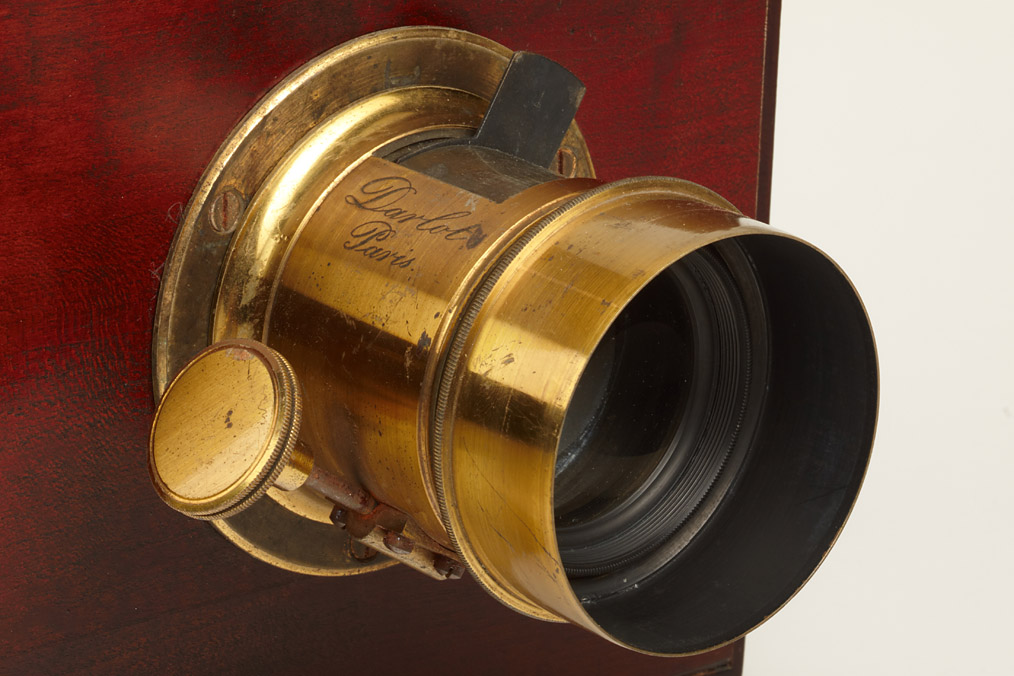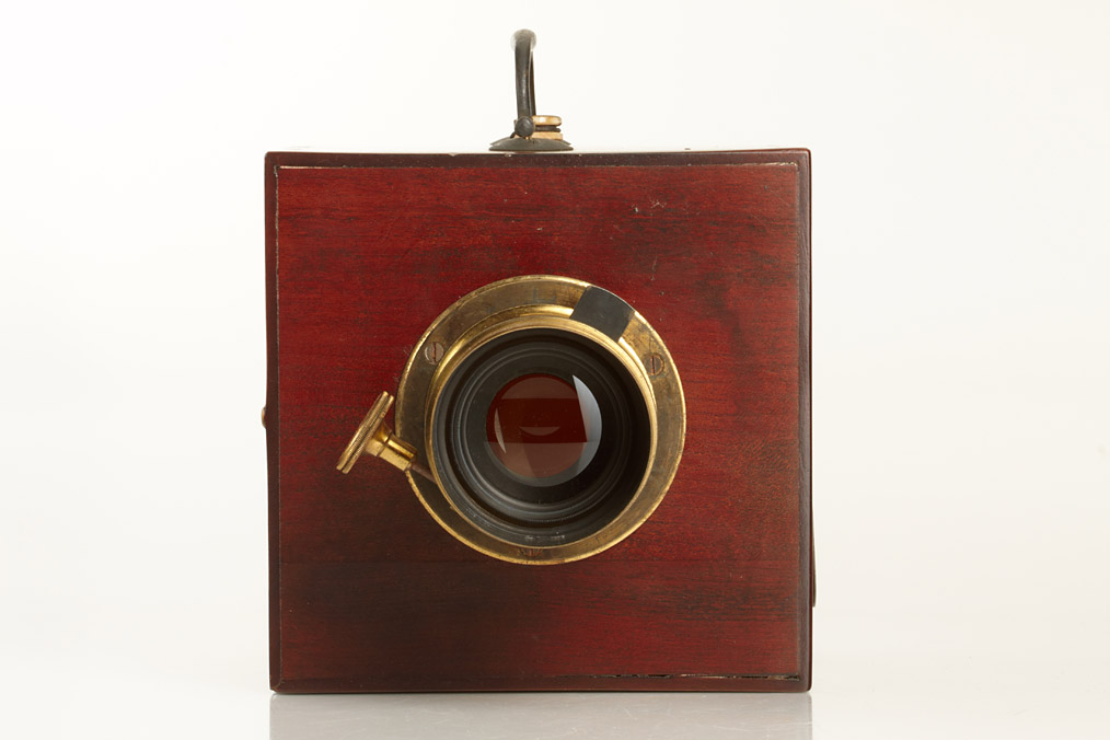 rare large version for 7cm diameter oval exposures, walnut body, amber glass bottle interior with a Dubroni slide focusing brass bound Petzval type lens, in maker's original oak box with printed lid interior inscribed 'PHOTOGRAPHIE DE SALON APPARETE DUBRONI BREVETE EN FRANCE A A L ETRANGER PARIS RUE DE RIVOLI 236', complete and very rare outfit with all accessories (eight Dubroni bottles with wooden stoppers, pipettes, glass funnels, walnut plate holders, box of glass plates), the Dubroni was the first camera to include an internal system for processing. The plates were first sensitized then developed and fixed inside the camera which had a fixed glass bottle inside the body of camera. All the necessary materials required for processing were supplied in the outfit box. Complete outfits are extremely rare, this was made for export to Japan with an Japanese label