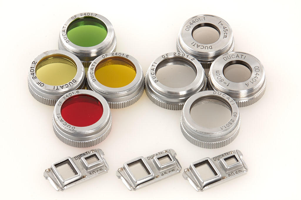 a fantastic outfit: Sogno body with Vitor 3.5/35mm no.07872 (cap, hood, OI 3401.5, everready case), Eltor 2/40mm no.21129 (both caps, maker's box), Lator 2.8/60mm no.34559 in direct mount for projection, 3 spools, original cable release adapter, film loader, viewer with papers in part of maker's box, original instruction book, close-up lenses for 45 + 80cm with finder masks in maker's boxes, finder mask for 30cm in maker's box, two soft focus lenses in maker's boxes, 4 different colour filters (2x yellow, red, green)