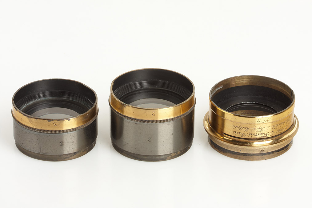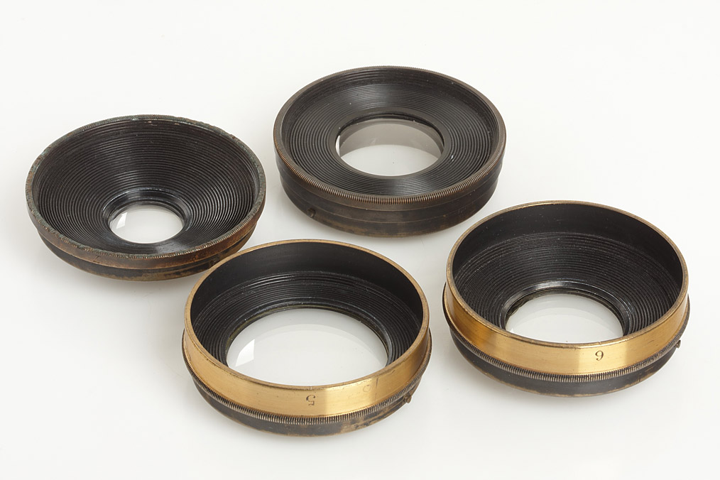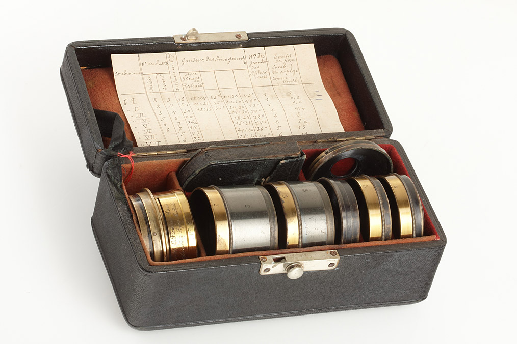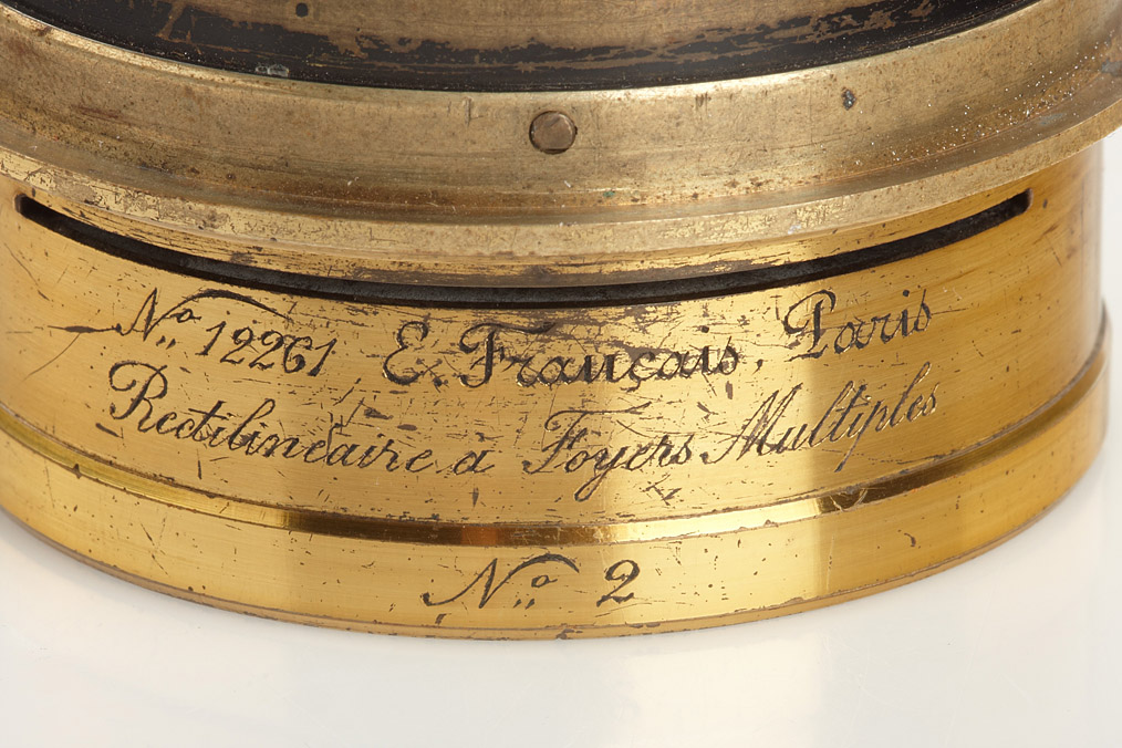 combination lens made by E. Francais of Paris, one brass tube and 6 accessory lenses, 8 waterhouse stops in their leather case. The tube is engraved 'Rectilinéaire á Foyers multiples 3', in good original condition, all in the original fitted leather covered box