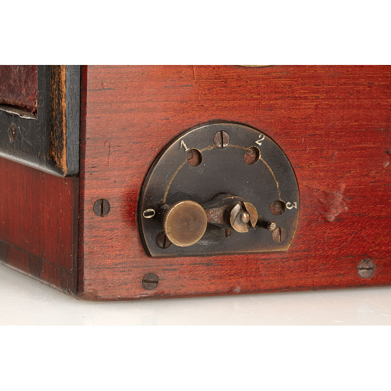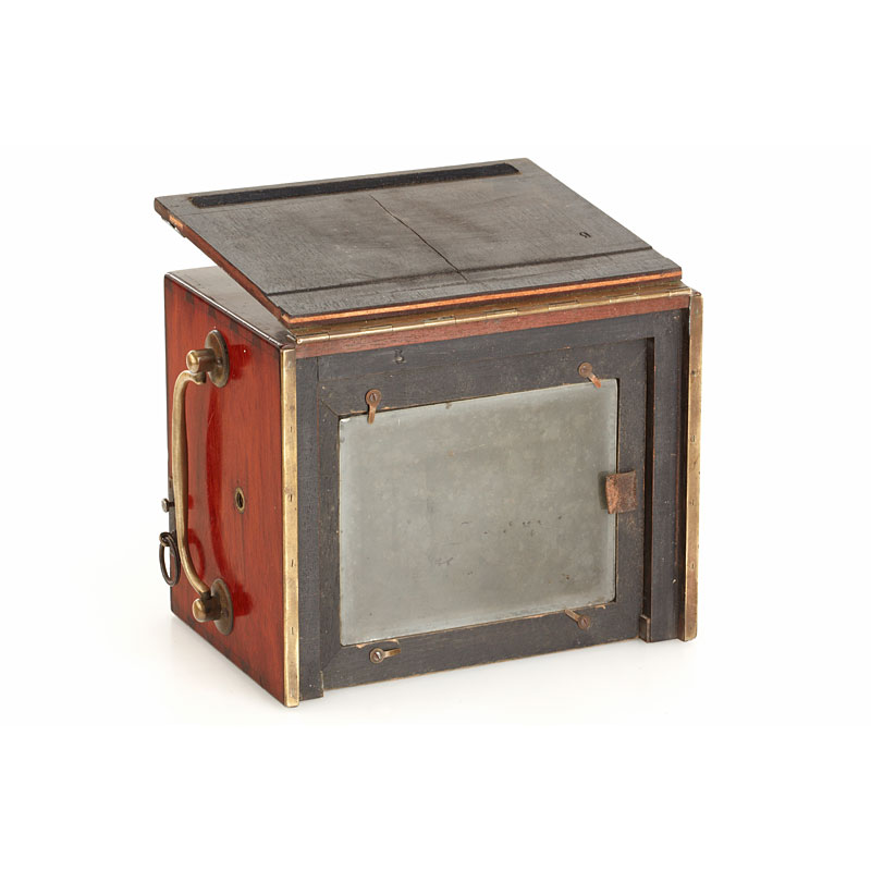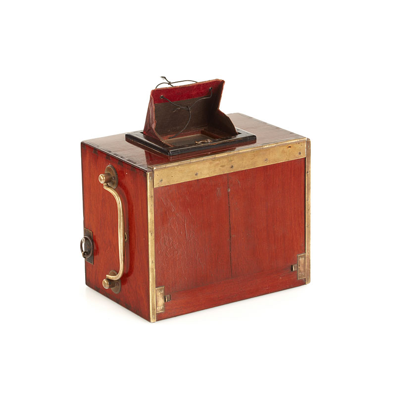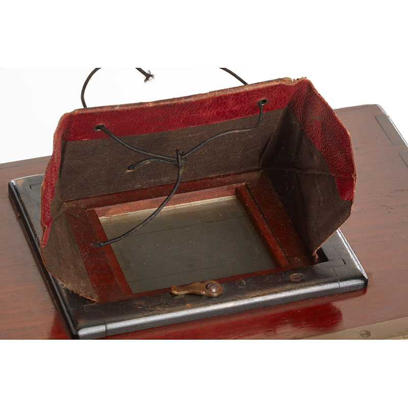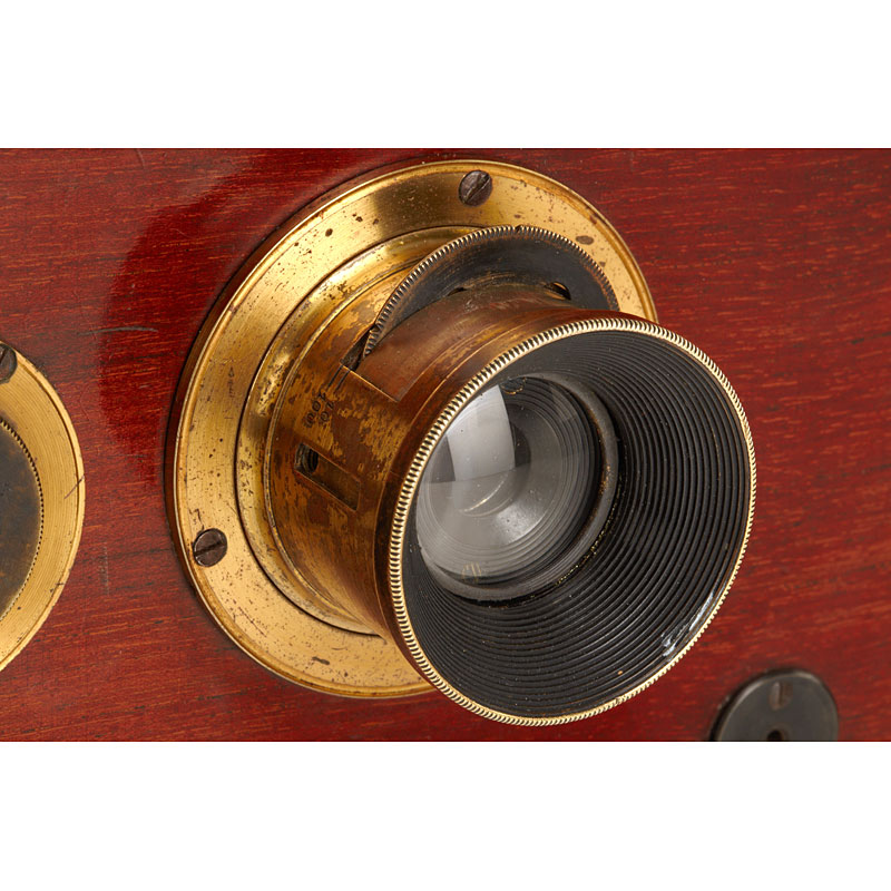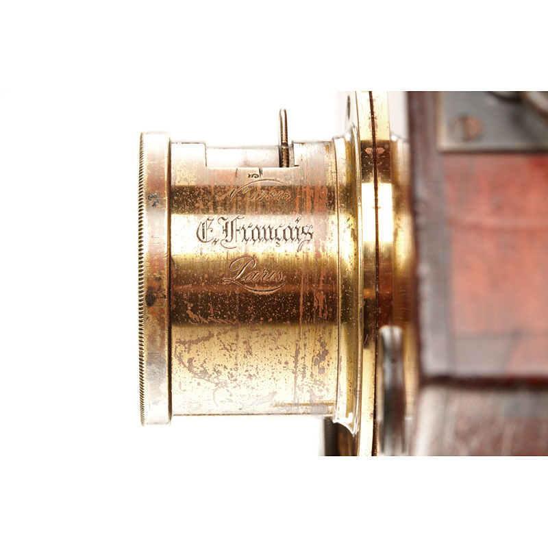 rare polished wood reflex camera with two reflex finders, E.Francais wide angle no.17845 with rotating aperture disc, rotary shutter, 4 original cassettes, in fitted case