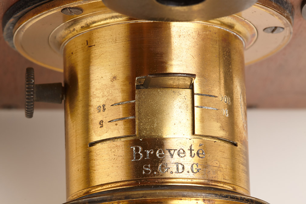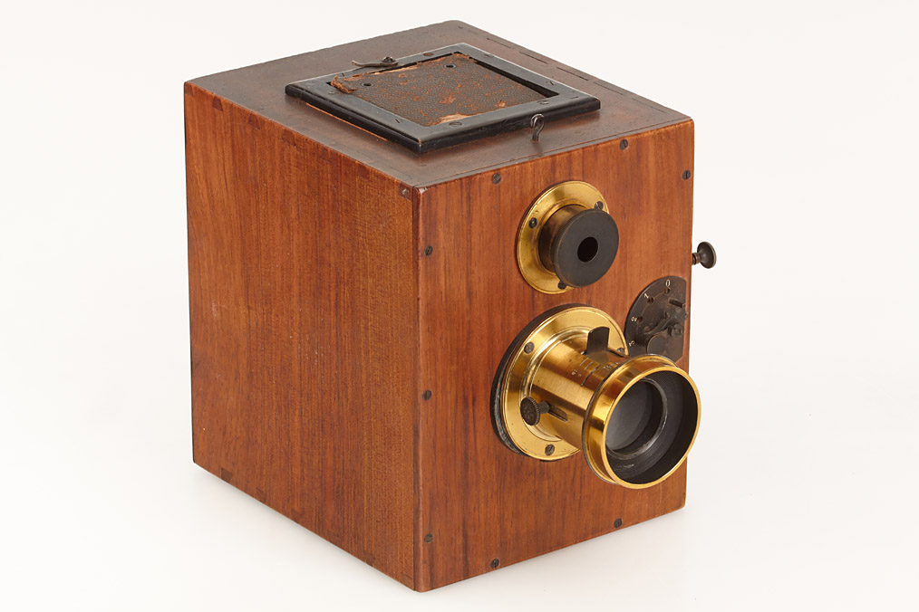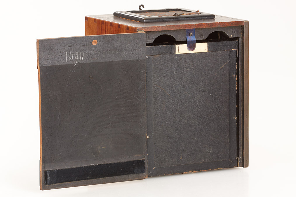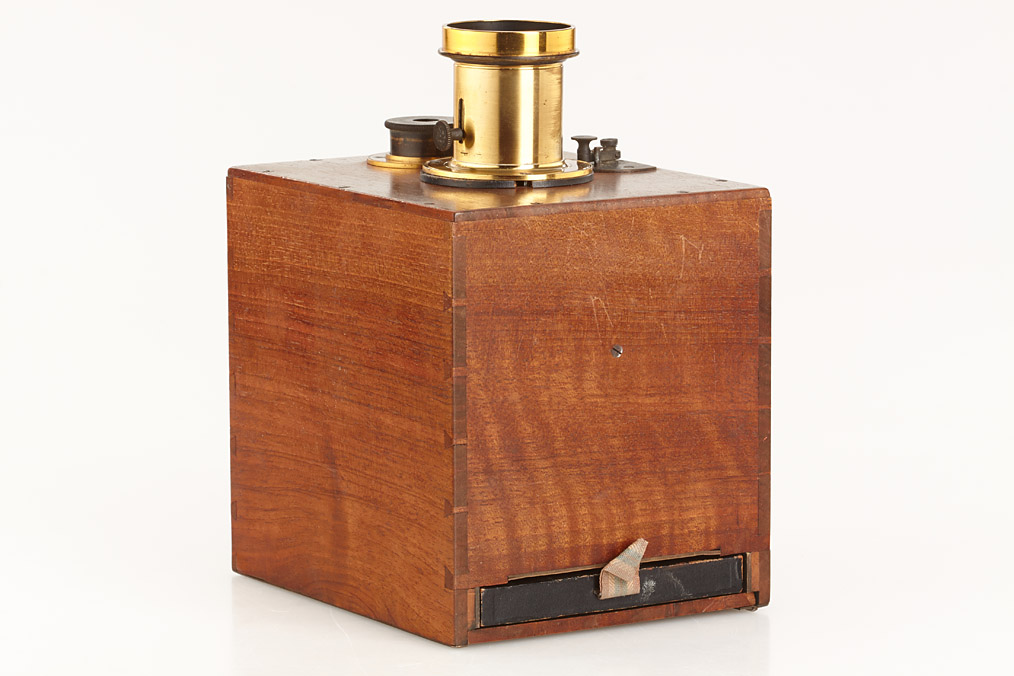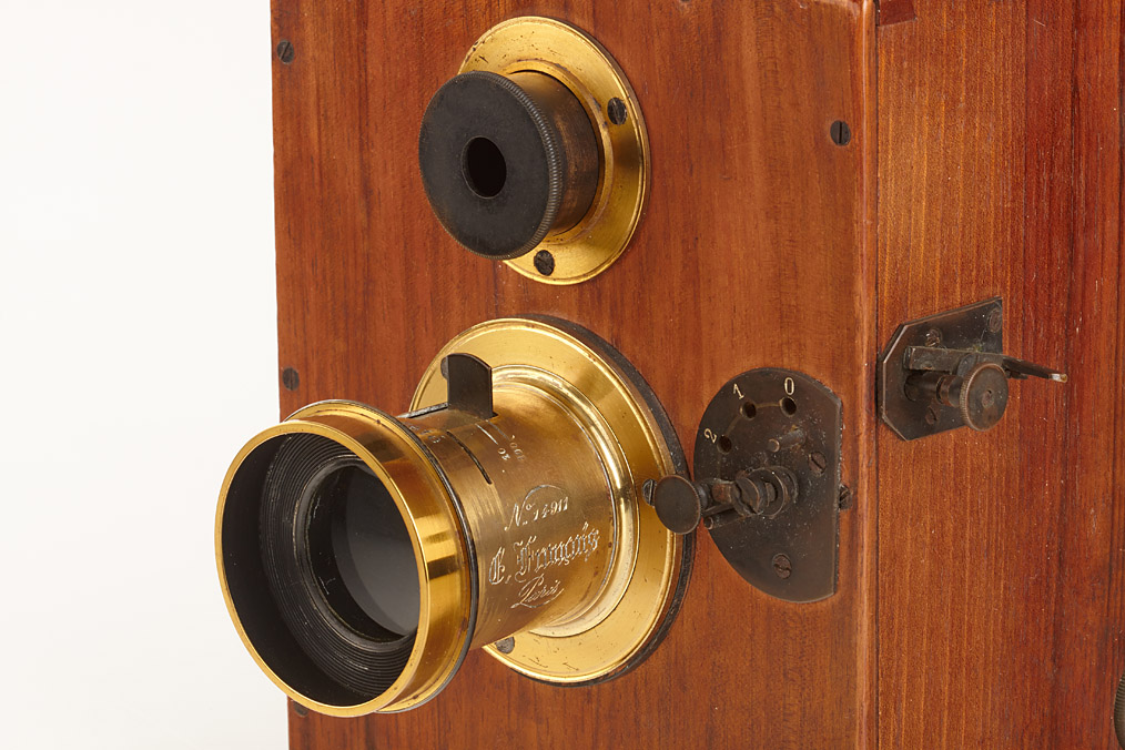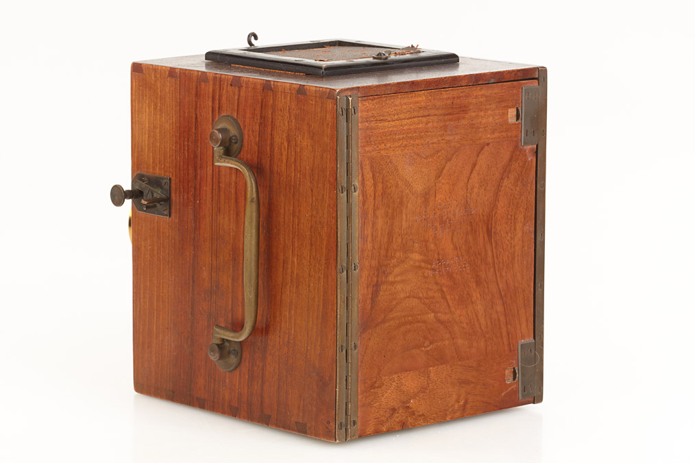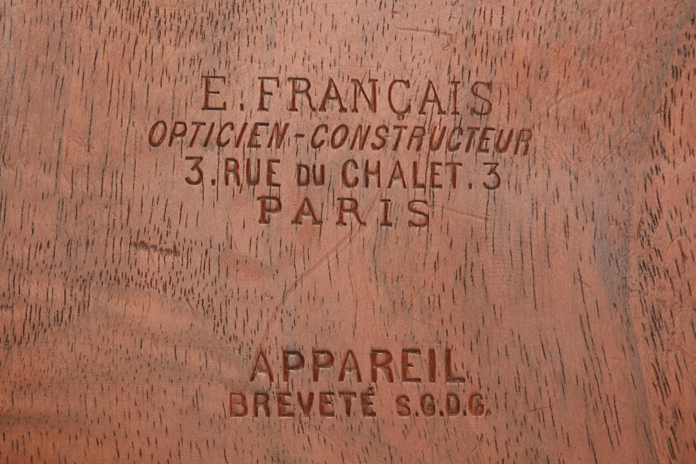 very rare polished wood reflex camera with reflex finder, E.Francais focusing lens no.14911 with for waterhouse stops (6 included, cap), rotary shutter, original cassette
