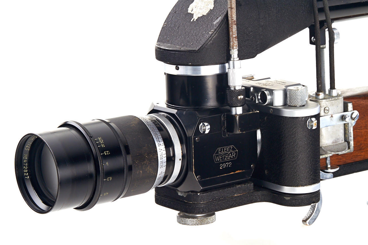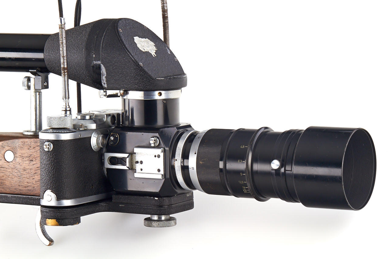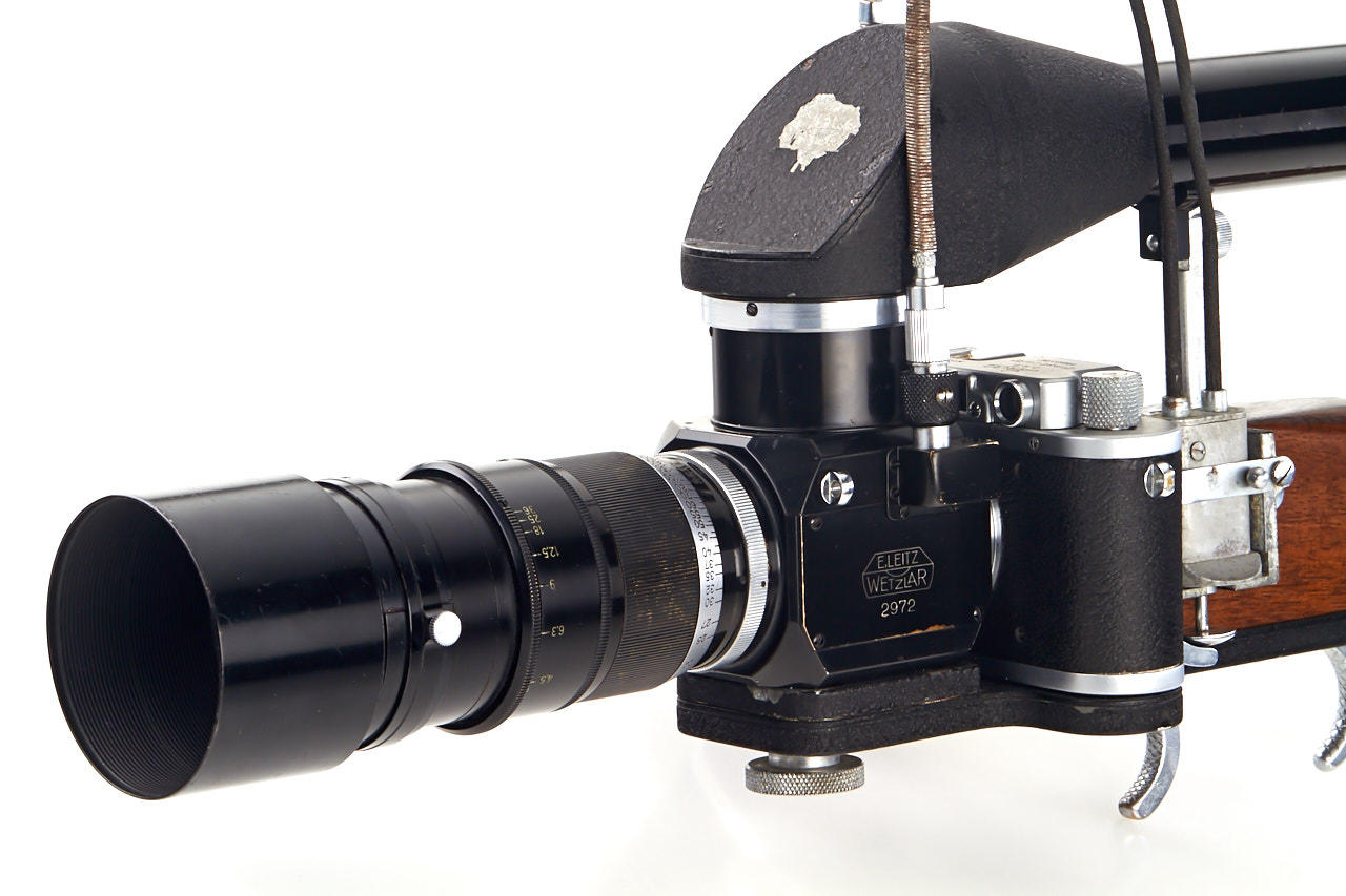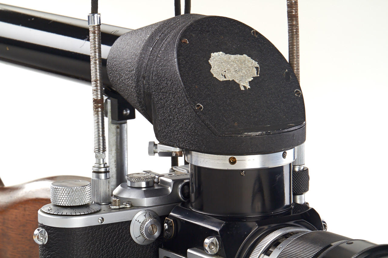 One of the most rare and unusual accessories in 100% original condition. Special viewfinder engraved with serial number 117 (see Lager VOL.III for no.116) + E.LEITZ INC. NEW-YORK, modified PLOOT mirror housing no. 2972, modified Leica IIIa no.230908 (1937), Telyt 4.5/20cm no.472827 in feet with hood and cap, complete with extremely rare carrying case RIFUN. The company E. Leitz, Inc. New York launched the Leica Gun Rifle in 1938 using the codeword “Rifle”; however, it was only produced for one year (1938 to 1939). The “Rifle” was inspired by Commander Attilio Gatti, the well-known wildlife photographer in Africa and was developed between 1935 and 1937 by E. Leitz, Inc. New York, before being introduced to the public in July 1938. Various authors differ in their estimates about the actual numbers of “Rifles” produced: while P. H. Hasbroeck assumes that only six units were produced, J. L. Lager concludes that a dozen were made overall. We consider a number of 12-14 “Rifles”, spread out today over collections worldwide, to be appropriate and realistic.