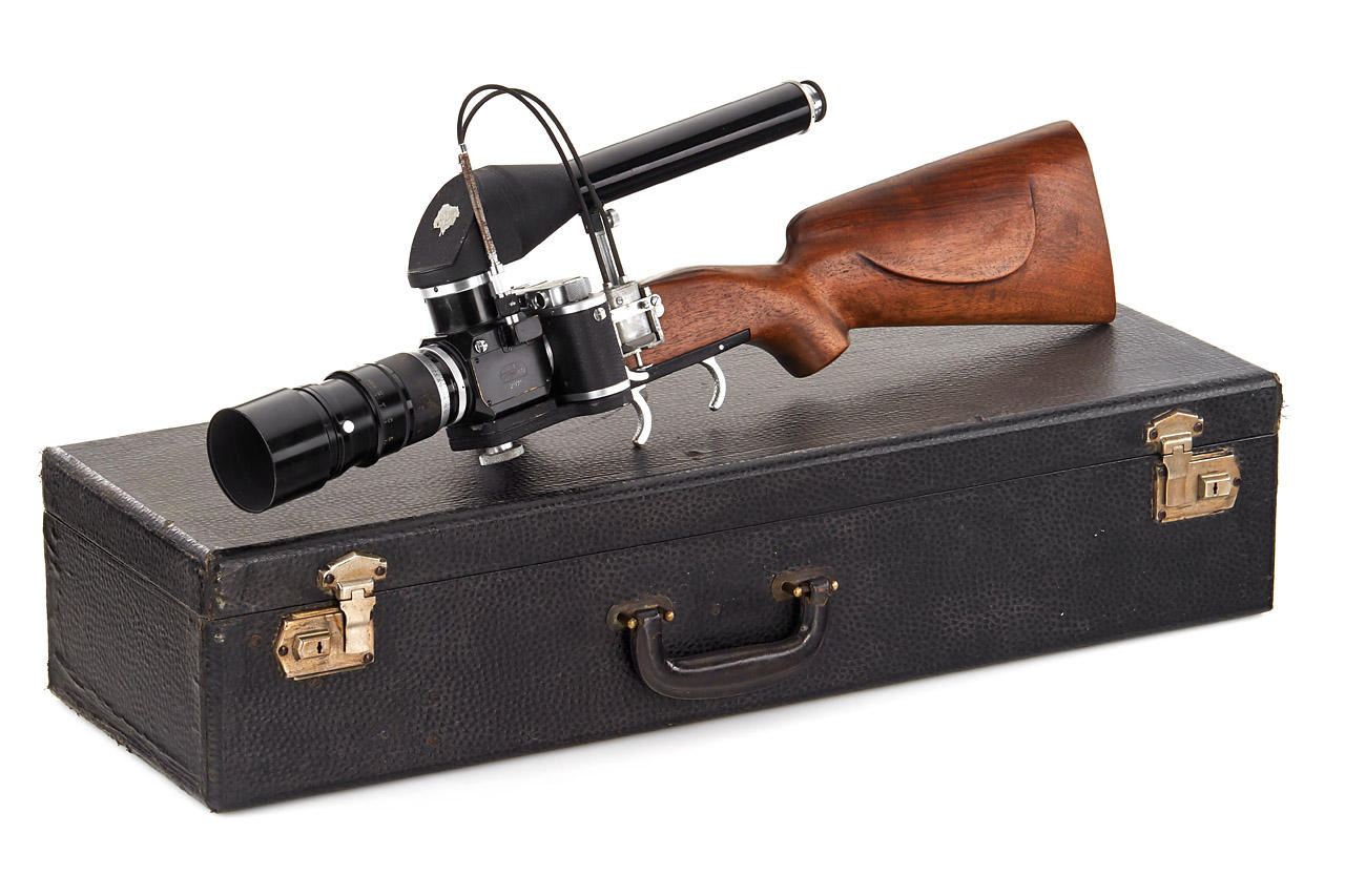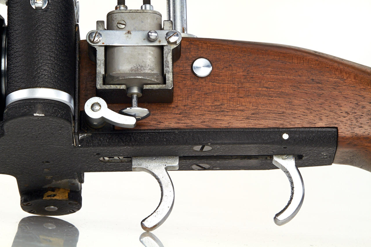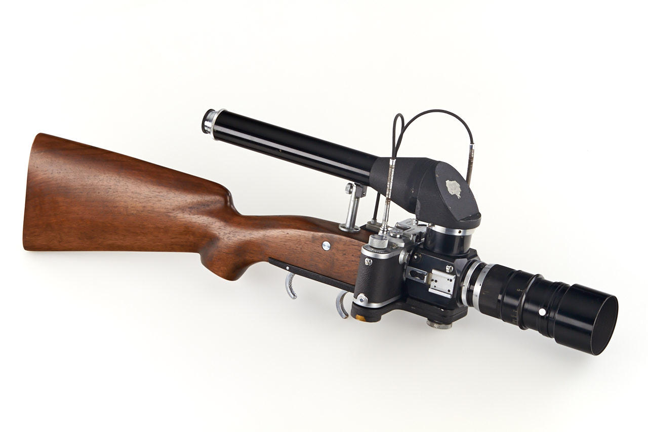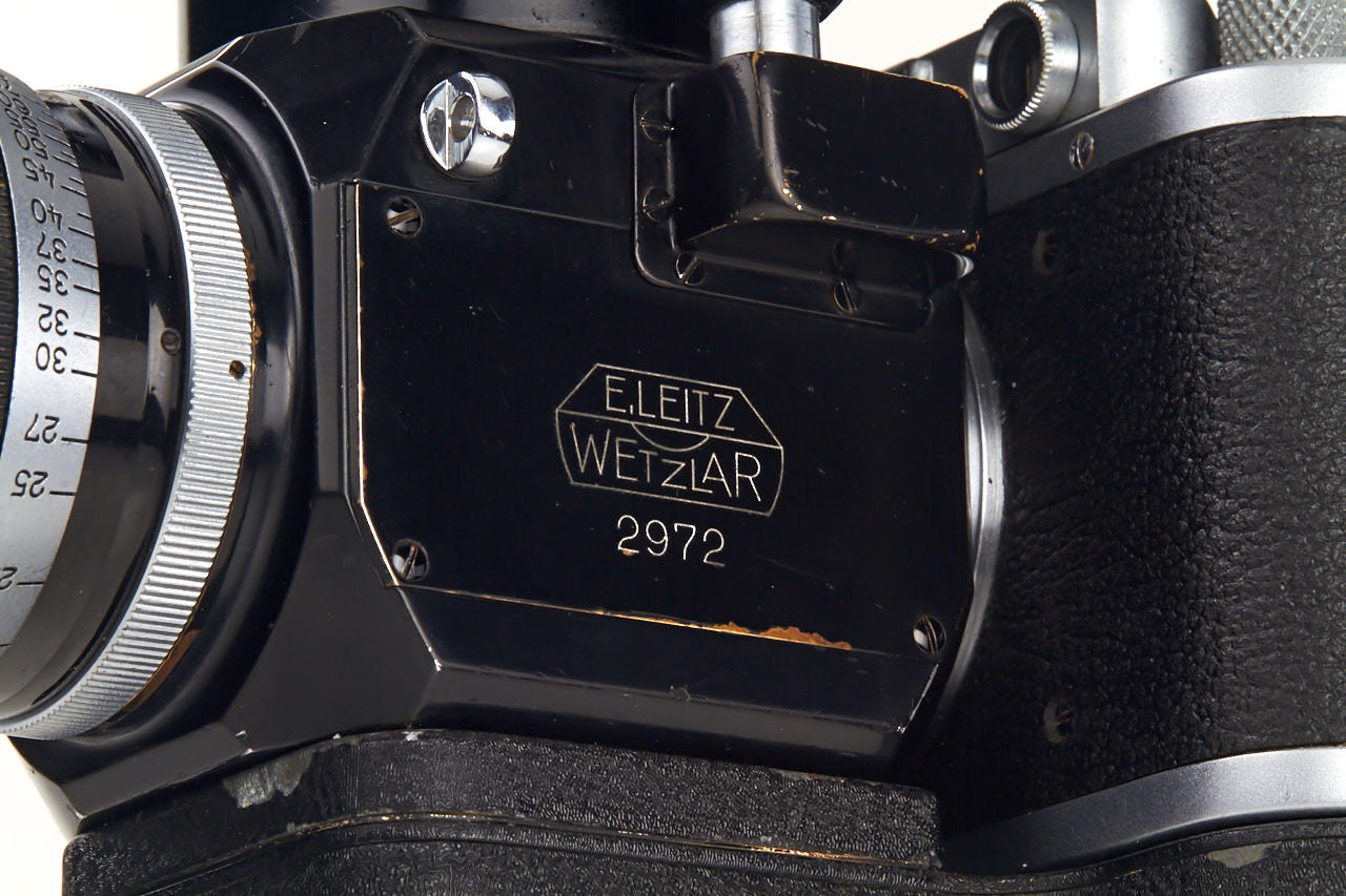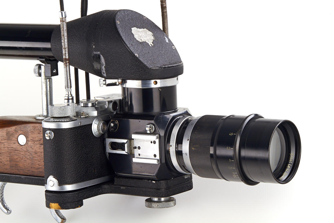 One of the most rare and unusual accessories in 100% original condition. Special viewfinder engraved with serial number 117 (see Lager VOL.III for no.116) + E.LEITZ INC. NEW-YORK, modified PLOOT mirror housing no. 2972, modified Leica IIIa no.230908 (1937), Telyt 4.5/20cm no.472827 in feet with hood and cap, complete with extremely rare carrying case RIFUN. The company E. Leitz, Inc. New York launched the Leica Gun Rifle in 1938 using the codeword “Rifle”; however, it was only produced for one year (1938 to 1939). The “Rifle” was inspired by Commander Attilio Gatti, the well-known wildlife photographer in Africa and was developed between 1935 and 1937 by E. Leitz, Inc. New York, before being introduced to the public in July 1938. Various authors differ in their estimates about the actual numbers of “Rifles” produced: while P. H. Hasbroeck assumes that only six units were produced, J. L. Lager concludes that a dozen were made overall. We consider a number of 12-14 “Rifles”, spread out today over collections worldwide, to be appropriate and realistic.
