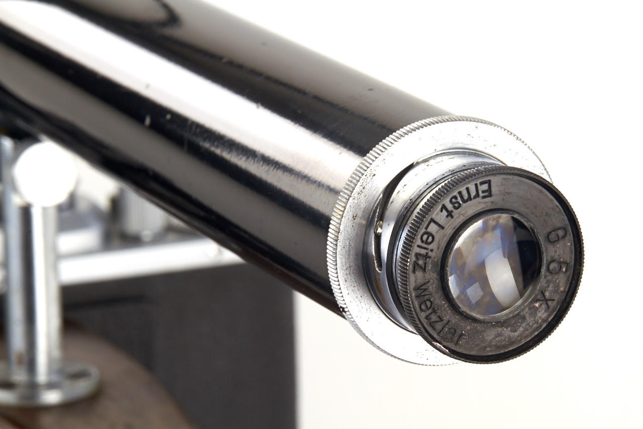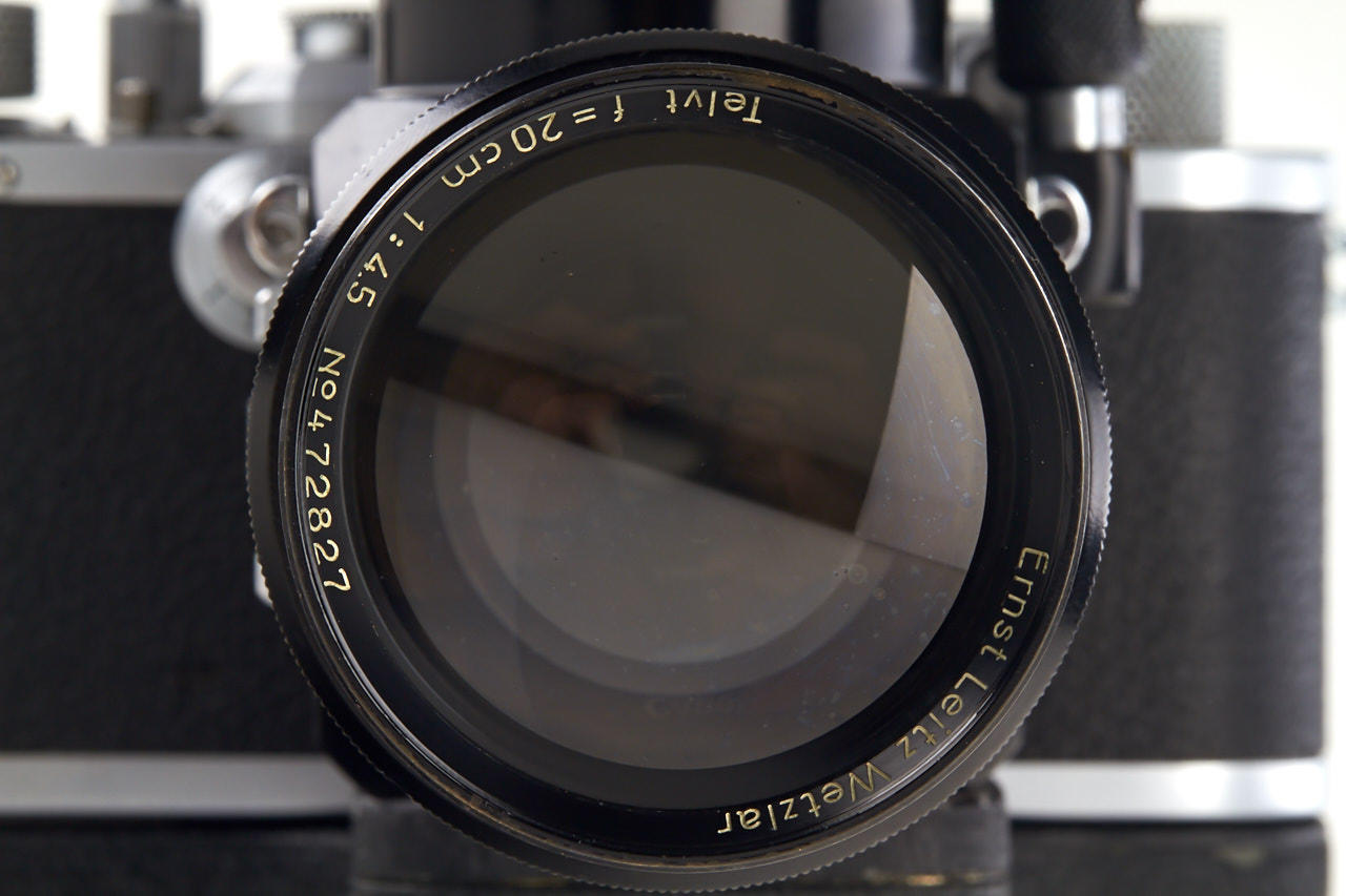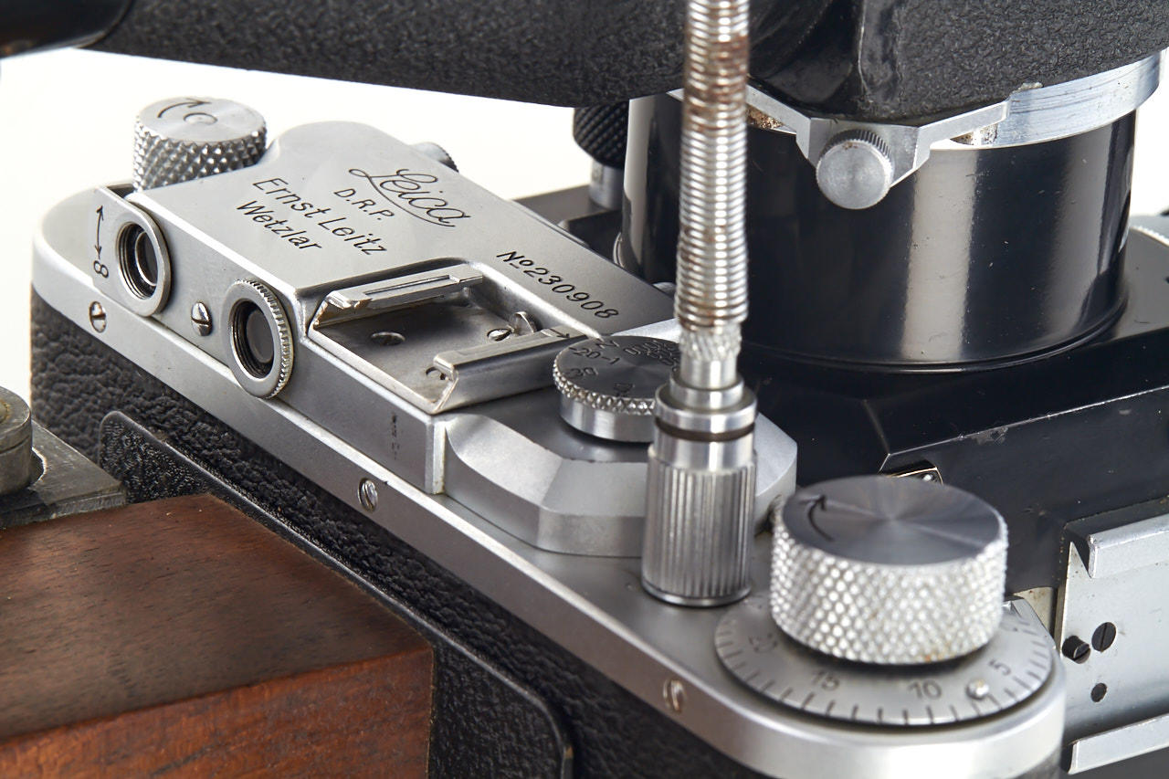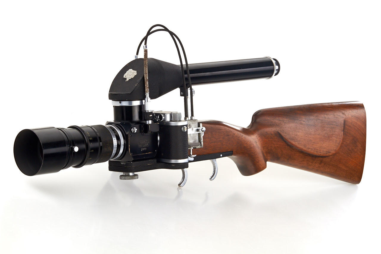 One of the most rare and unusual accessories in 100% original condition. Special viewfinder engraved with serial number 117 (see Lager VOL.III for no.116) + E.LEITZ INC. NEW-YORK, modified PLOOT mirror housing no. 2972, modified Leica IIIa no.230908 (1937), Telyt 4.5/20cm no.472827 in feet with hood and cap, complete with extremely rare carrying case RIFUN. The company E. Leitz, Inc. New York launched the Leica Gun Rifle in 1938 using the codeword “Rifle”; however, it was only produced for one year (1938 to 1939). The “Rifle” was inspired by Commander Attilio Gatti, the well-known wildlife photographer in Africa and was developed between 1935 and 1937 by E. Leitz, Inc. New York, before being introduced to the public in July 1938. Various authors differ in their estimates about the actual numbers of “Rifles” produced: while P. H. Hasbroeck assumes that only six units were produced, J. L. Lager concludes that a dozen were made overall. We consider a number of 12-14 “Rifles”, spread out today over collections worldwide, to be appropriate and realistic.