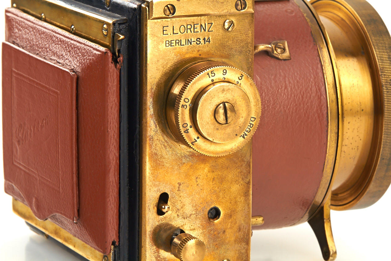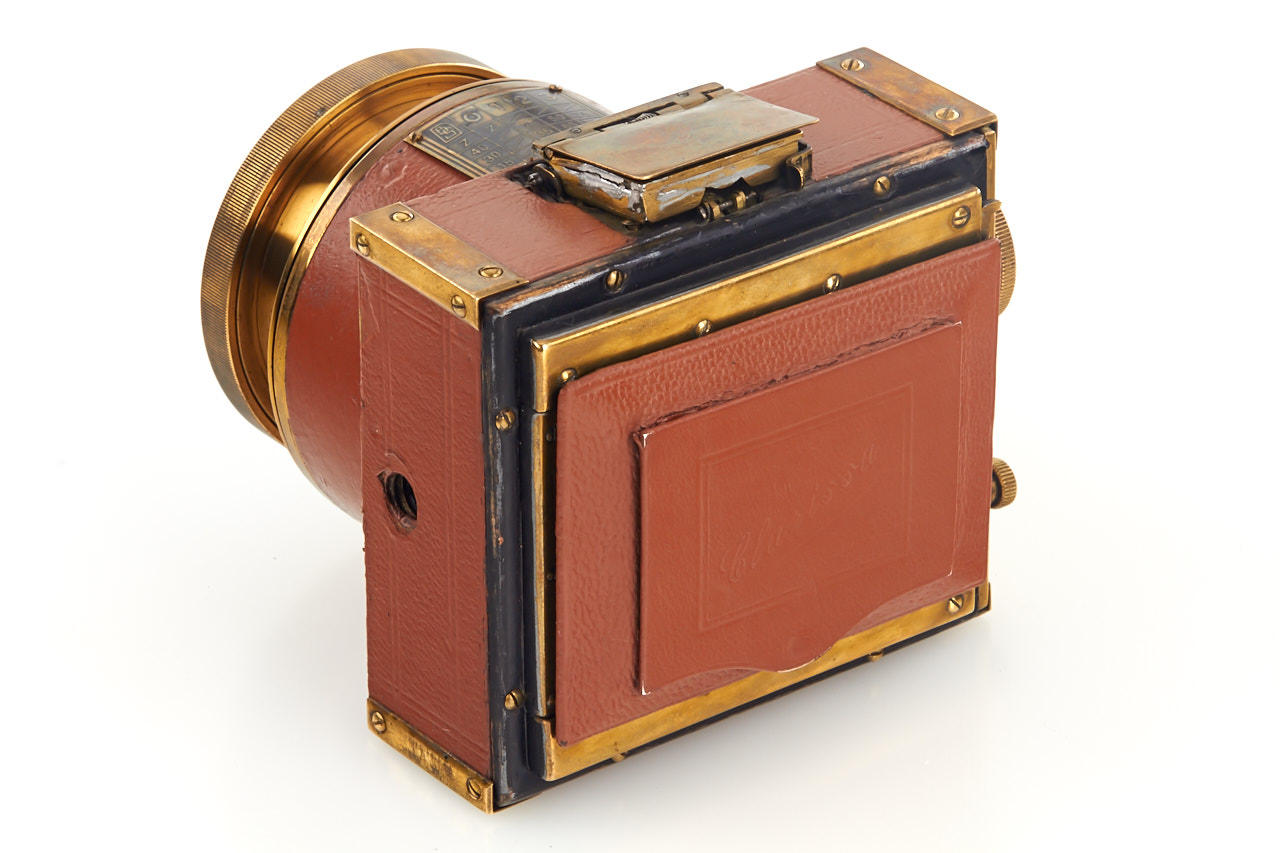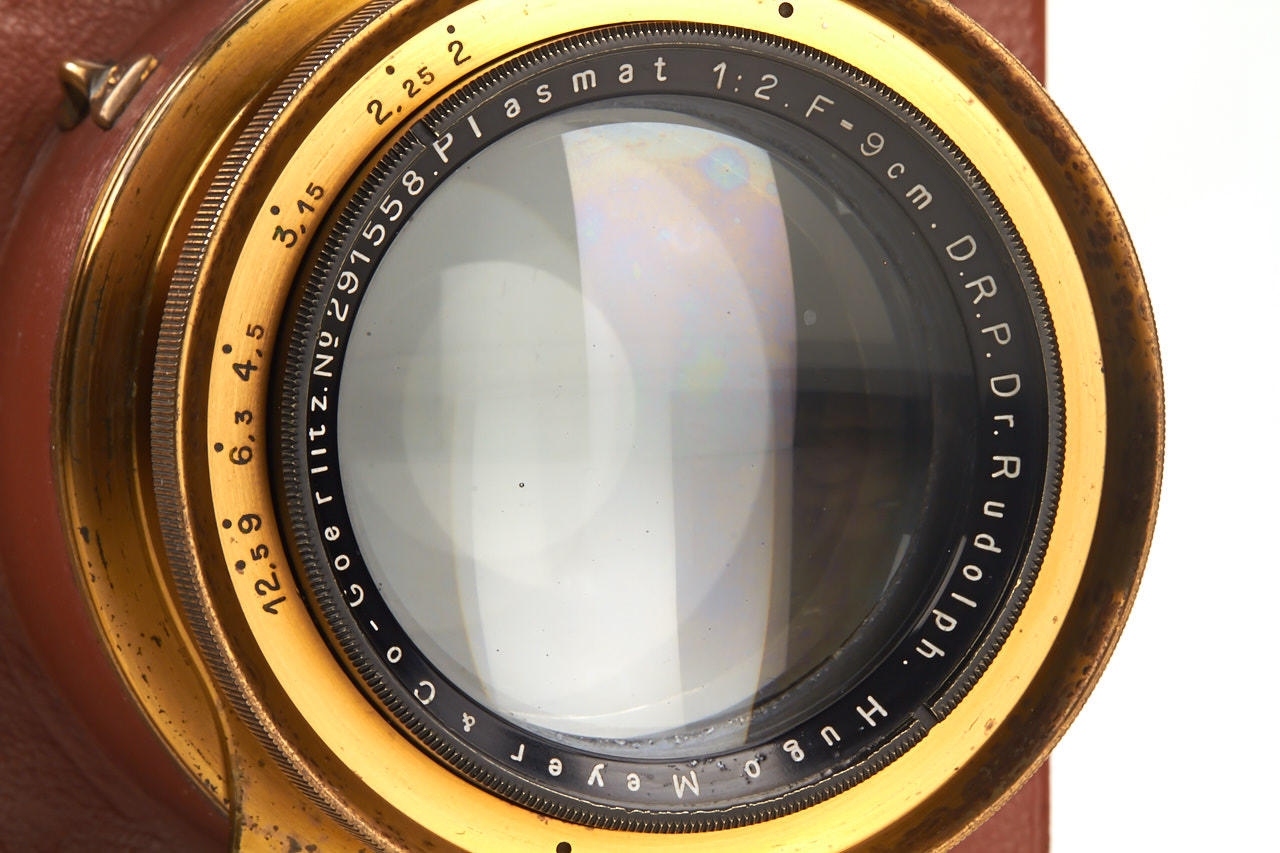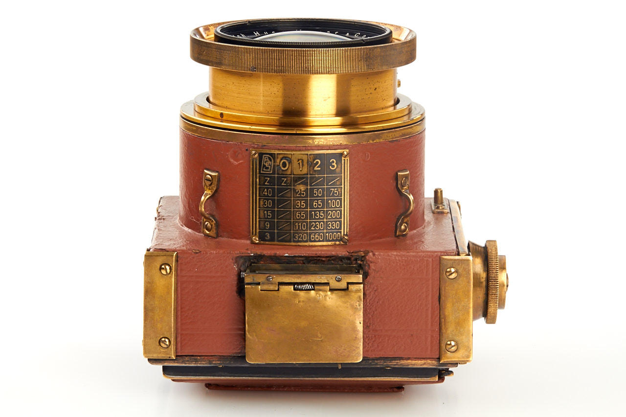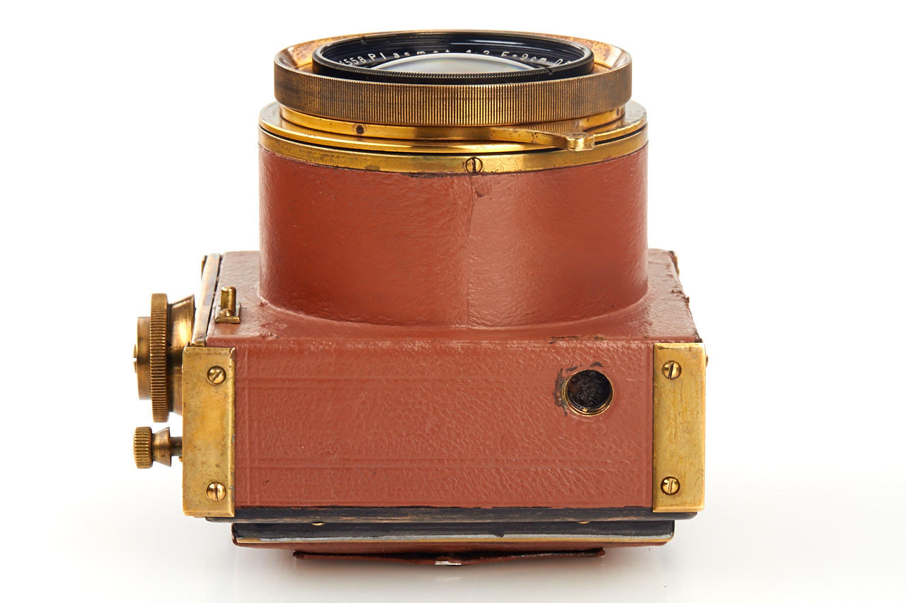 4,5x6cm tropical camera with original brown leather covering (with some restauration work), brass fittings, focal plane shutter (needs repair), fast 2/9cm Plasmat no.291558 (very rare lens with clean optics), only three of this luxus Ermanox copies are known to exist