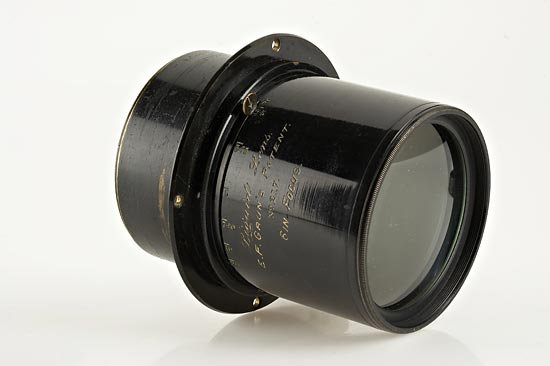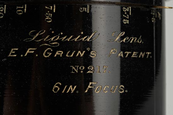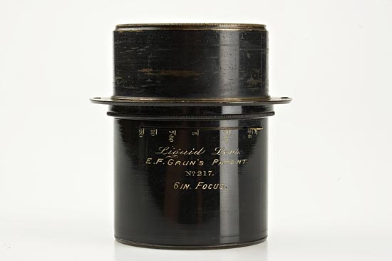 English, the black enamelled brass lens engraved in white "Liquid Lens, E.F. Grun's Patent, No.217, 6" Focus" and aperture scale from f/2.5 to f/20, the rear space between the elements filled with a light green colored oil. Ex Spira Collection. Four other lenses are known to exist with serial numbers 202, 206, 208 and 239. In 1901, Dr. Edward F. Grün of Brighton, England, patented (Brit. Pat. 6,194/01; U.S. Pat. 695,606) a lens of the Petzval type in which the two rear elements were separated by a layer of oil in place of air. The doctor, knowing little about optics, assumed that this would improve the lens in a way similar to the way the oil-immersion microscope lens functions. It did, however, not perform even as well as a conventional Petzval lens of the same focal length and aperture. Desptie extensive initial publicity, sales were minimal and by 1903 the lens had apparently been discontinued.
