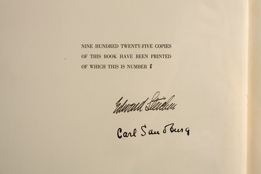 A crisp copy with brigth and beautiful gilt embossment, limited edition of 925 copies, edition no. 8/925, signed by Steichen and Sandburg, 49 full-page sepia photographs, 31 x 24 cm A sumptuous book which includes a broad and cleverly sequenced array of Steichen's work. When the book was published Steichen was probably the most famous and best paid photographer in America. (A.Roth)