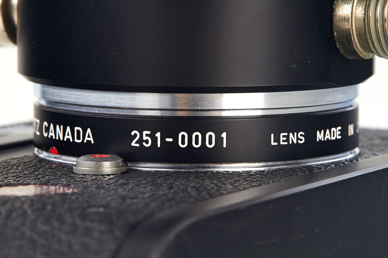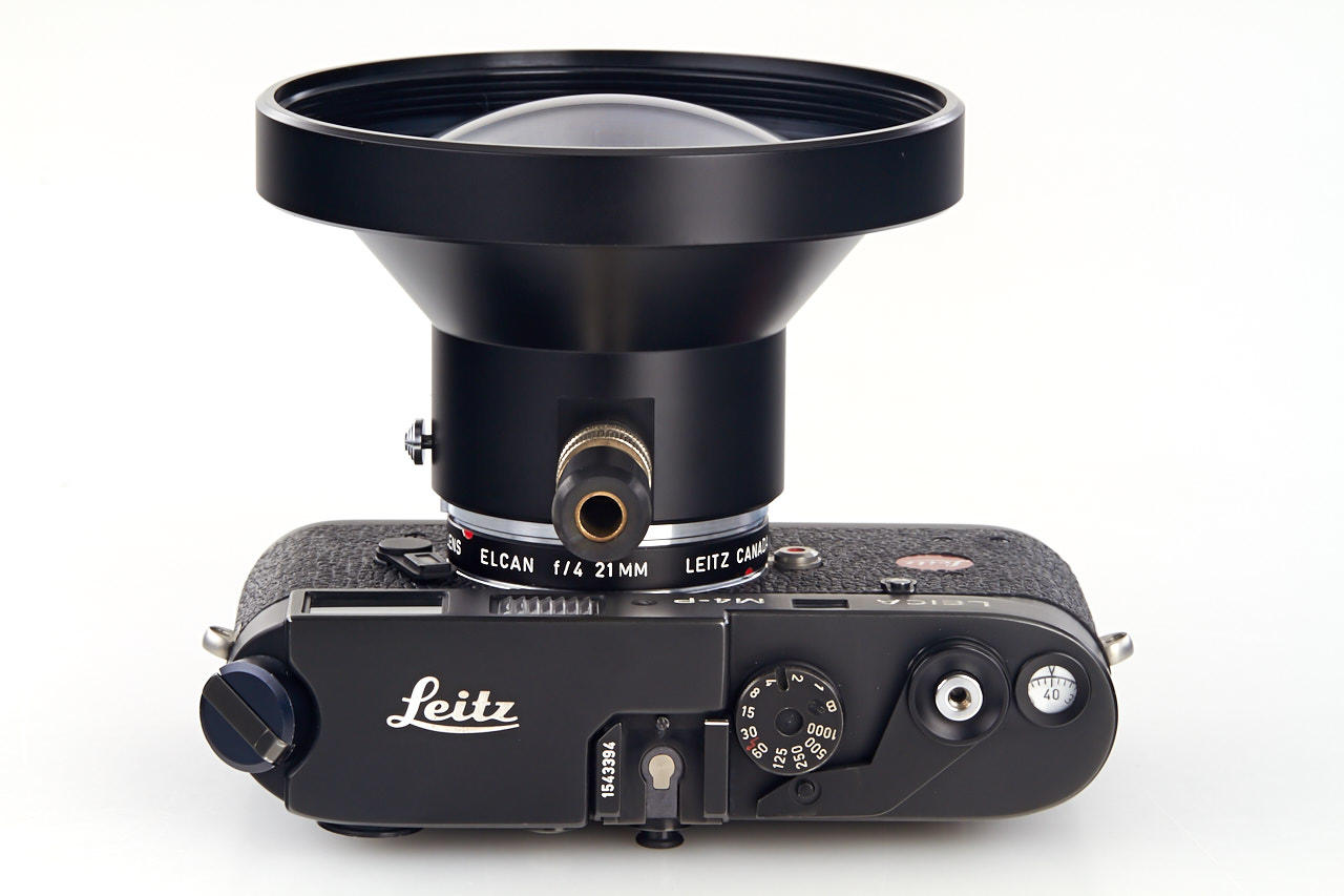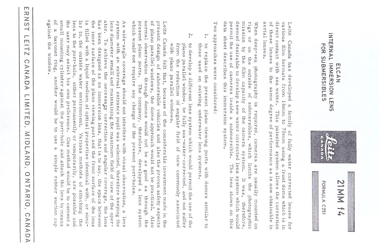 prototype ELCAN 21mm lens formula 251 internal immersion lens for submersibles, complete with lens adapter and Leica M4-P no.1543394 and the original data sheet by Leitz Canada, this is the first of very few prototype lenses produced (no.251-0002 is also known to exist)