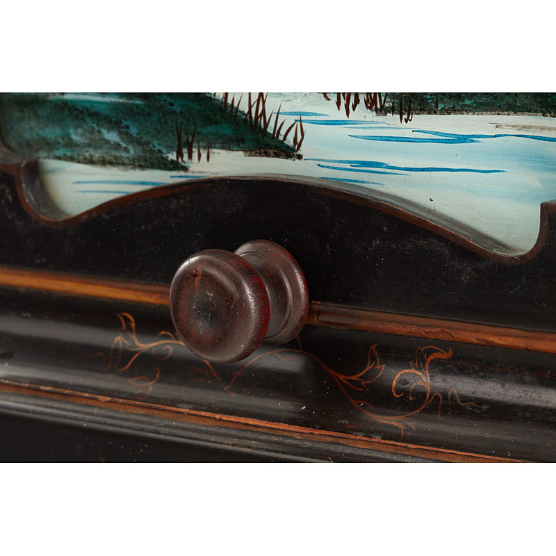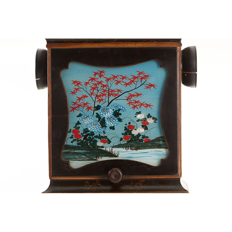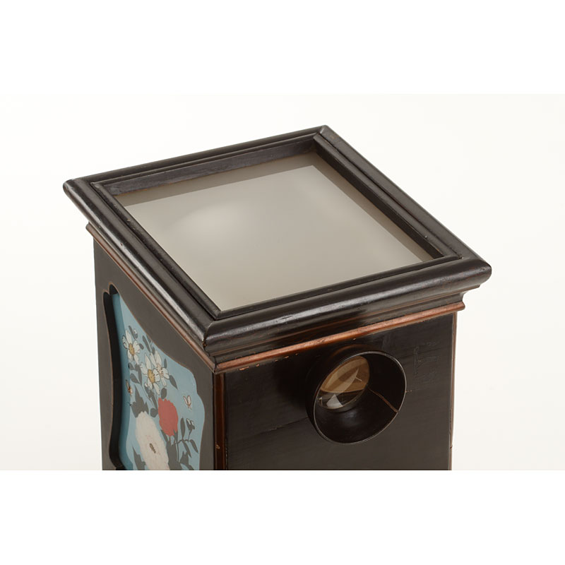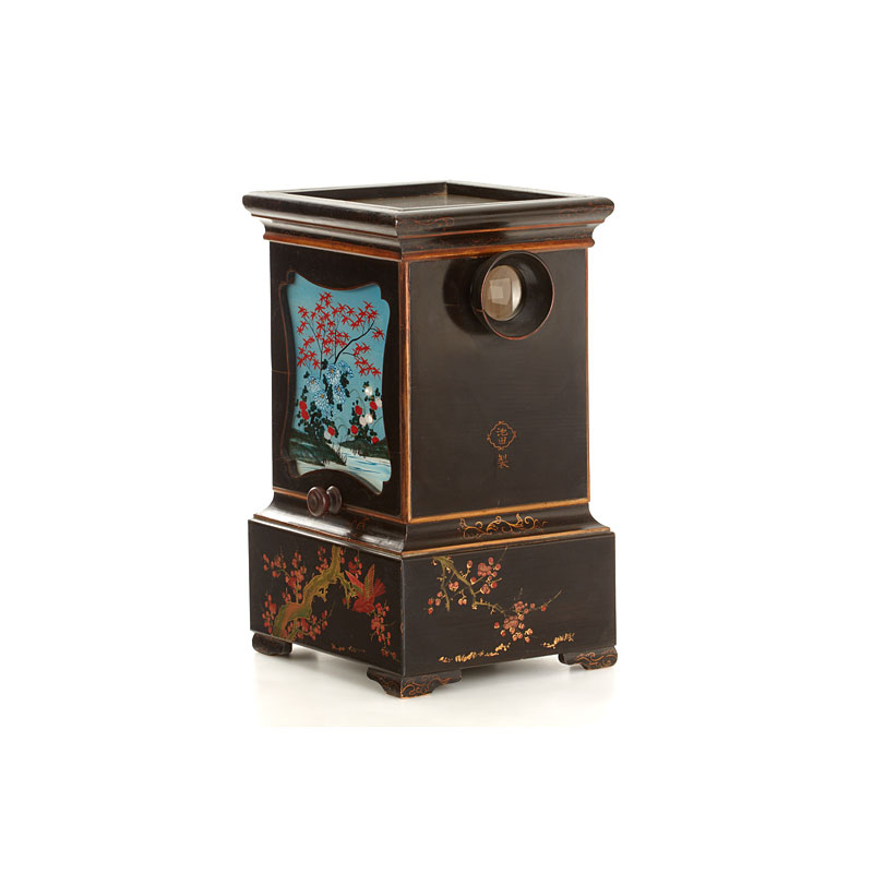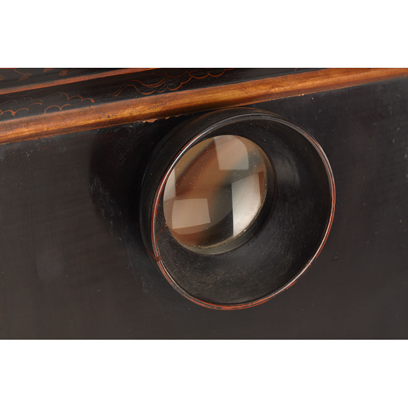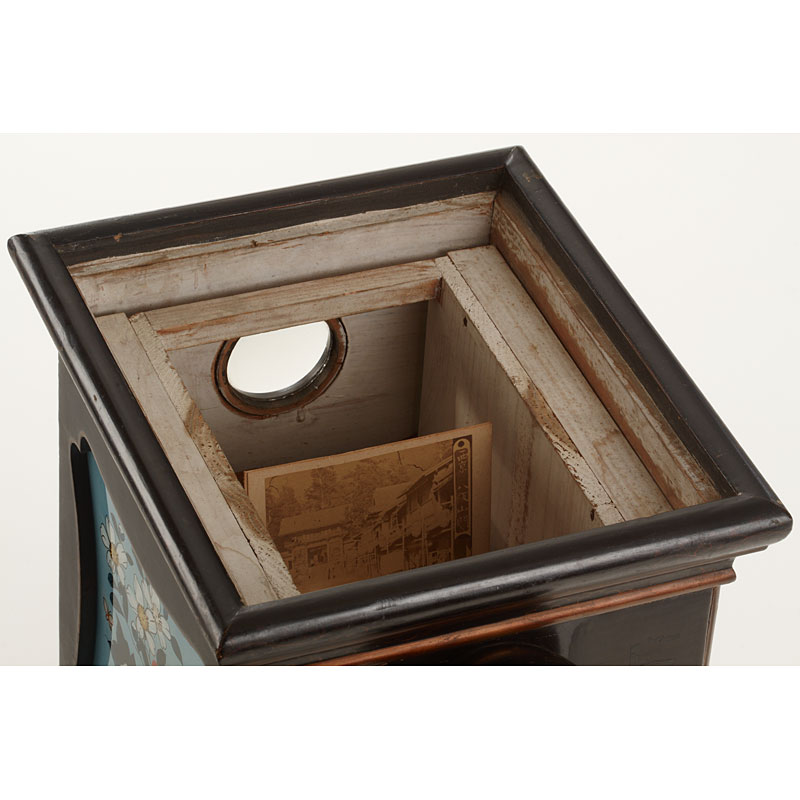 Japanese lacquer body, decorated with birds and flowers, two painted glass decorated panels to the sides. Fitted with two viewing lenses for simultaneous viewing. Internal bell and winding handle. Inside the viewer contains fifty 85 x 55mm pairs of albumen prints mounted back to back. 39.5cm high.
