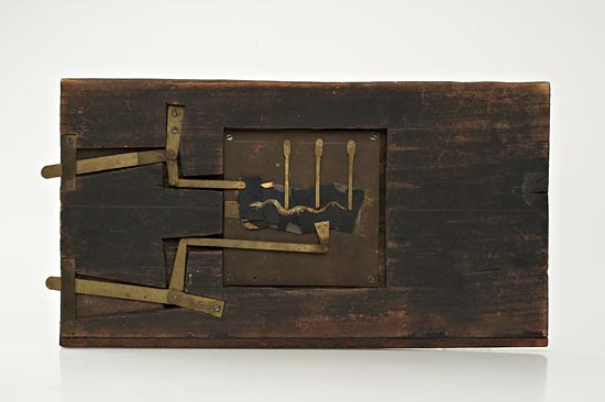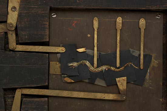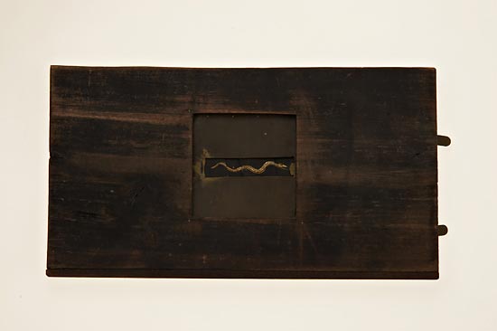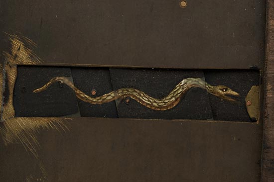 probably French, double action, the black painted pine frame, 5½ x 10", with a 3¼ x 3¼" opening in which is mounted a brass plate with a ½ x 2¼" aperture. In the aperture is a snake composed of five separate hand-painted sections on a transparent material (possibly thin slices of bone). A brass lever at the side connects to a linkage which causes the snake to move with a separate lever to control the head movement. A rare early magic lantern slide. Ex Spira Collection