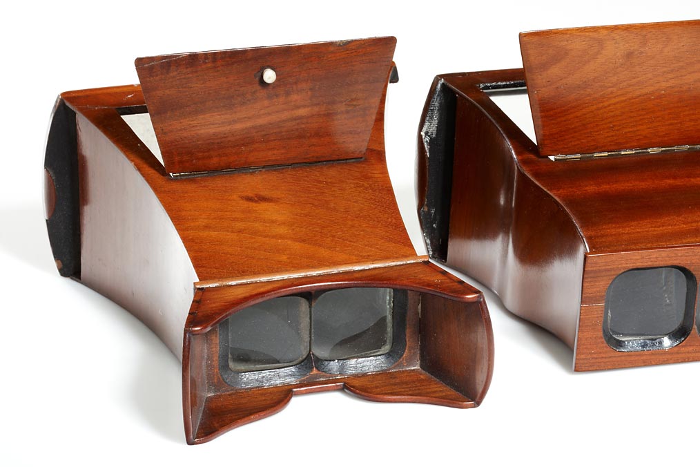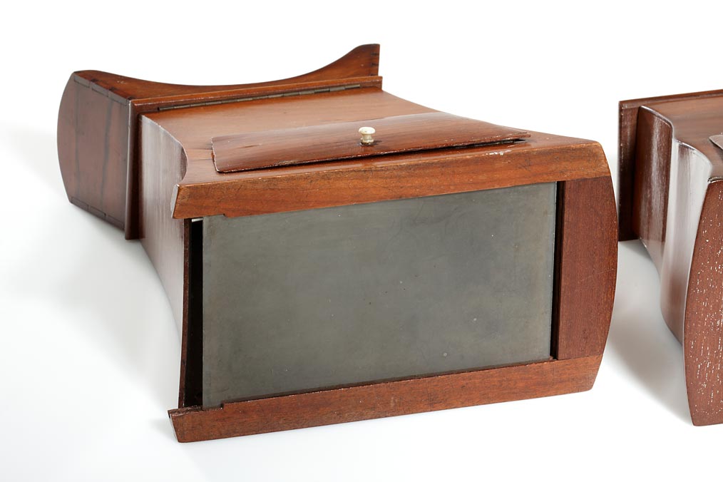 selection of three different types of early wooden stereoscopes dating from 1855-1870, (1) Brewster type stereoscope with square lenses and wooden visor, hinged mirror with knob made of bone, a piece of wood is missing of the frame which holds the ground glass, otherwise in good condition, (2) Lyra-shaped Brewster type viewer with square cut lenses, hinged mirror, in good condition, (3) Claudet type with turned wooden eyepieces and ivory knob, ground glass is missing. Although not all of the viewers are in perfect condition, this is a great opportunity to purchase an exclusive selection of vintage viewers. (3)