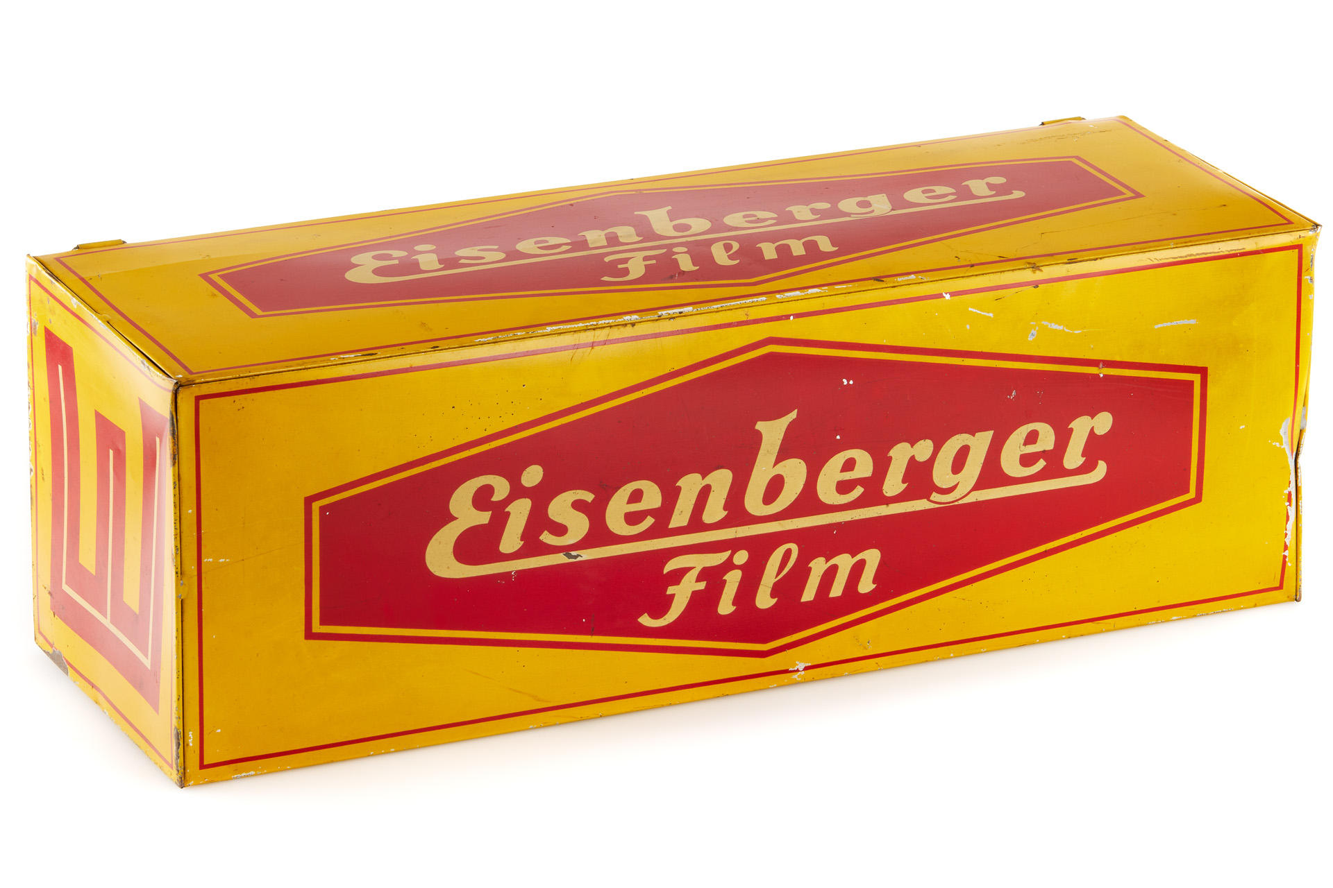 an uncommon oversized metal film box, c. 73x24x24cm, with a few dings, but still attractive