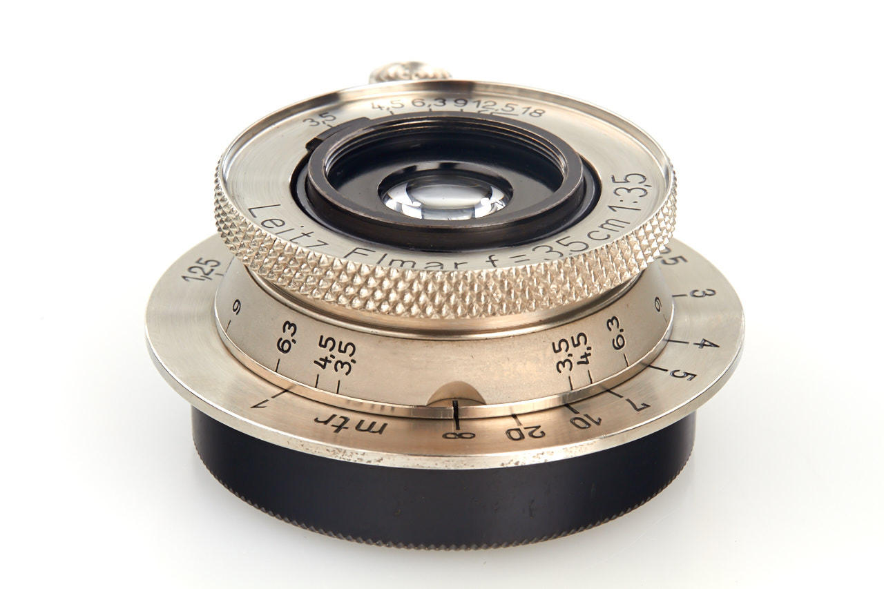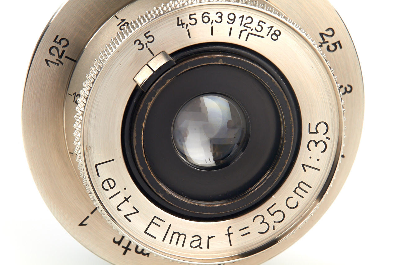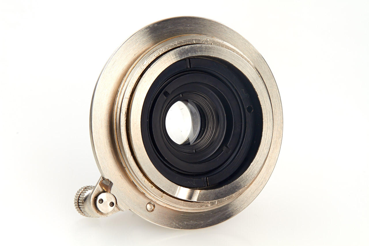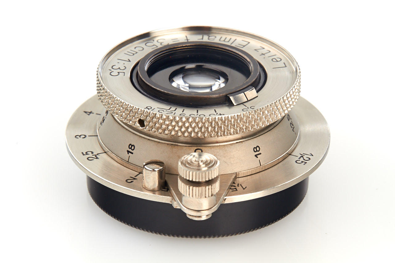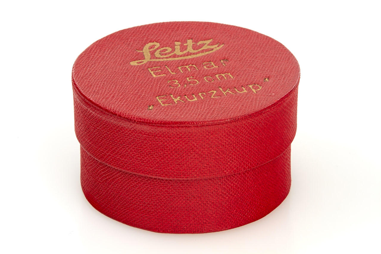 unnumbered nickel coupled Elmar in beautiful, near mint condition, with original front and rear cap and 'Ekurzkup' red maker's box, very hard to find in such condition