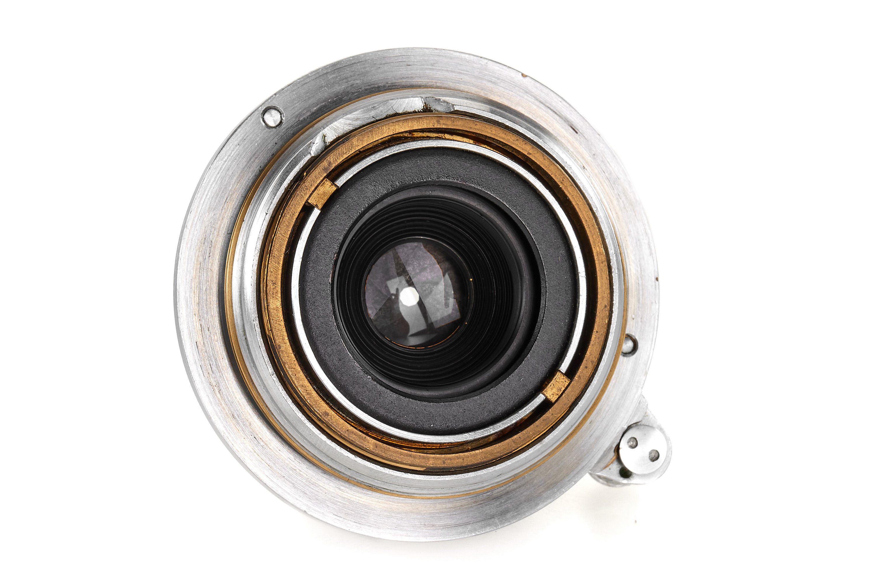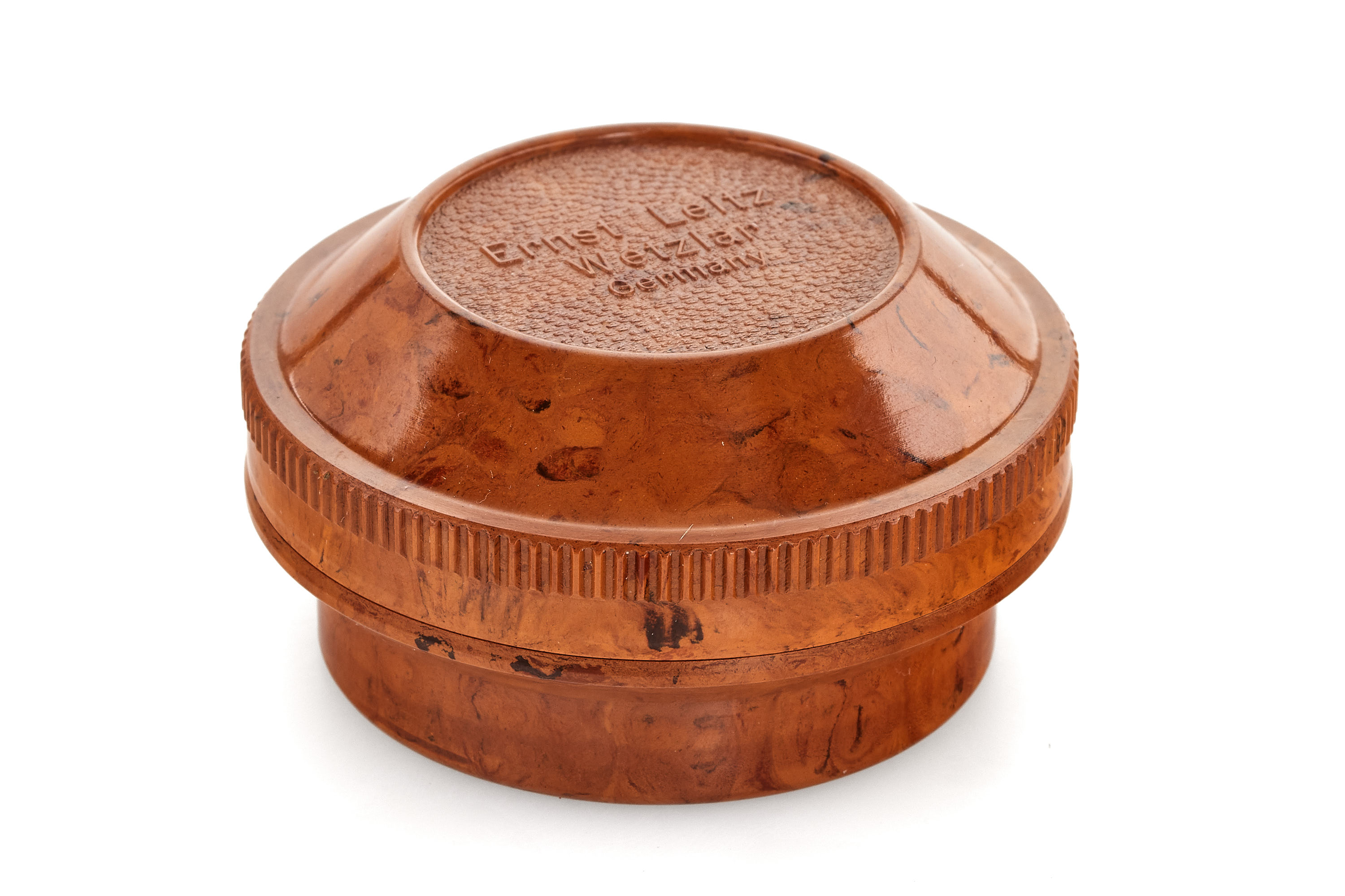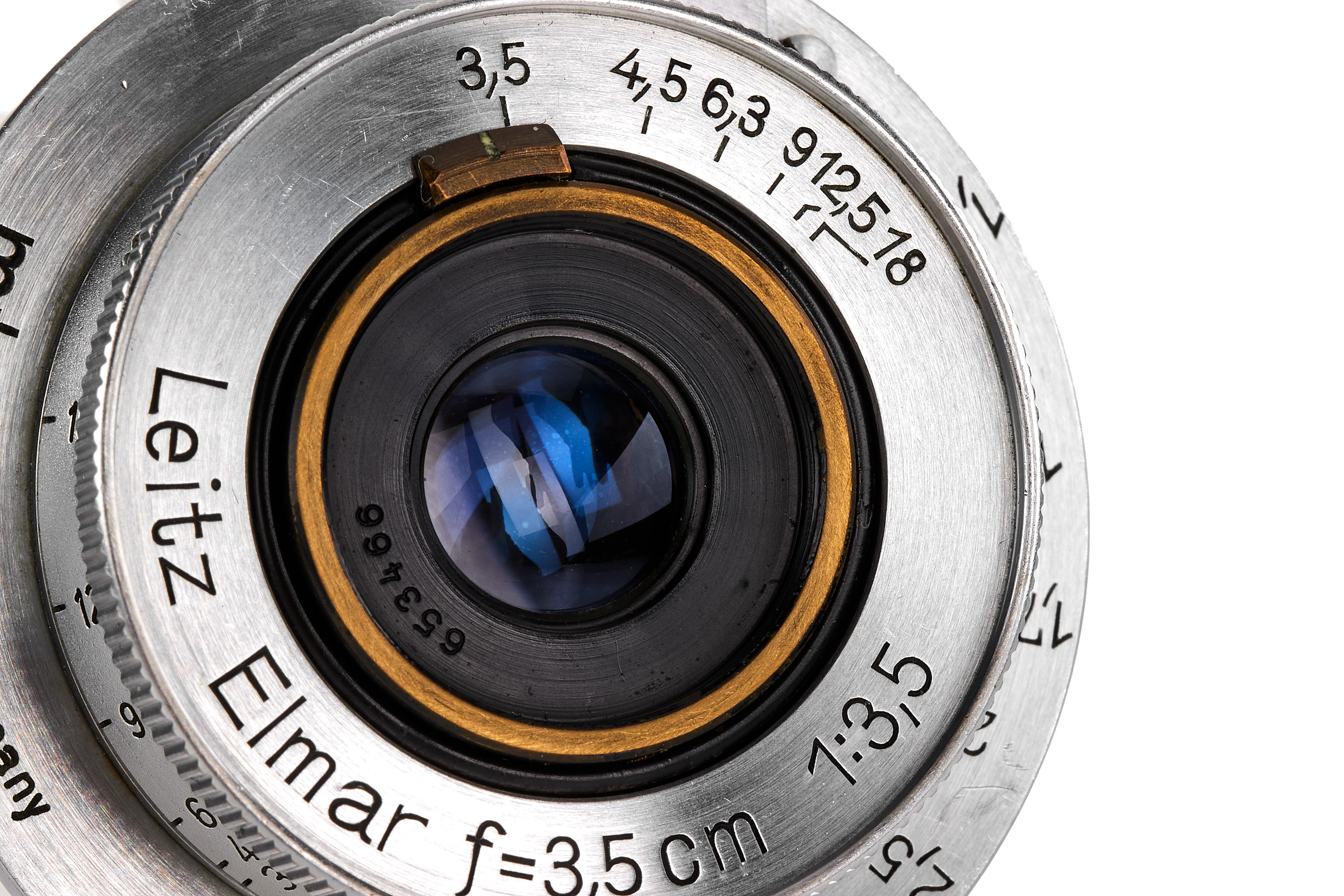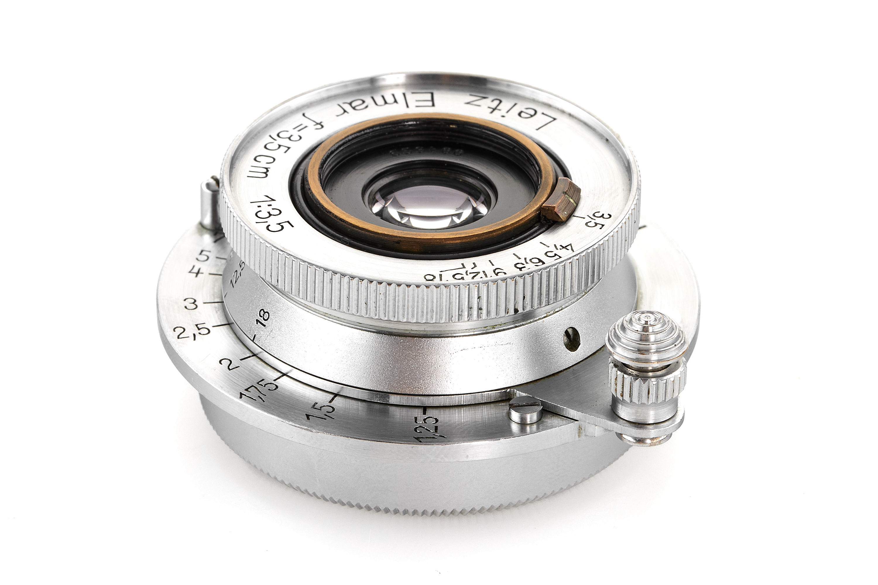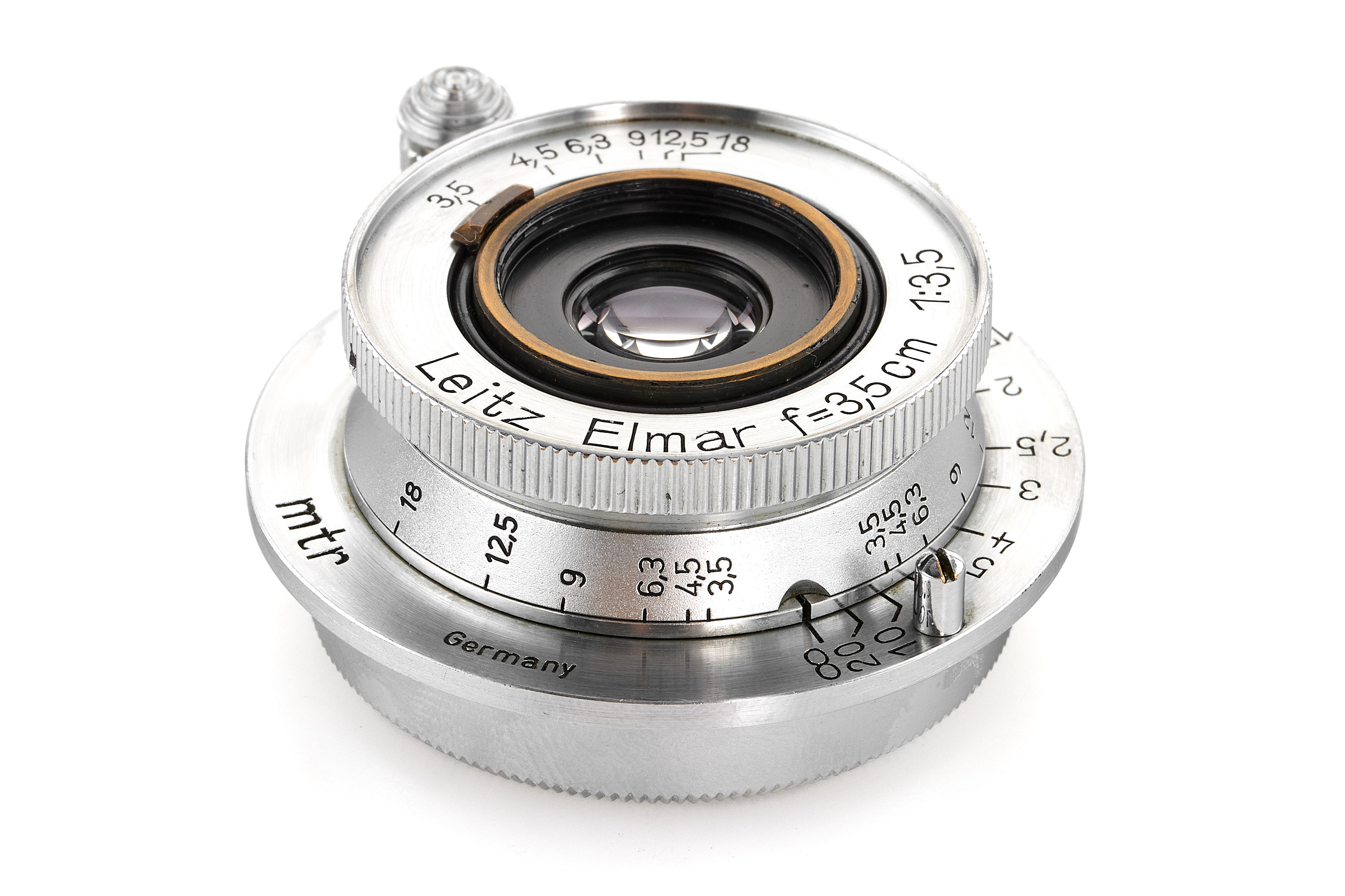 Rare-post war A36 Elmar 3.5cm in beautiful, near-mint condition, very good coated optics, with both caps and rare brown bakelite keeper.