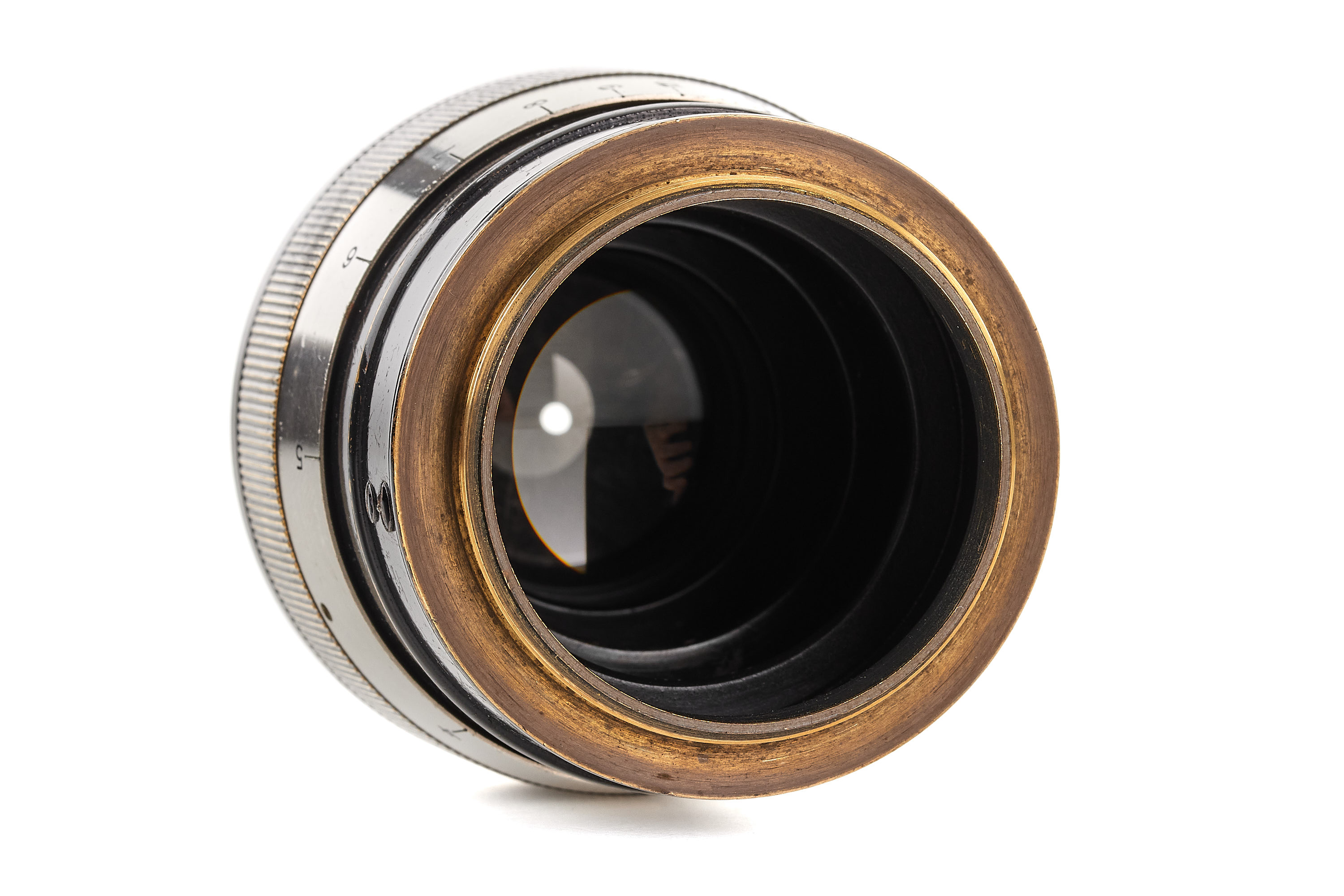 Very early unnumbered lens, not RF coupled, in good condition, uncoated optics only showing some cleaning marks, feet scale, with rear cap.