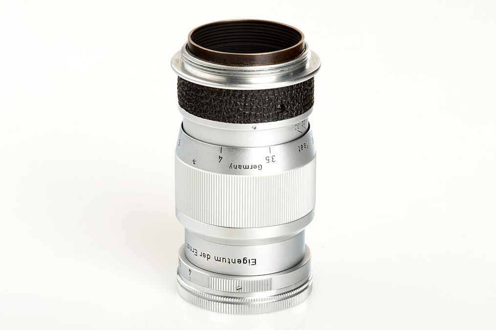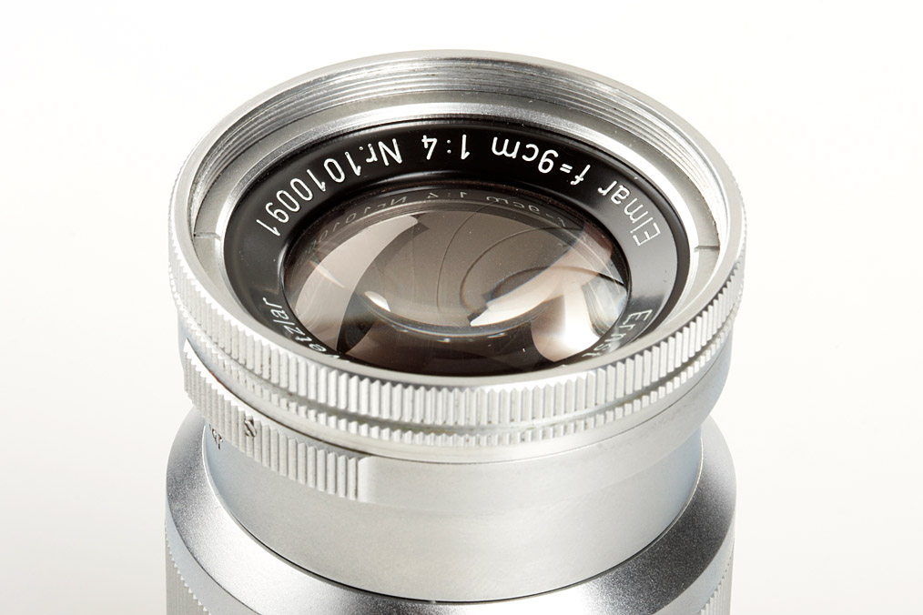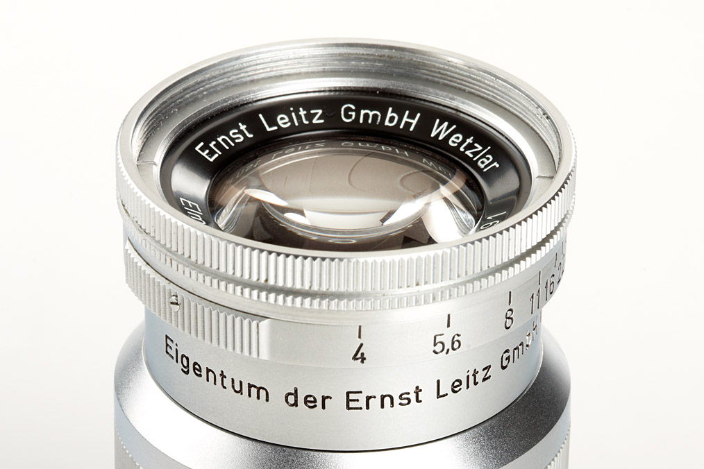 rare and unusual shaped 9cm Elmar, prototype of the 3-element Elmar engraved: "Eigentum der Ernst Leitz GmbH Wetzlar", from a small batch of approx. 50 lenses, a similar lens is illustrated in Lager II, page 126, in mint condition with keeper