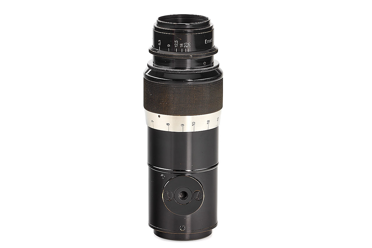 Rare unnumbered uncoupled tele-lens with standard screw mount, feet scale version in absolute mint condition, very good optics only showing few discrete cleaning marks, with front lens cap, rare short rear lens cap and early red maker's box.