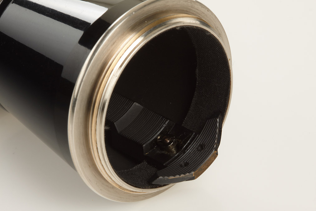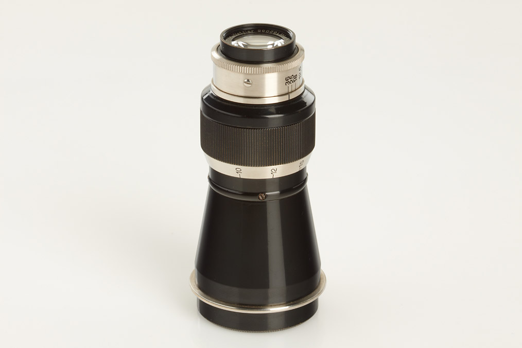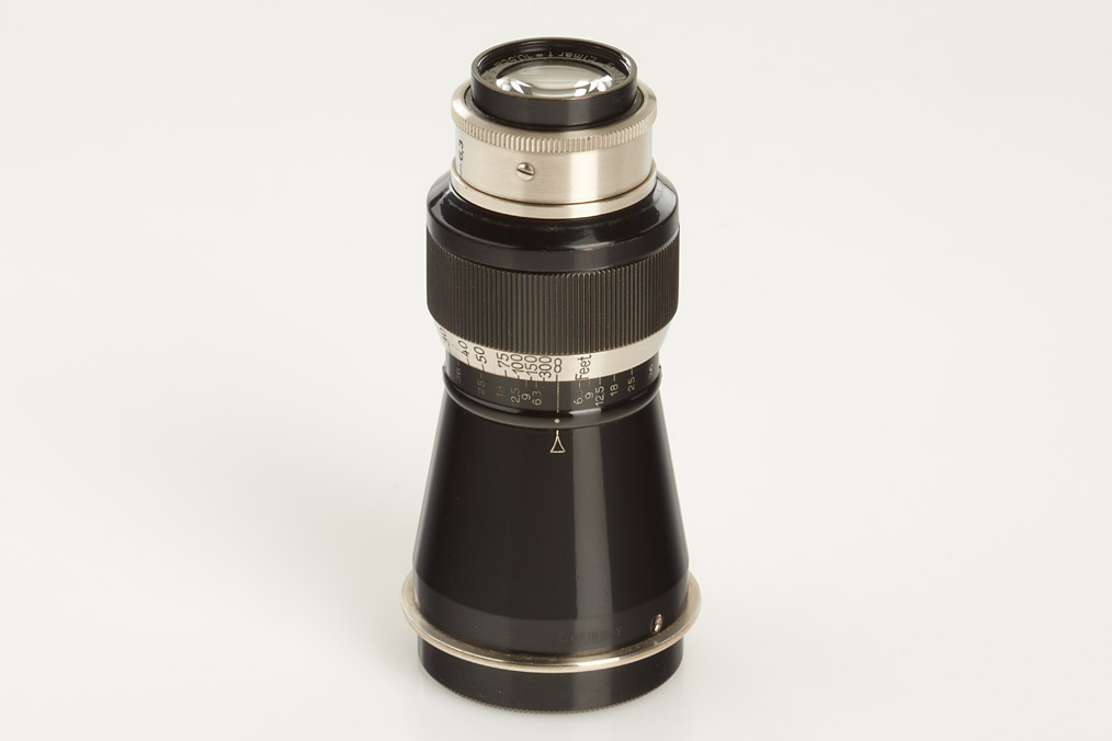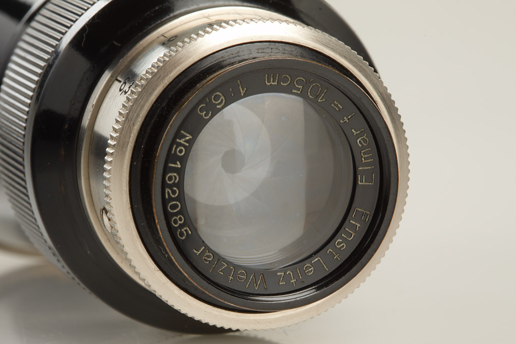 black/nickel Mountain-Elmar in beautiful condition (rear cap, hood) with original red maker's box (ELZENKUP), matching black/nickel VIDOM finder in red maker's box