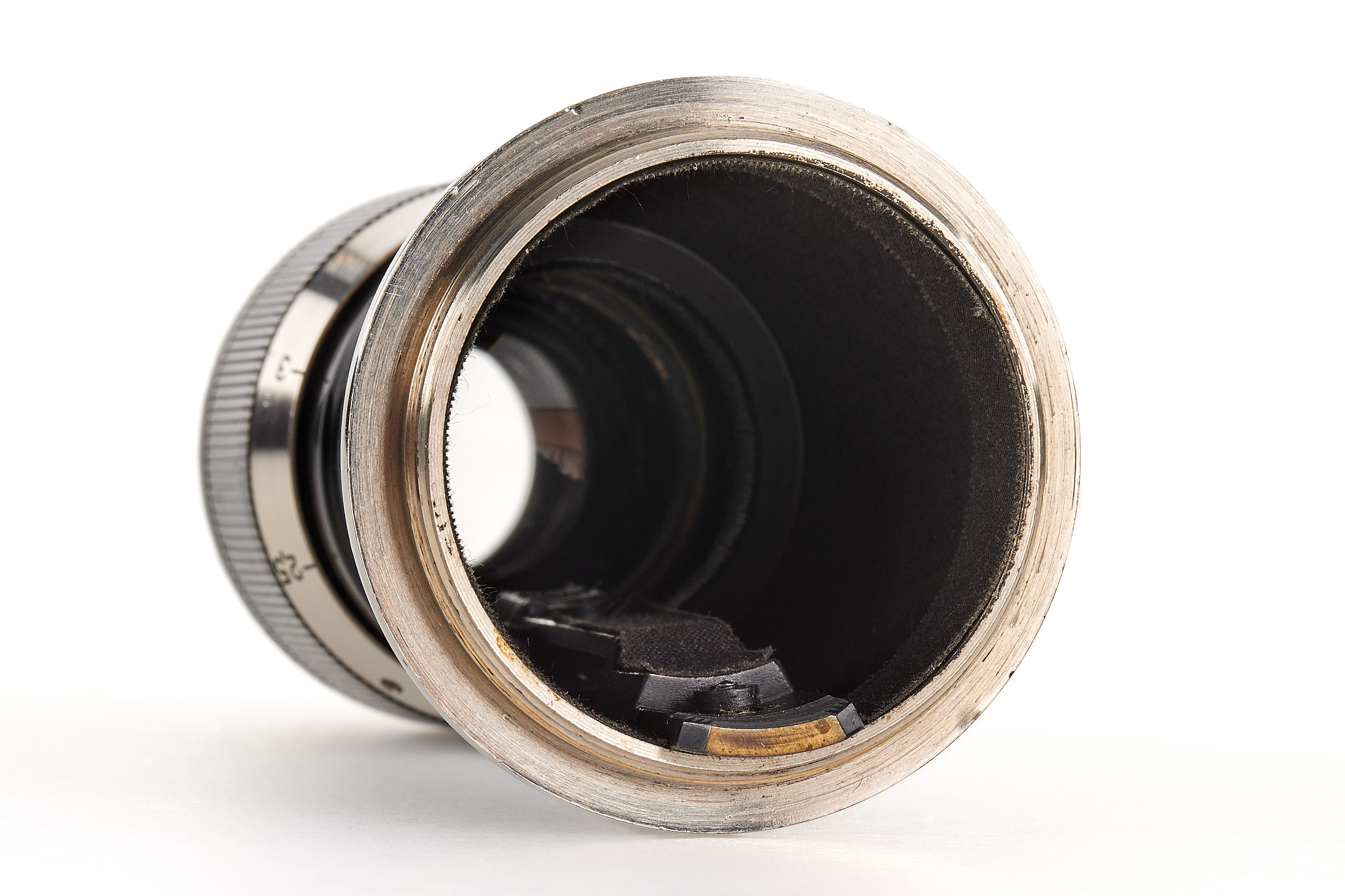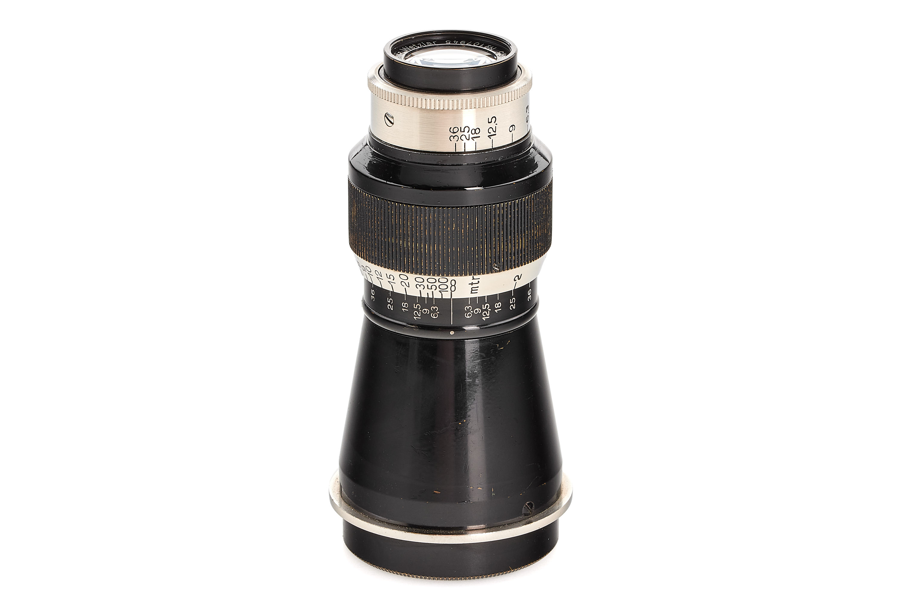 Rare and early, one of the first 'Mountain Elmar' ELZEN in black/nickel finish ever made (production starts with 107891), with meter scale, in almost mint condition, clean and clear optics, delivered to Paris on 23.06.1932, together with original FIZEN hood, both caps and maker's box.